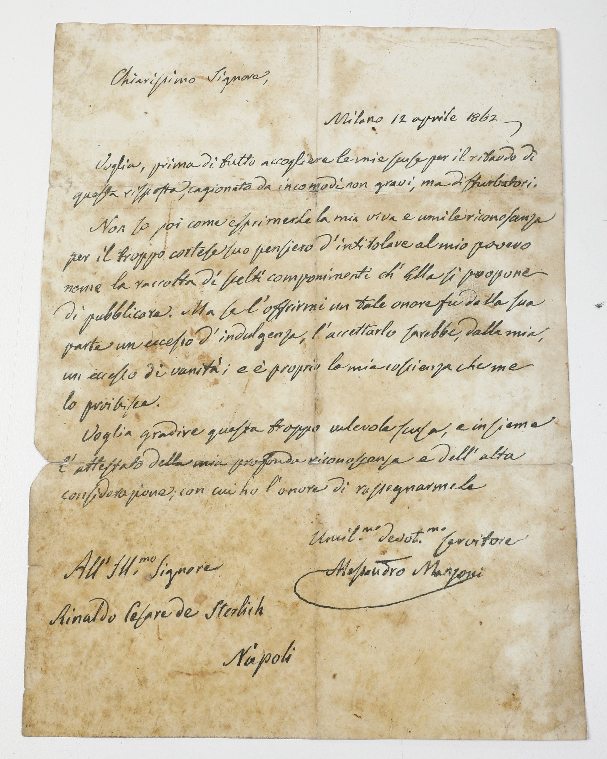 Bella lettera autografa di Alessandro Manzoni datata, Milano 12 aprile 1862 e indirizzata a Rinaldo Cesare De Sterlich - Napoli. Buona conservazione generale. Ben leggibile, tracce di piegatura del foglio. Dimensioni: 17,5x24.