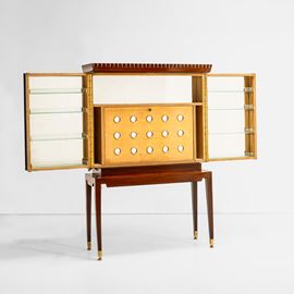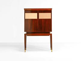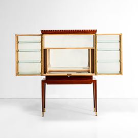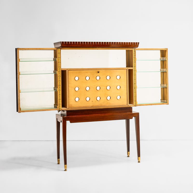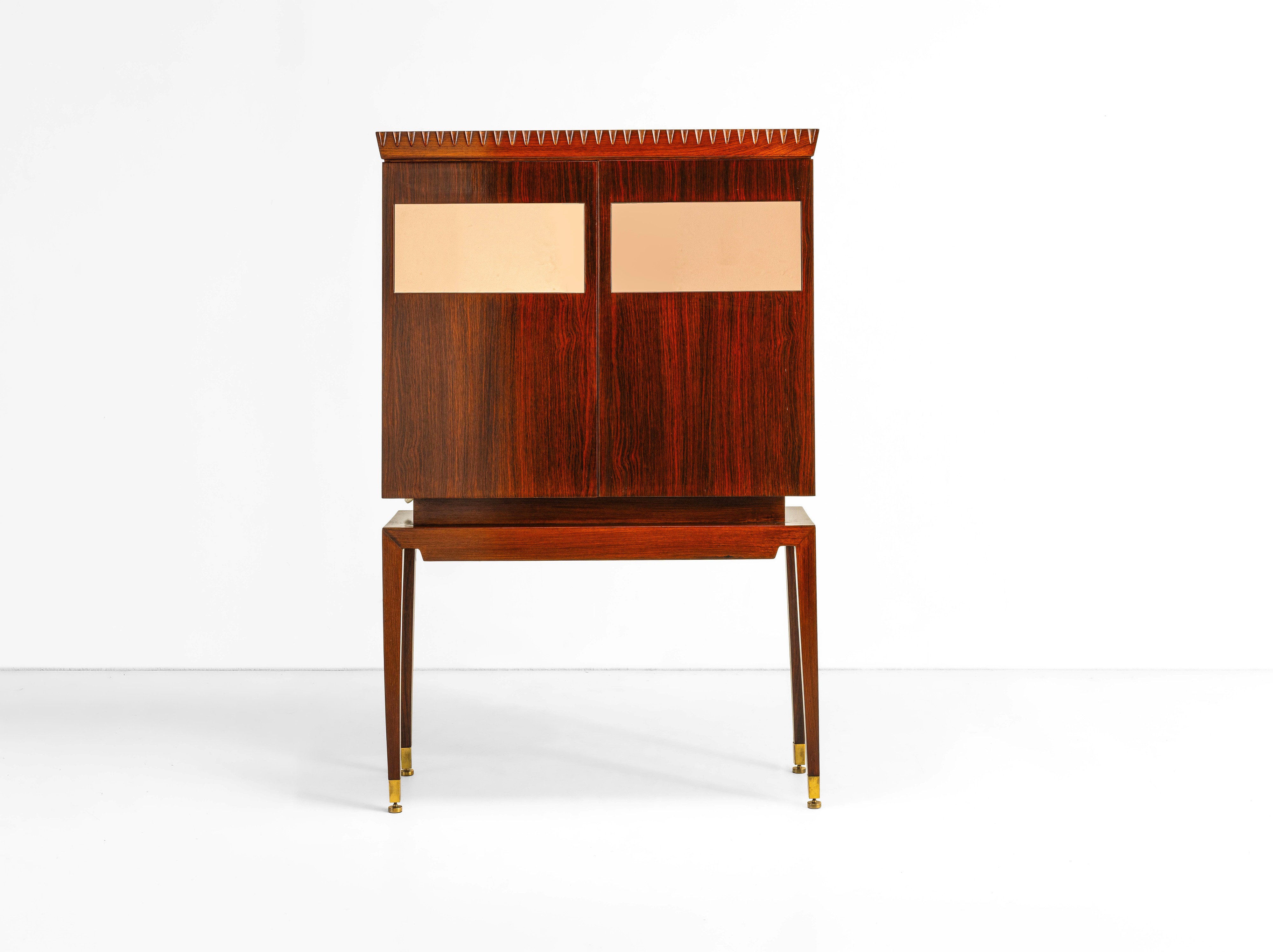 Struttura in legno, dettagli in ottone e cristallo colorato specchiato. Interni in legno e cristallo specchiato.