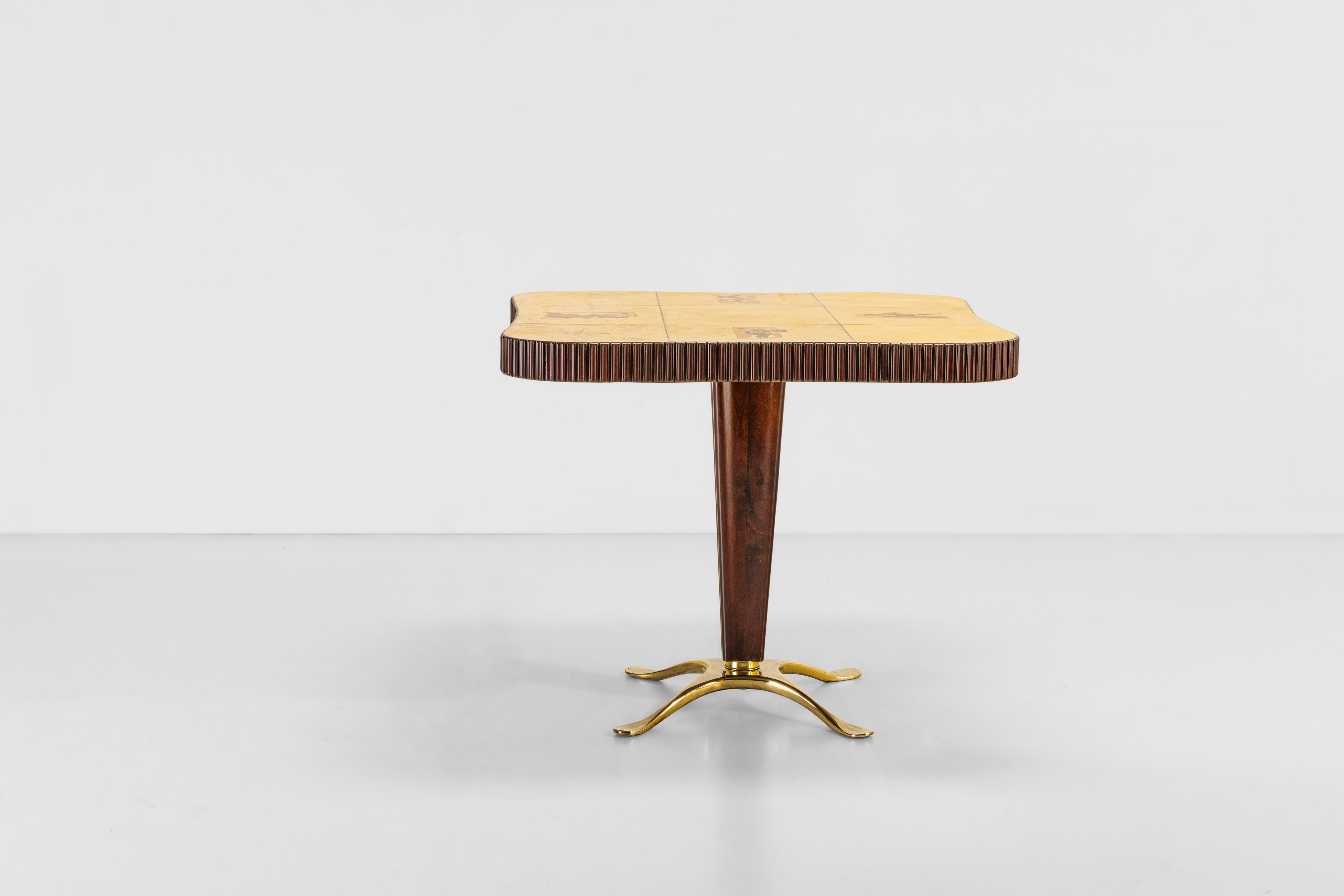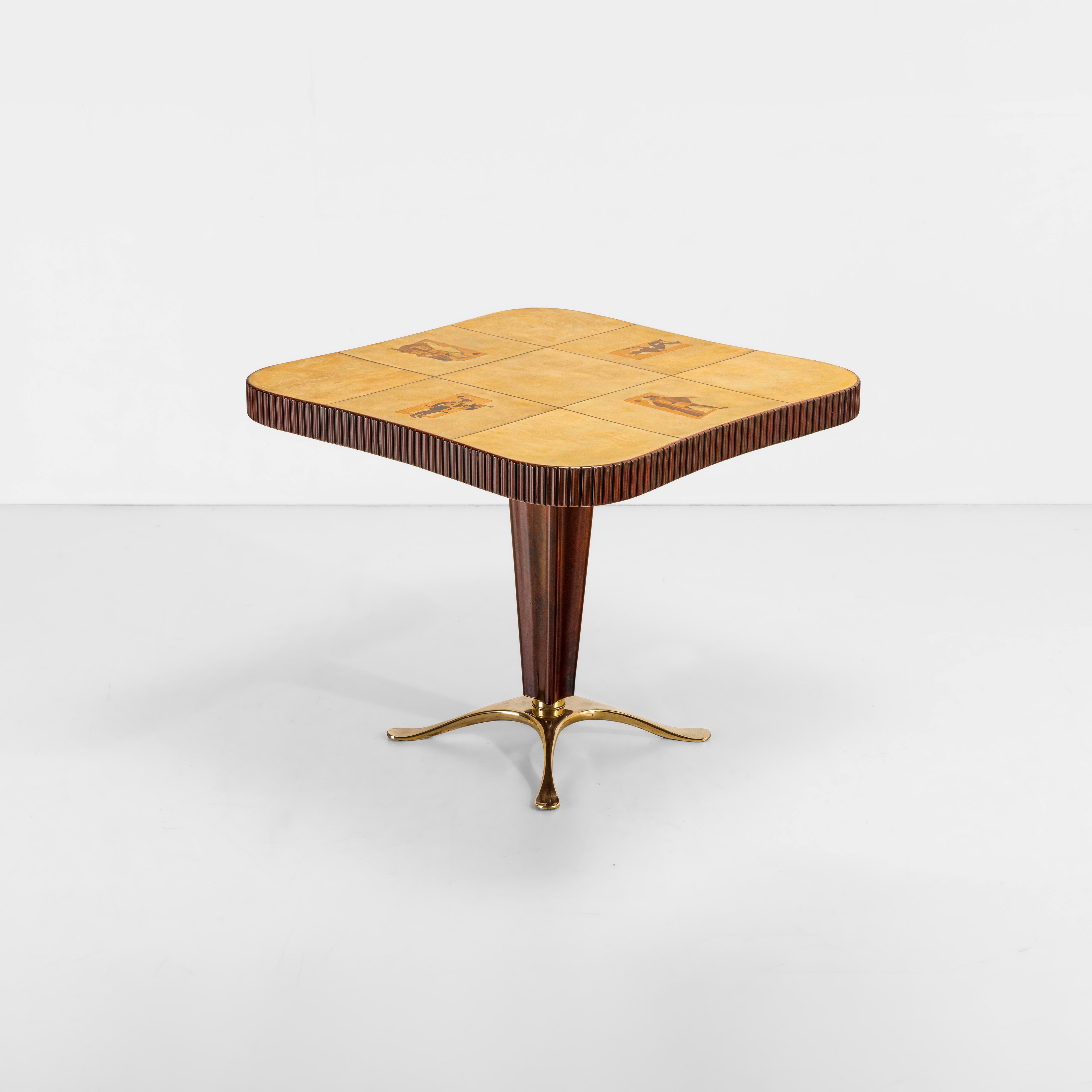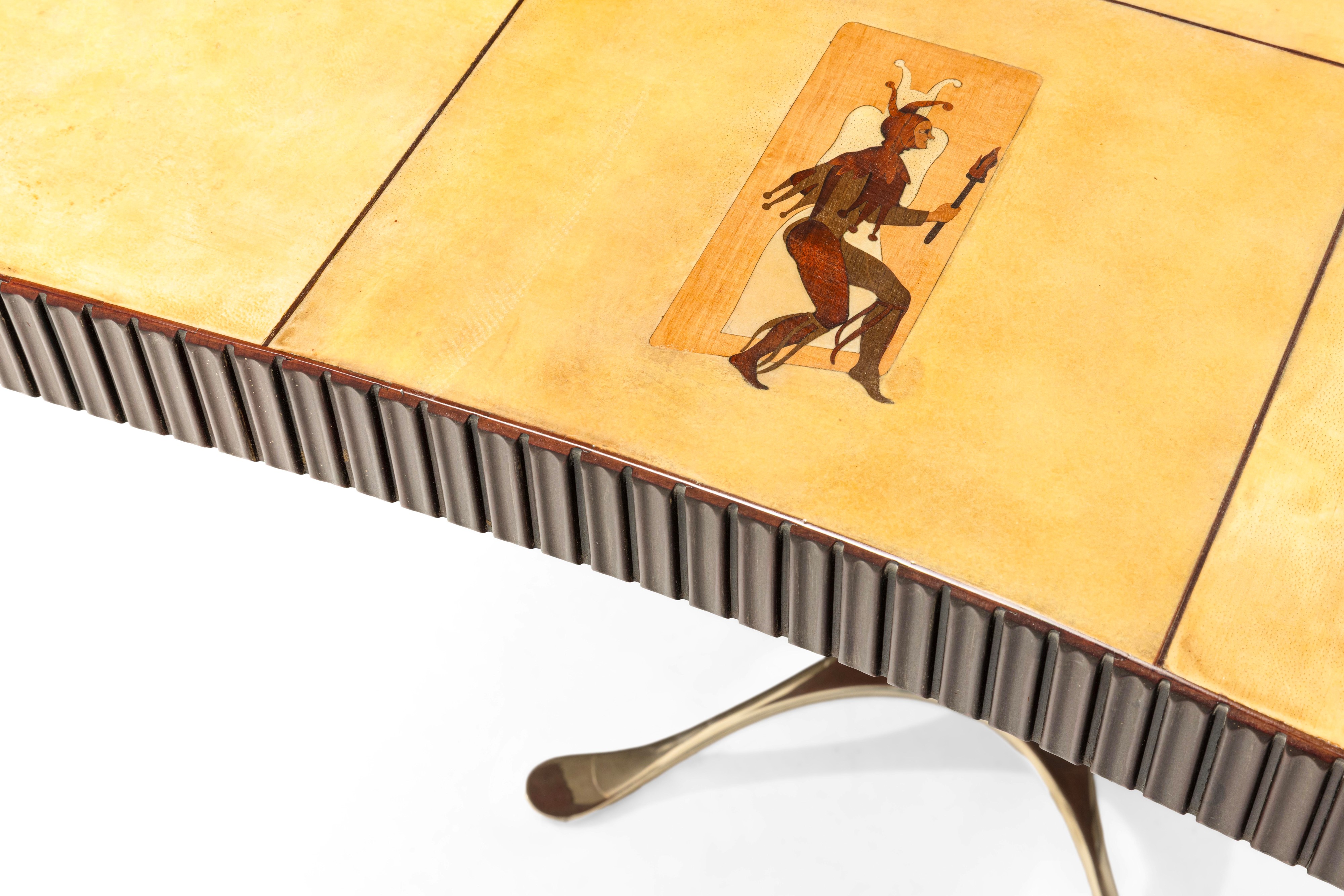 Piano in legno con profilo in legno grissinato. Rivestimento in pergamena con decoro a intarsio.