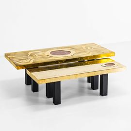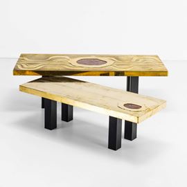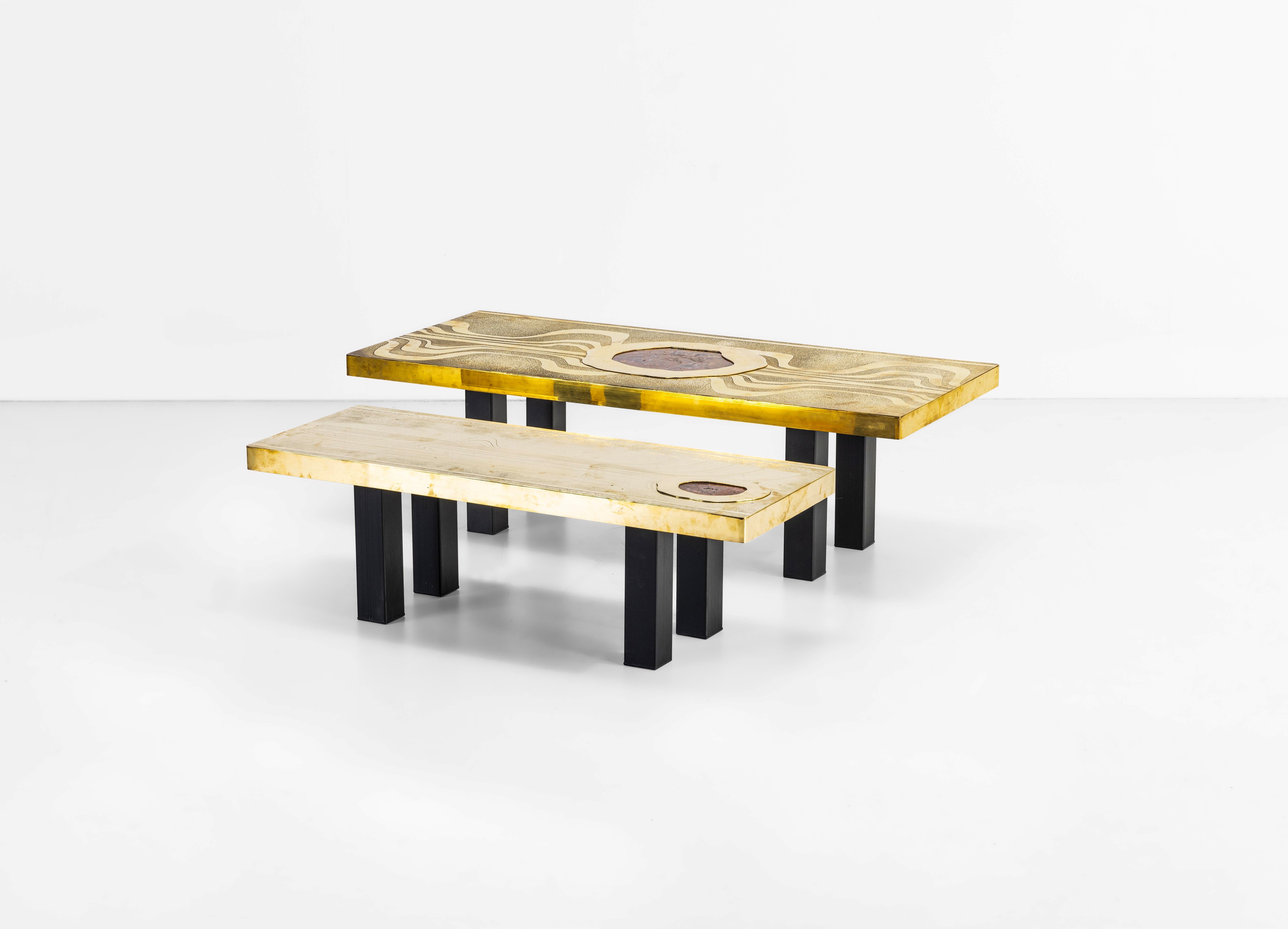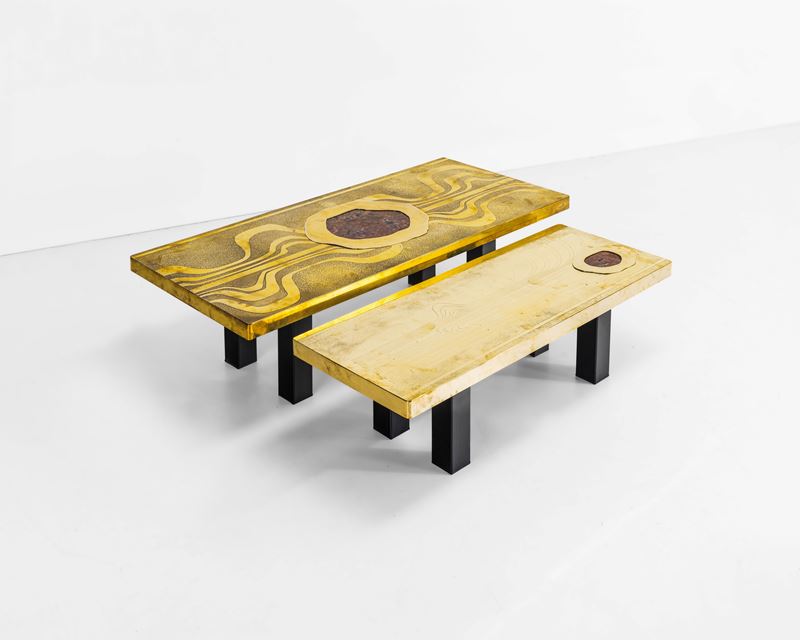 Struttura in metallo laccato, piani in ottone. Elementi decorativi in pietra dura.