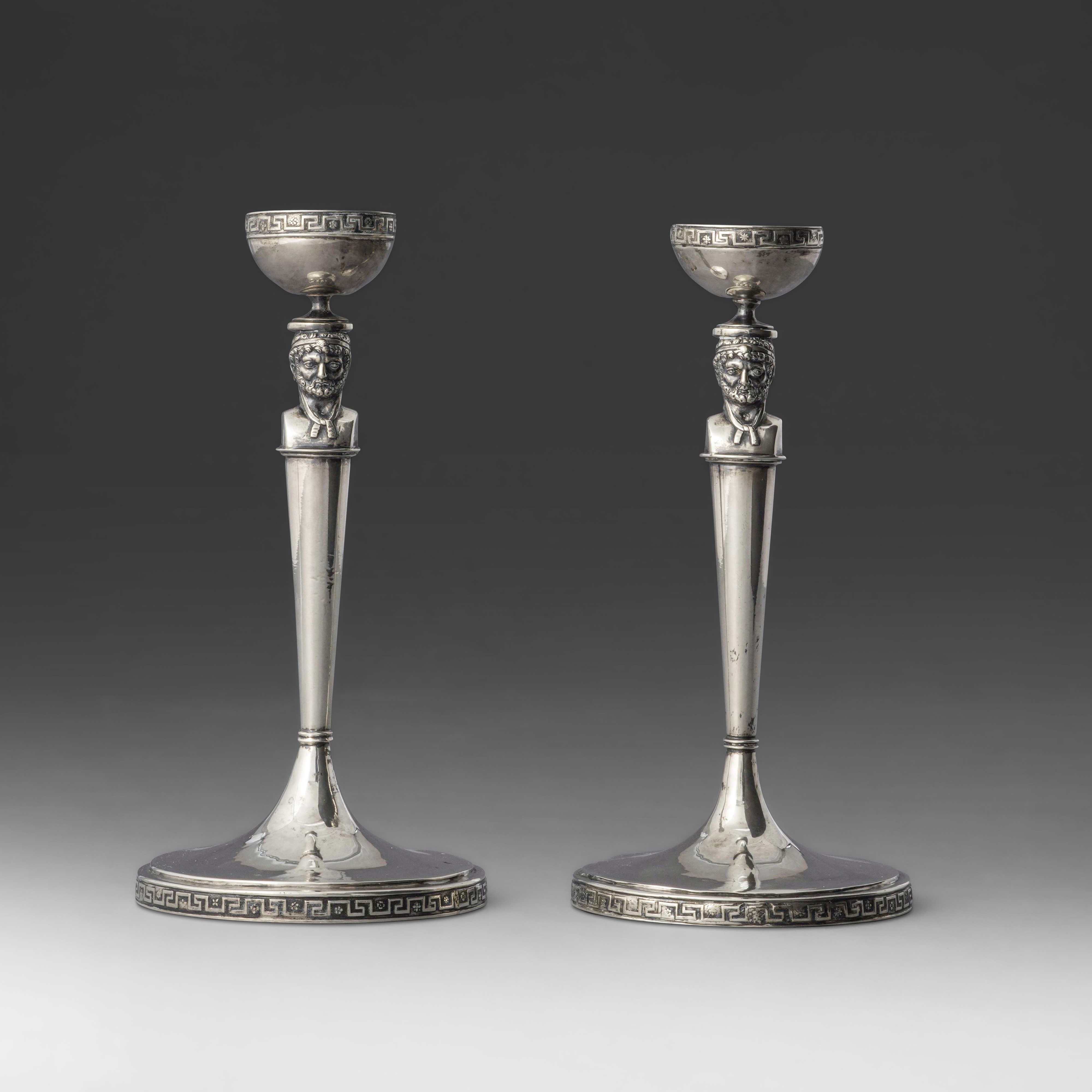 Silver candlesticks with double-faced herms, Rome, 1800s