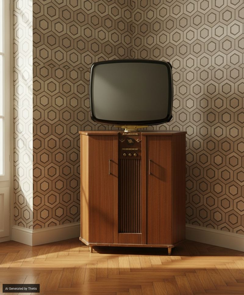 Tv a forma di mobile bar a pianta esagonale, con due sportelli laterali per bottiglie e bicchieri e centralmente altoparlante e comandi del TV. Lo schermo è girevole e montato al di sopra del mobile, sullo stile del famoso "Philco Predicta".