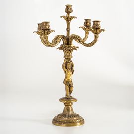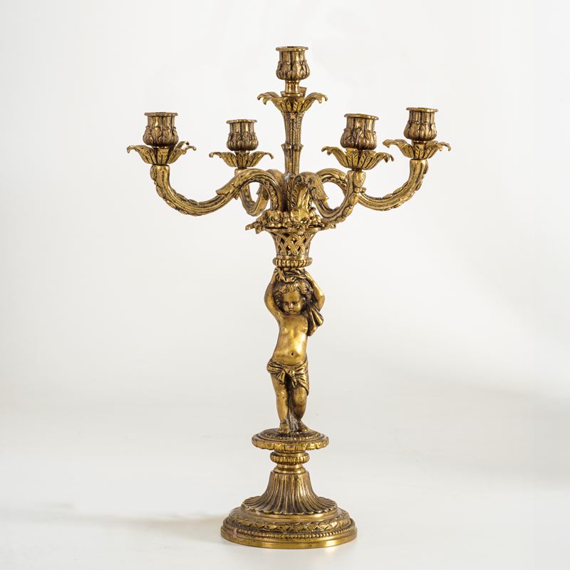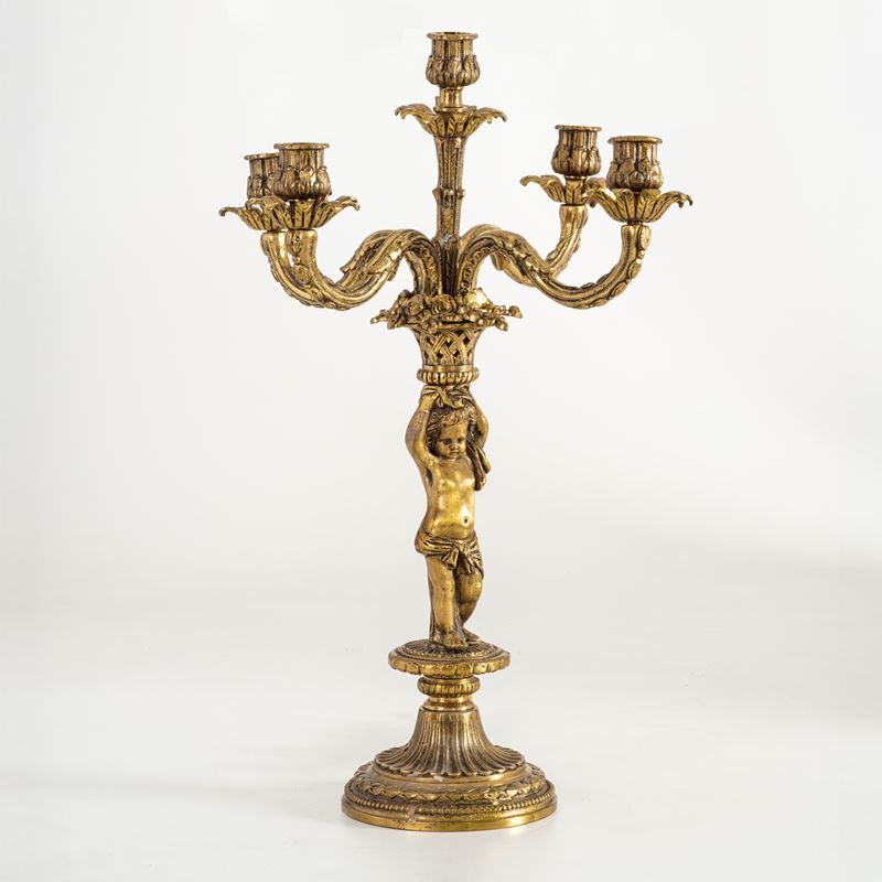 Candelabro dorato fuso e cesellato a 5 luci con base circolare