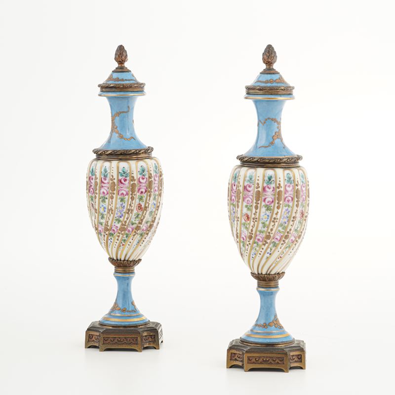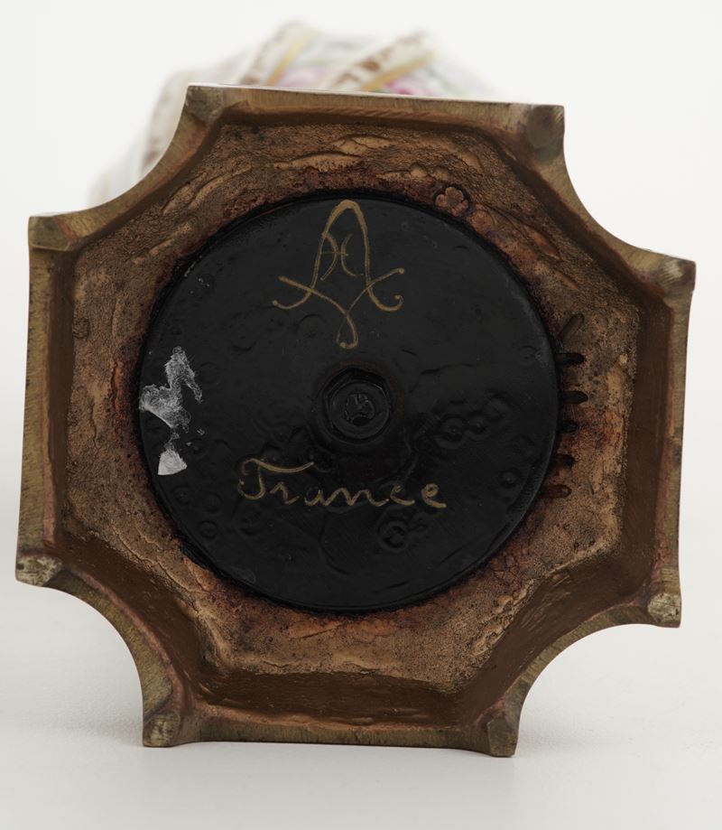 Porcellana policroma, ghiere e basi in bronzo. Marca: pseudo marca di Sèvres. Altezza cm 32. Conservazione: un vaso rotto in più frammenti.