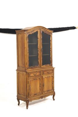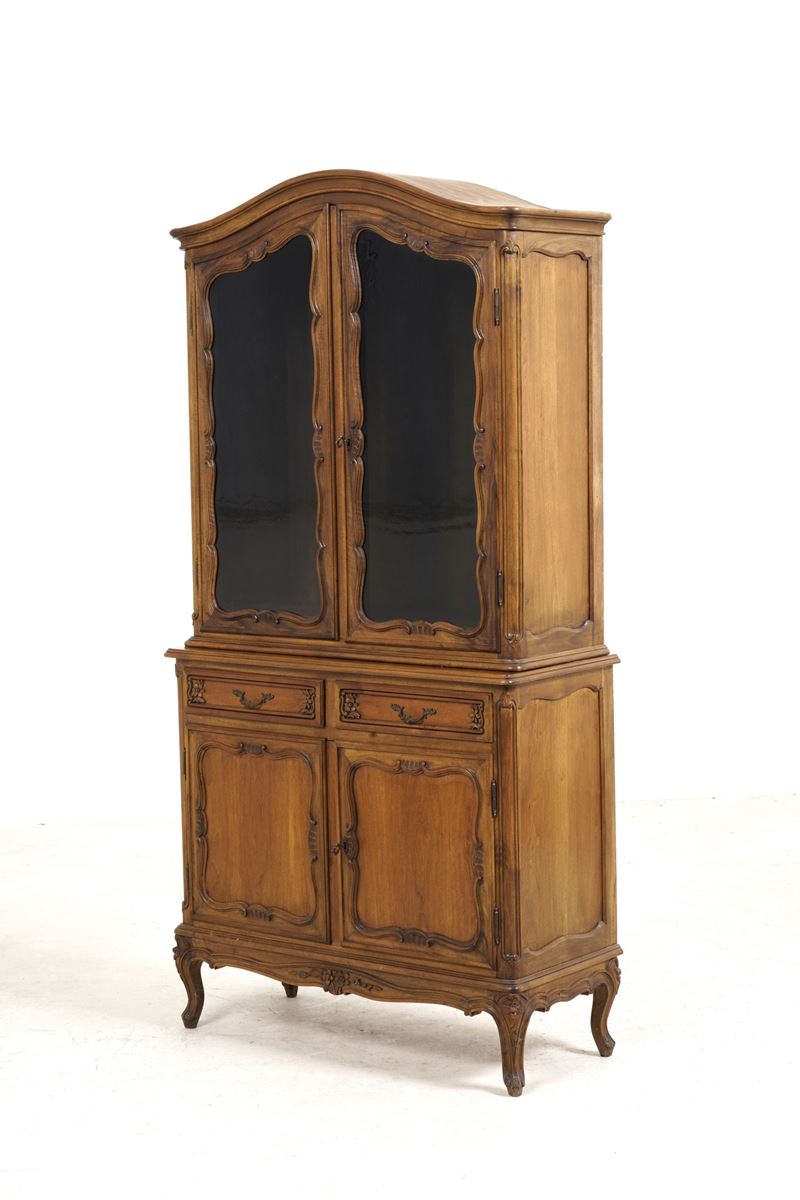 A due ante e due cassettini pannellati, alzata con vetrina a due ante sagomate, profili mistilinei, piedi mossi