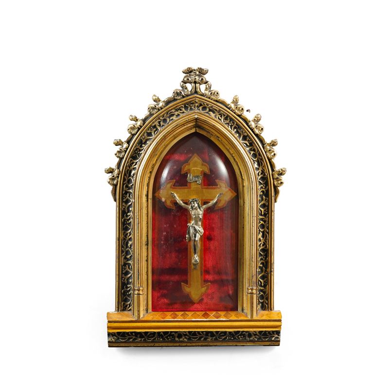 Crocifisso in metallo argentato entro teca neogotica. XX secolo