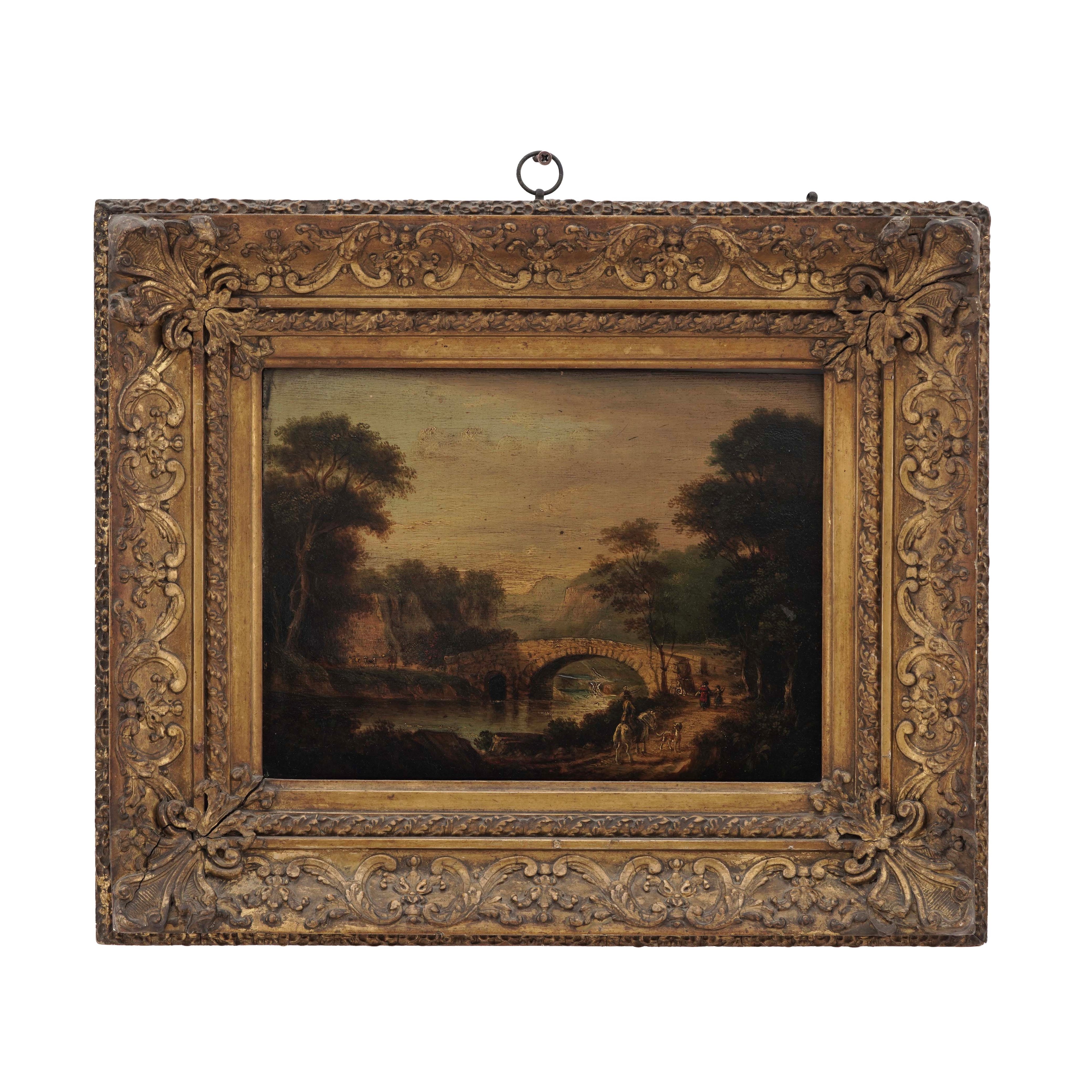 Scuola nord europea del XIX secolo Paesaggio fluviale con ponte e viandanti