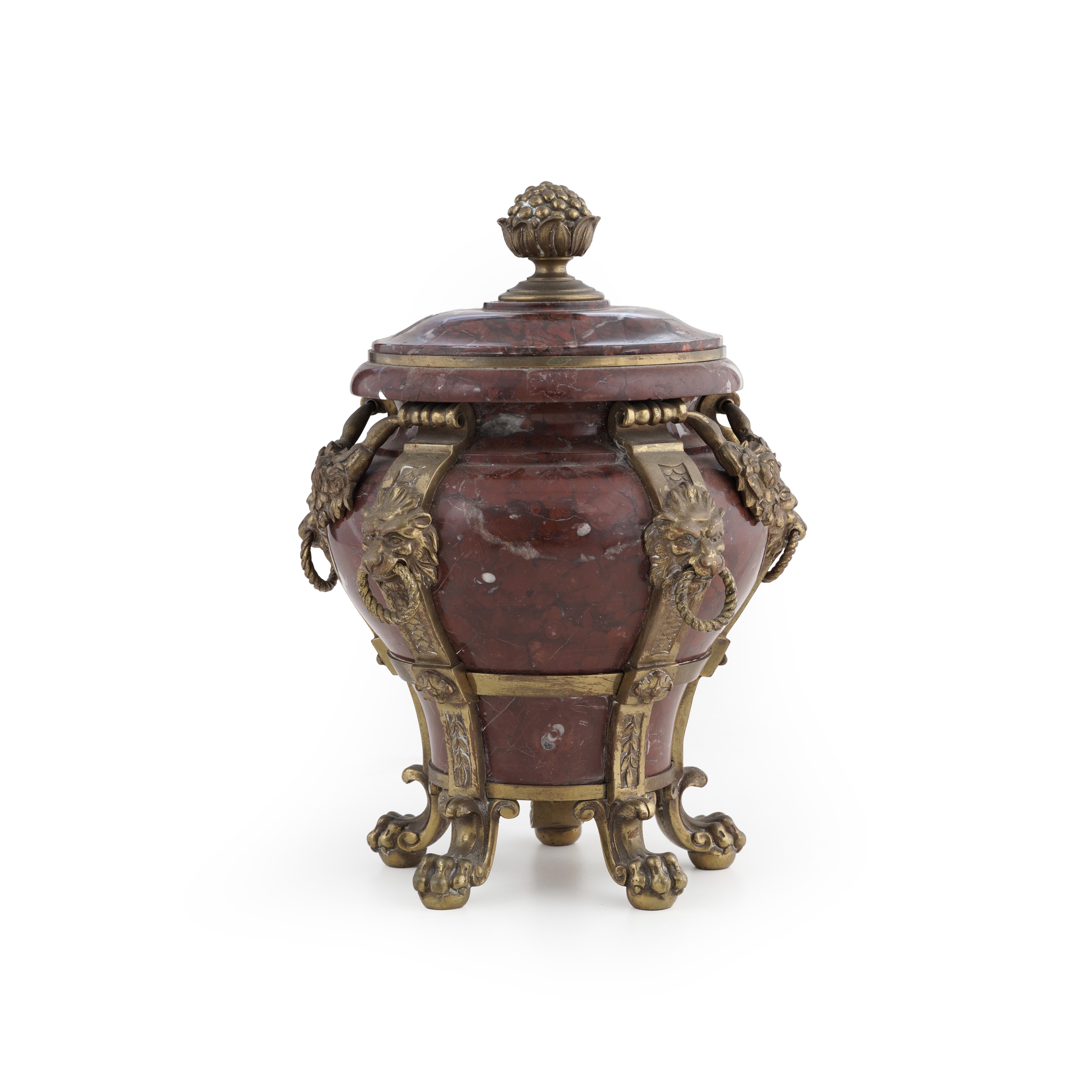 Vaso con coperchio in marmo rosso con applicazioni in bronzo dorato. Francia, stile Luigi XVI, XIX secolo