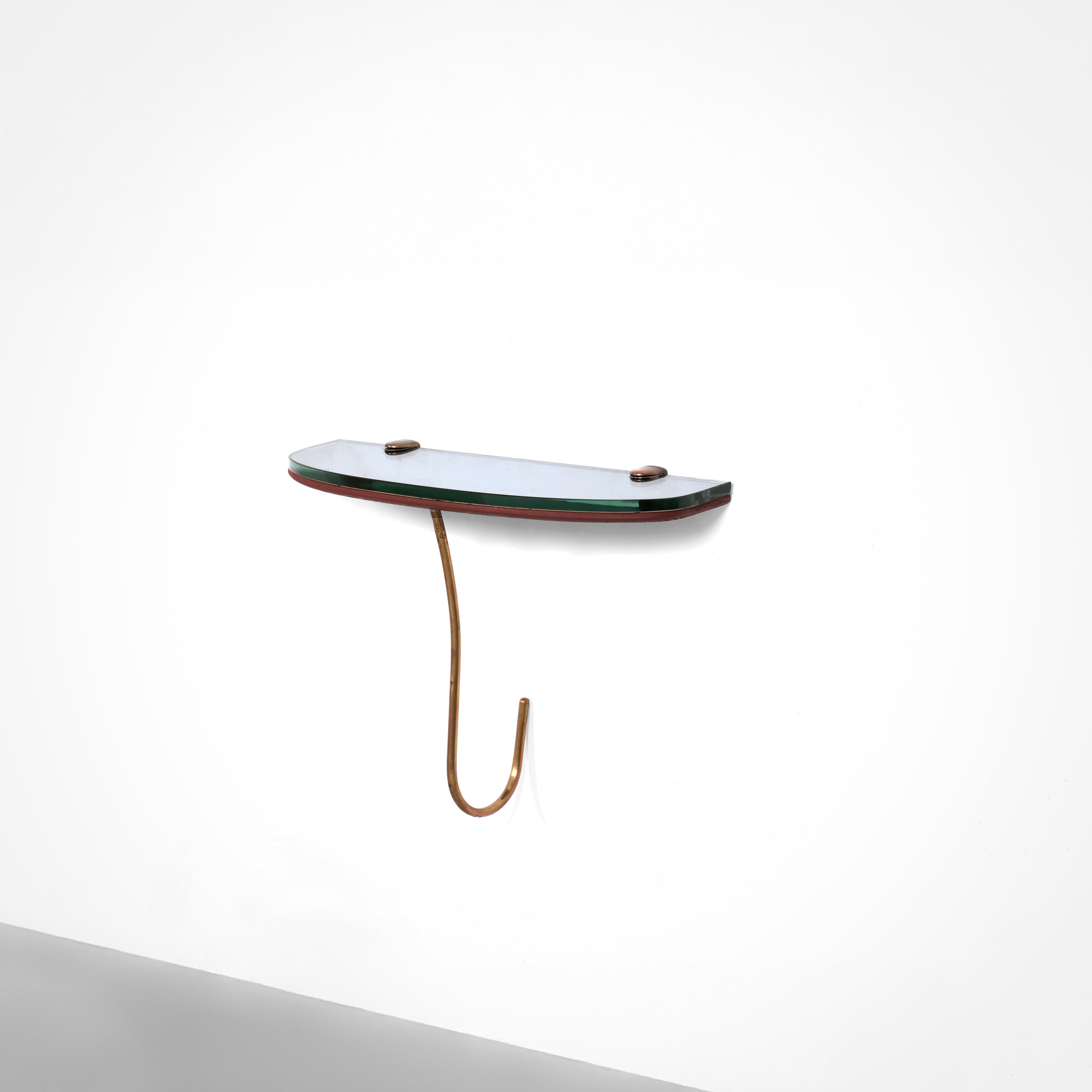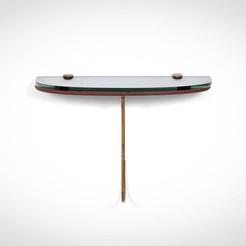 Struttura in legno e ottone con piano in cristallo molato.