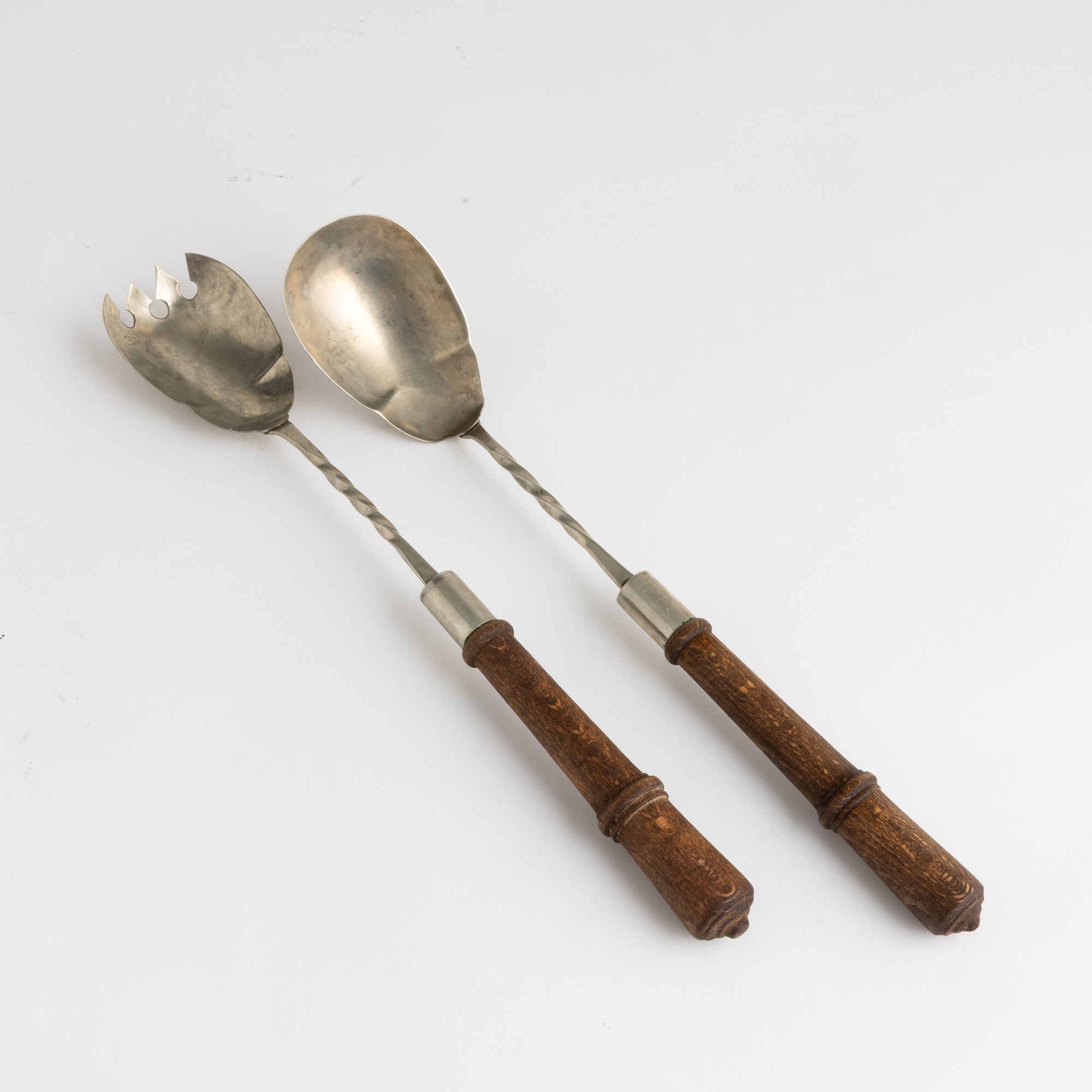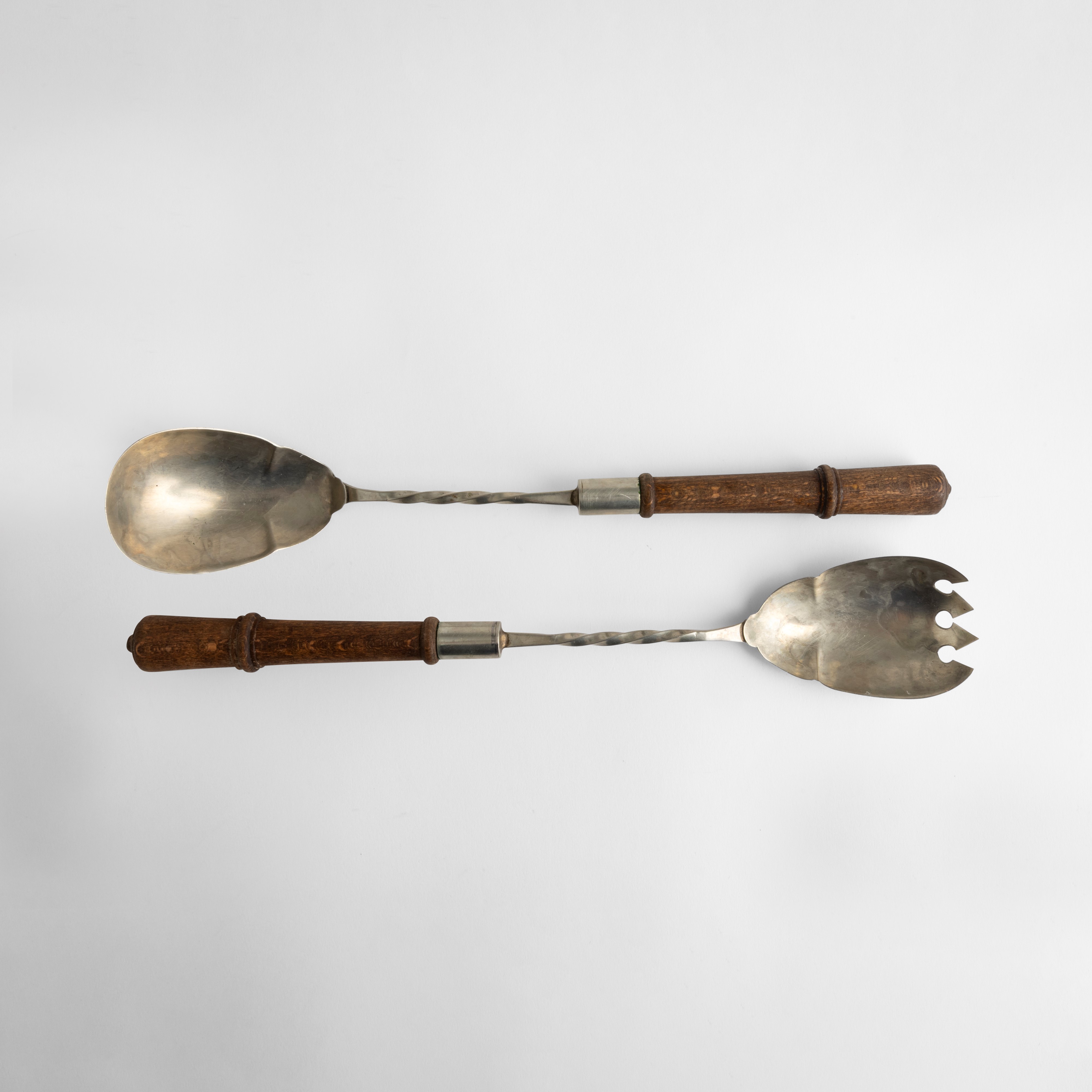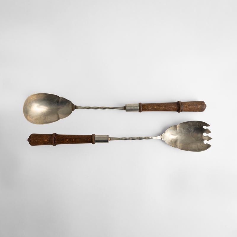 Metallo argentato con manici in legno tornito.