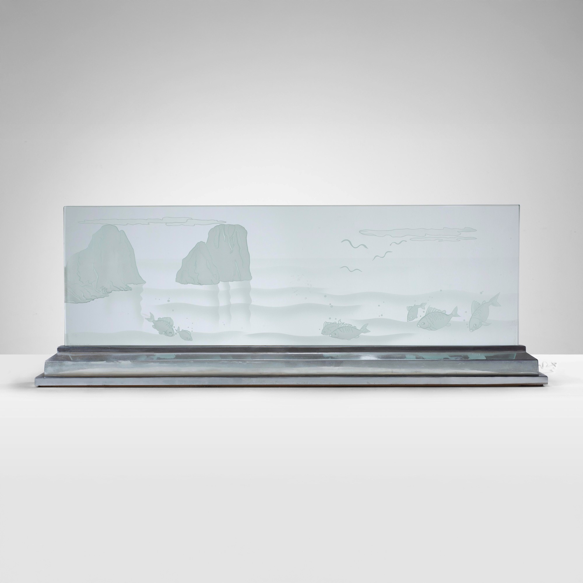 Base in metallo cromato e diffusore composto da una lastra in vetro inciso.