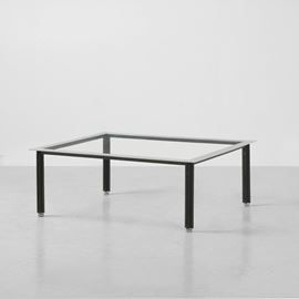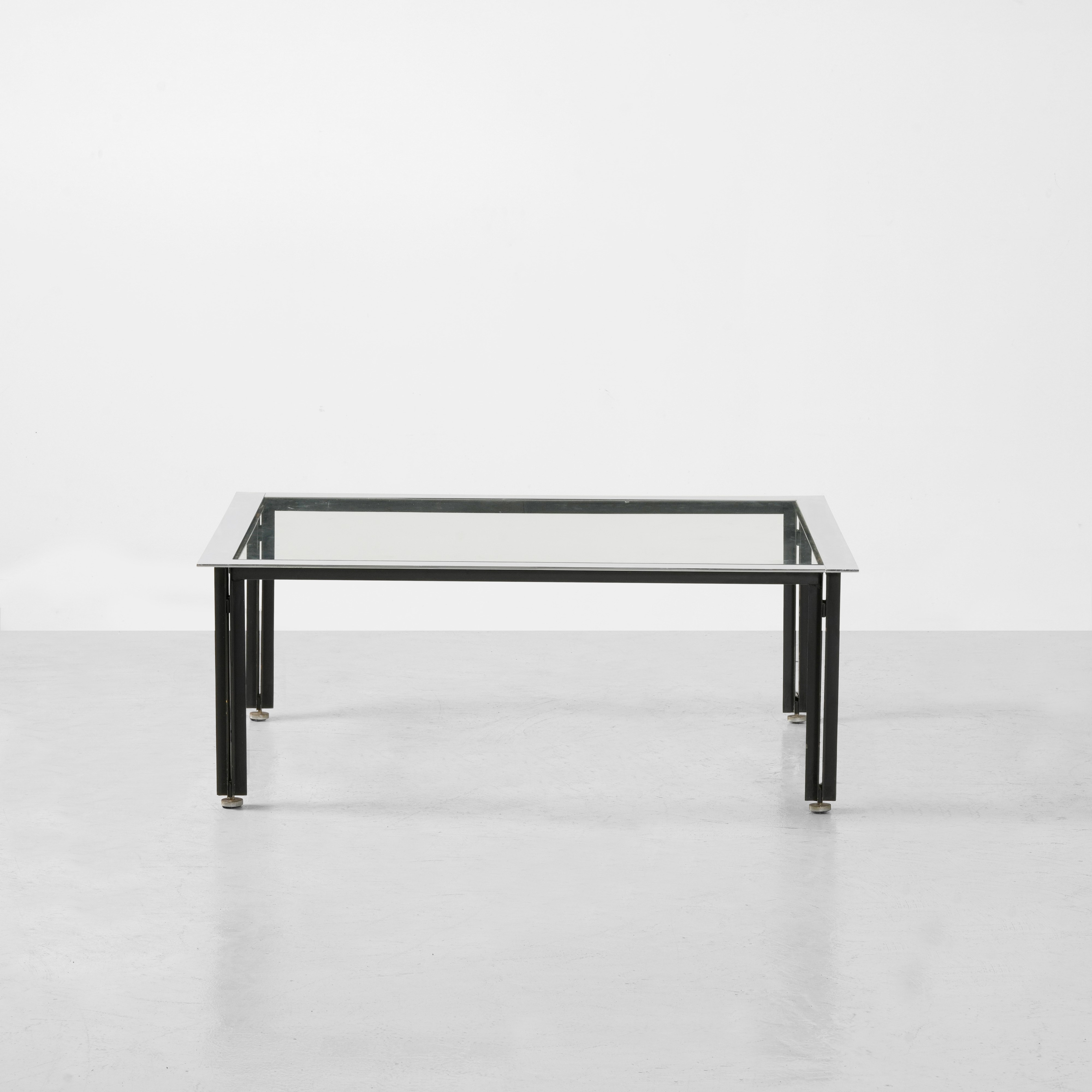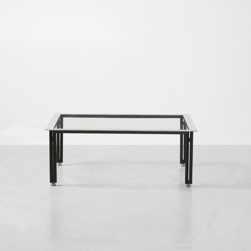 Struttura in metallo laccato e acciaio con piano in vetro colorato.
