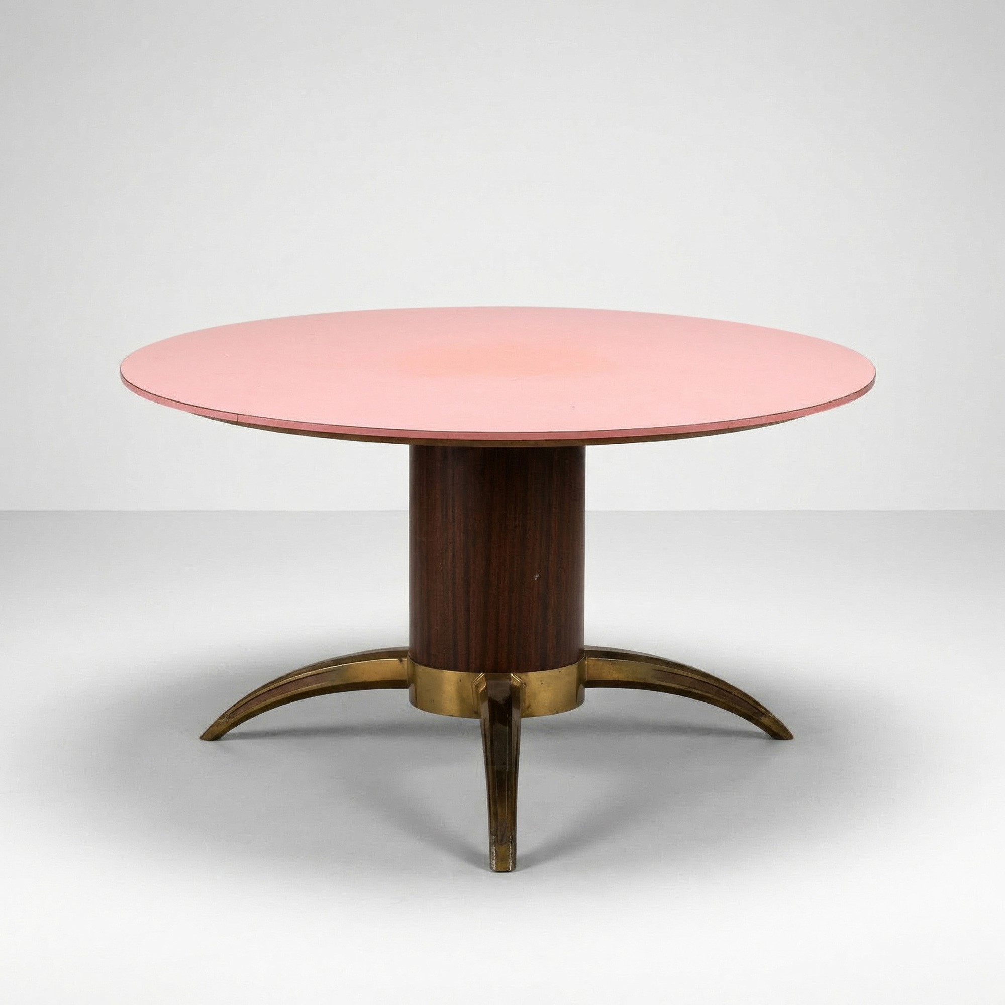 Struttura in legno impellicciato, sostegni in ottone e piano in laminato.