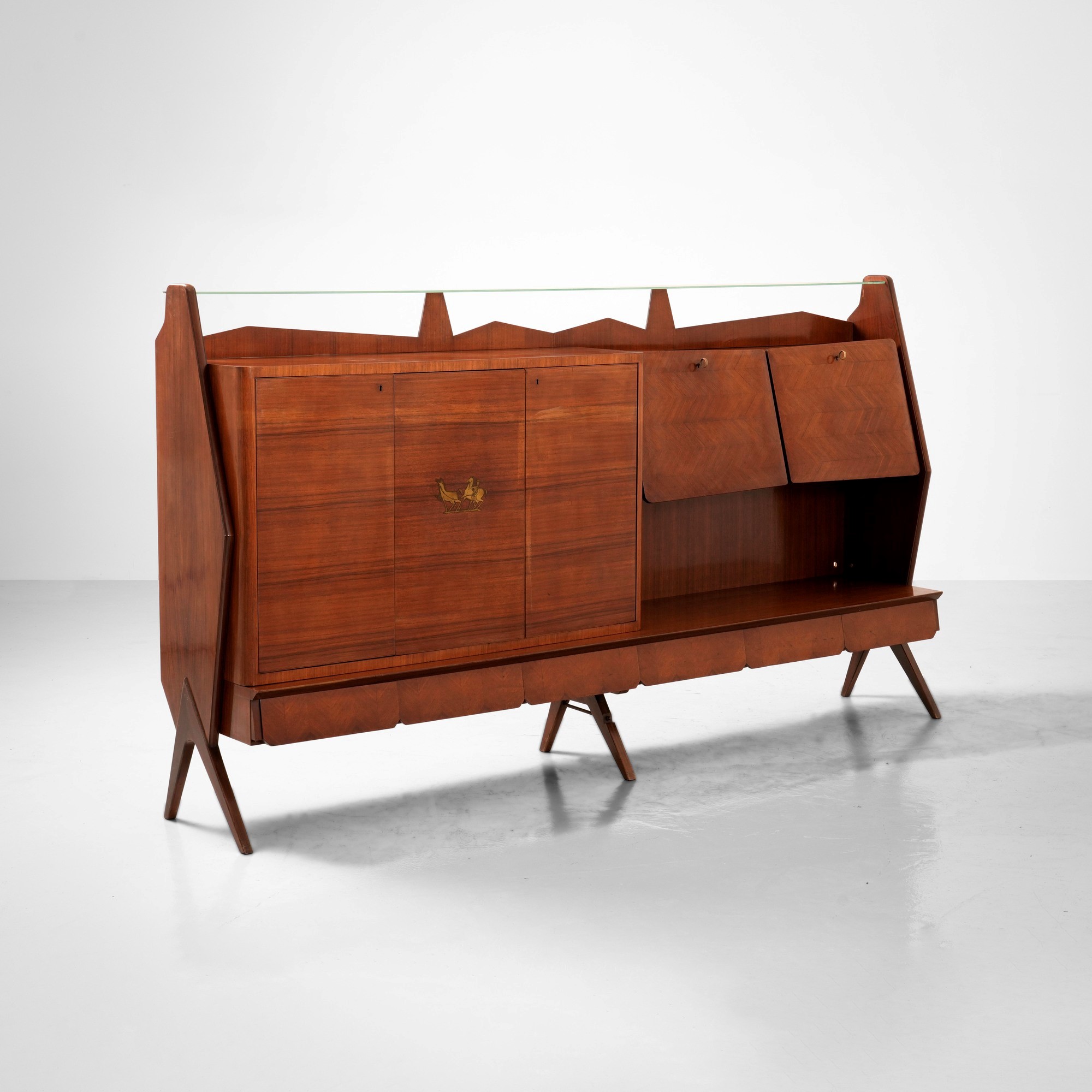 Struttura in legno e legno impiallacciato, dettagli in ottone e ripiano in vetro.