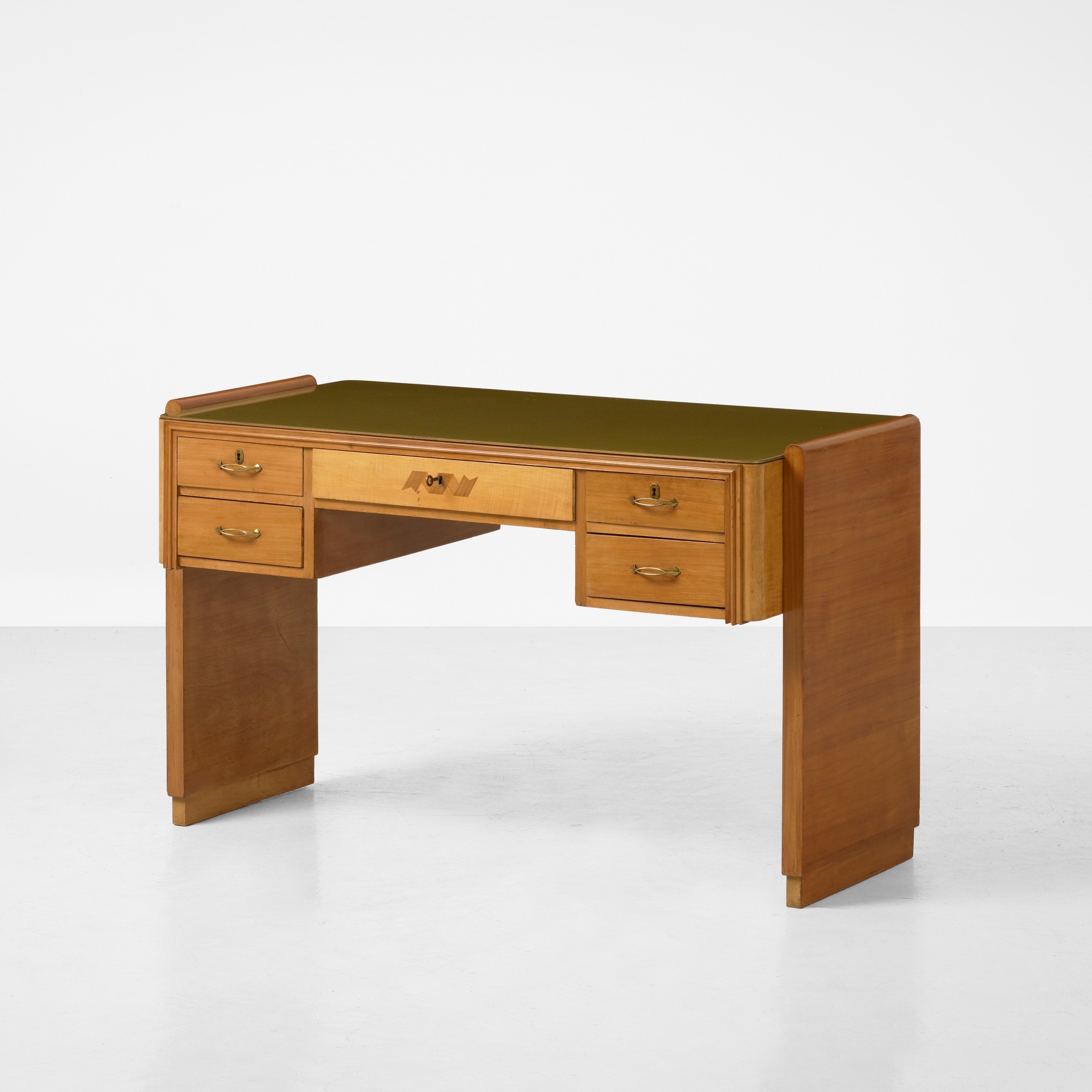 Struttura e cassetti in legno impiallacciato. Piano in vetro colorato e maniglie in ottone.