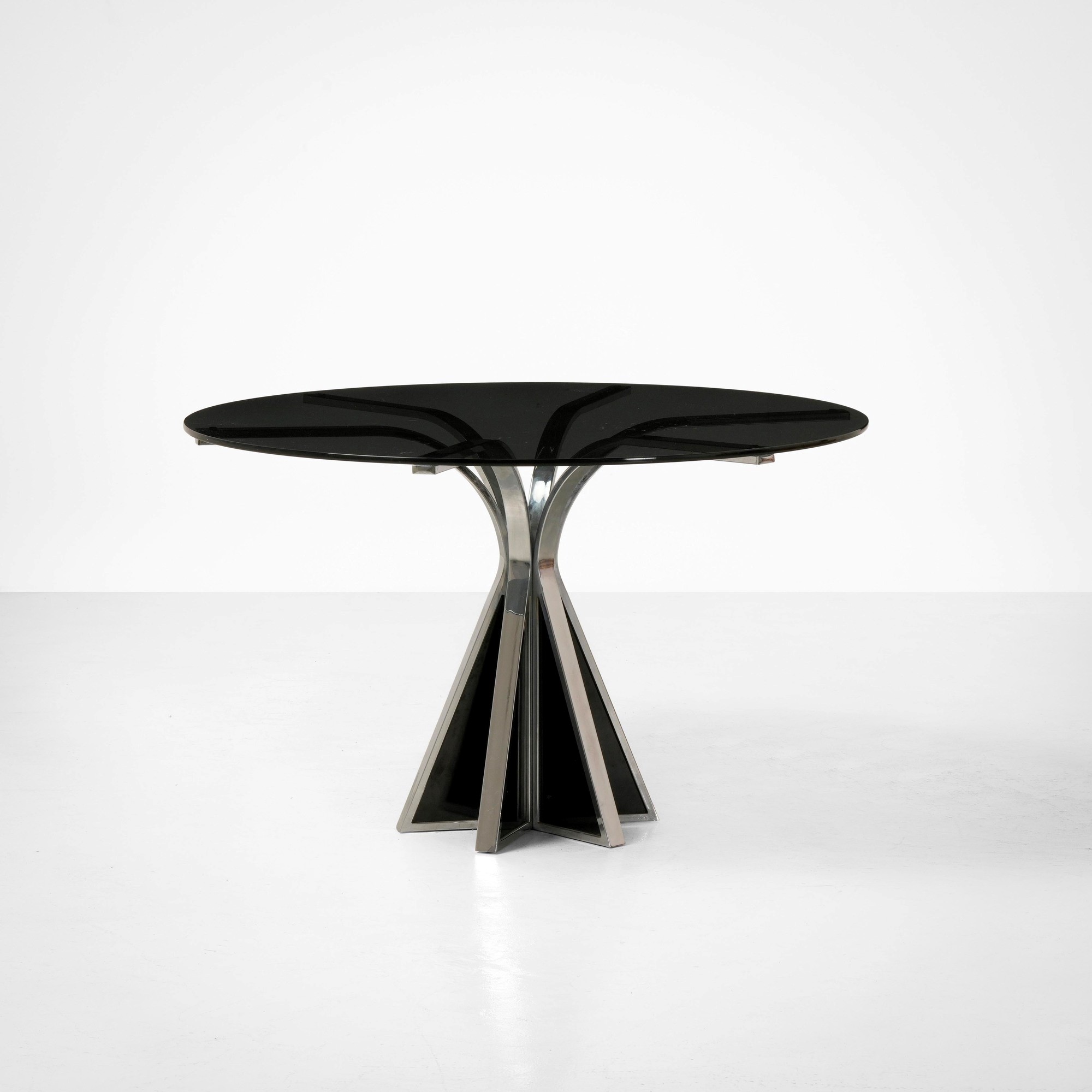 Sostegni in metallo cromato e dettagli in laminato, piano in vetro colorato.