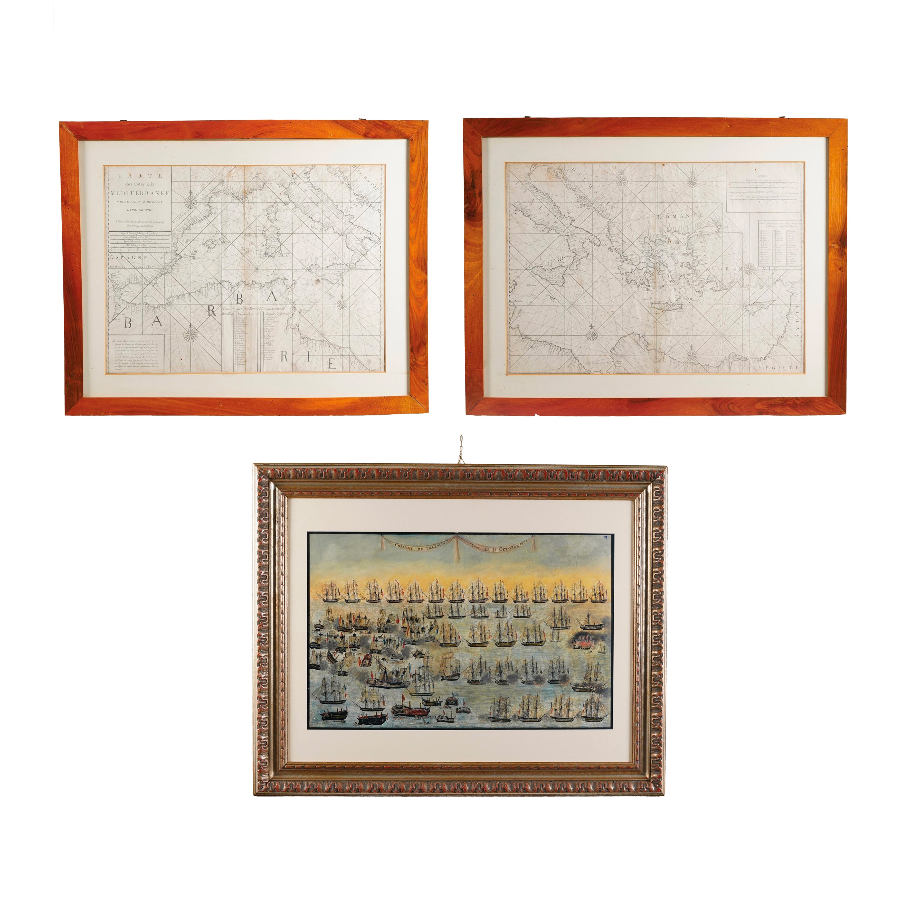 Due stampe carte geografiche e stampa “Combattimento di Trafalgar”