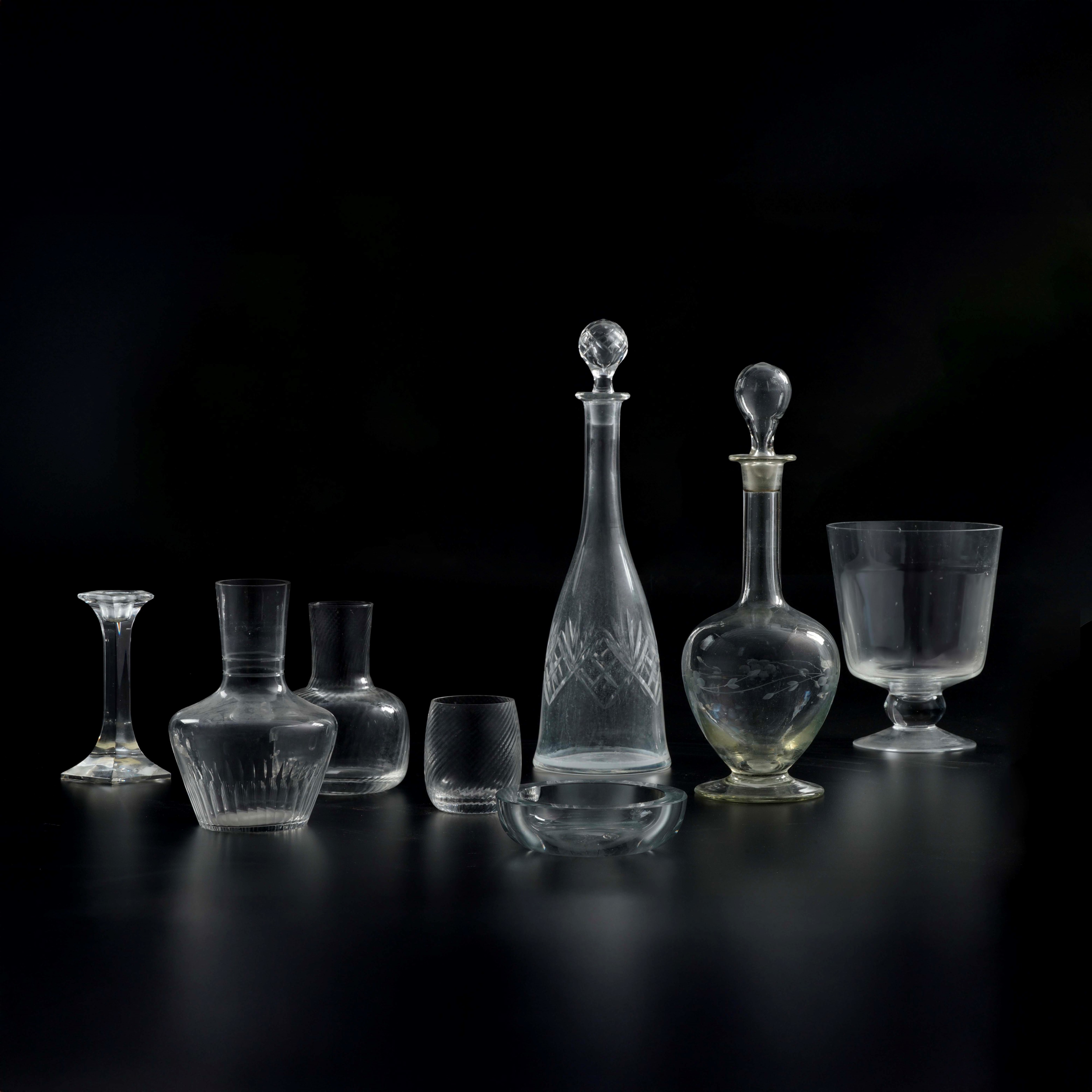 Comprende due bottiglie con tappo, un vaso, due caraffe, un candeliere, una ciotola e un bicchiere