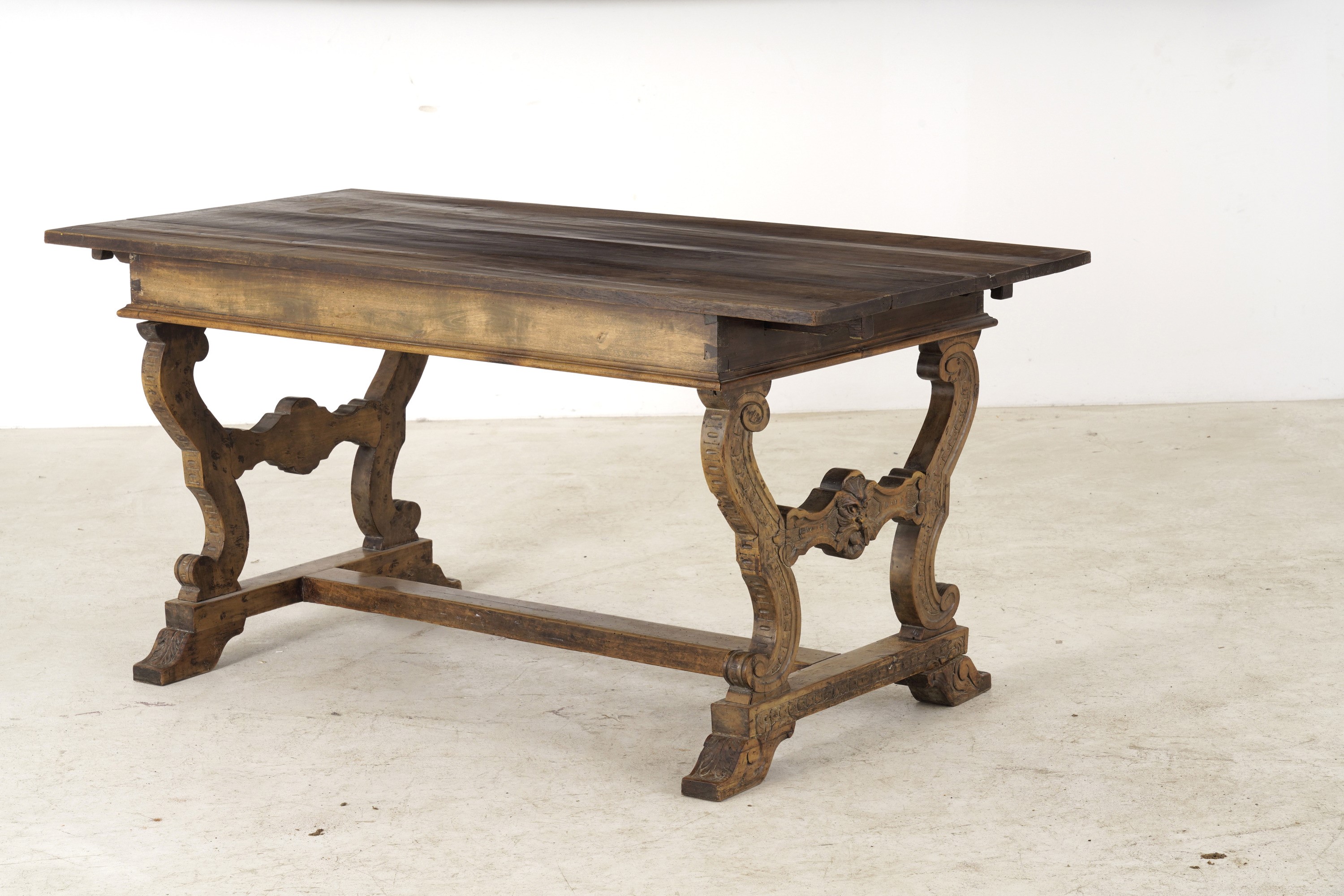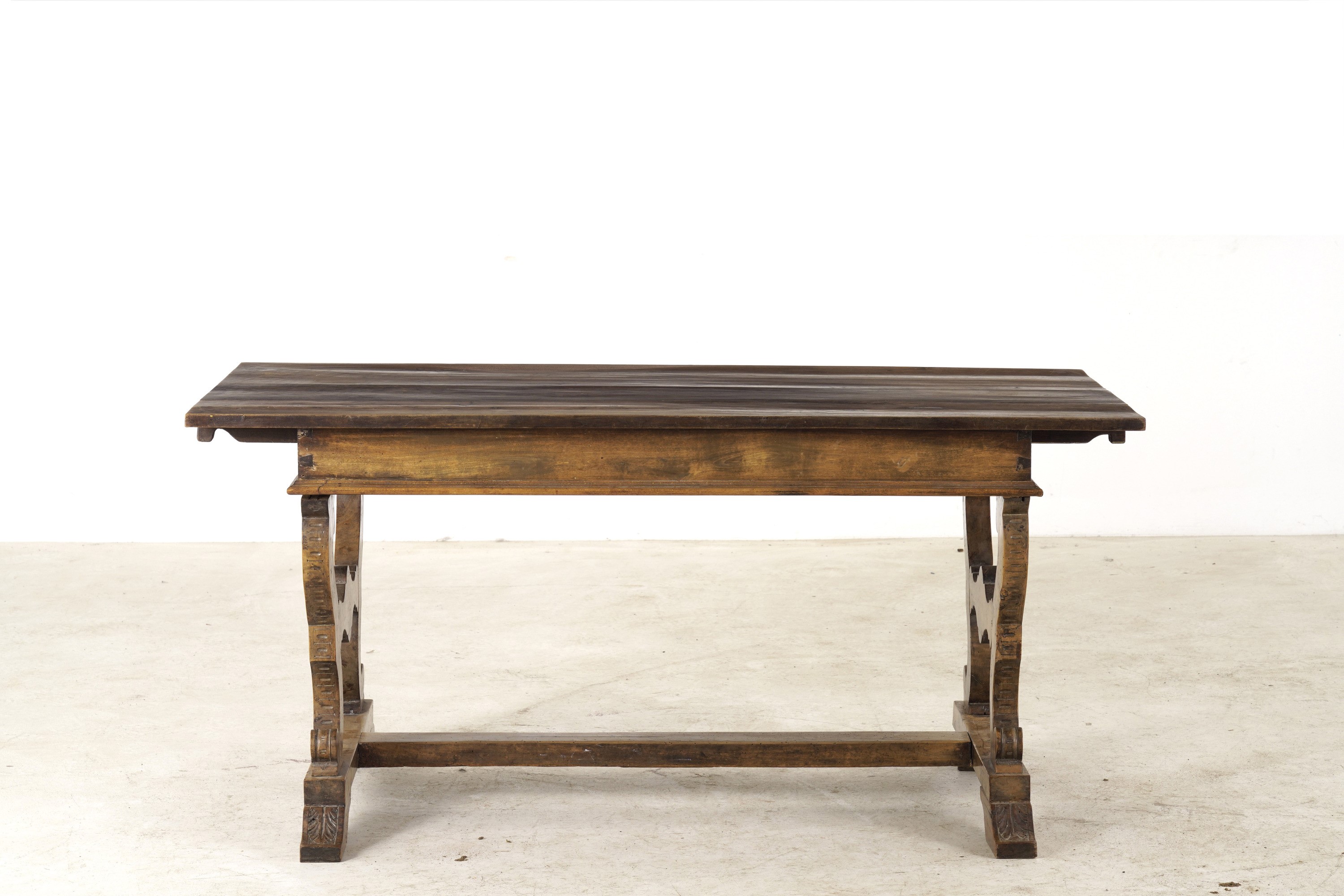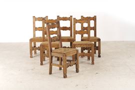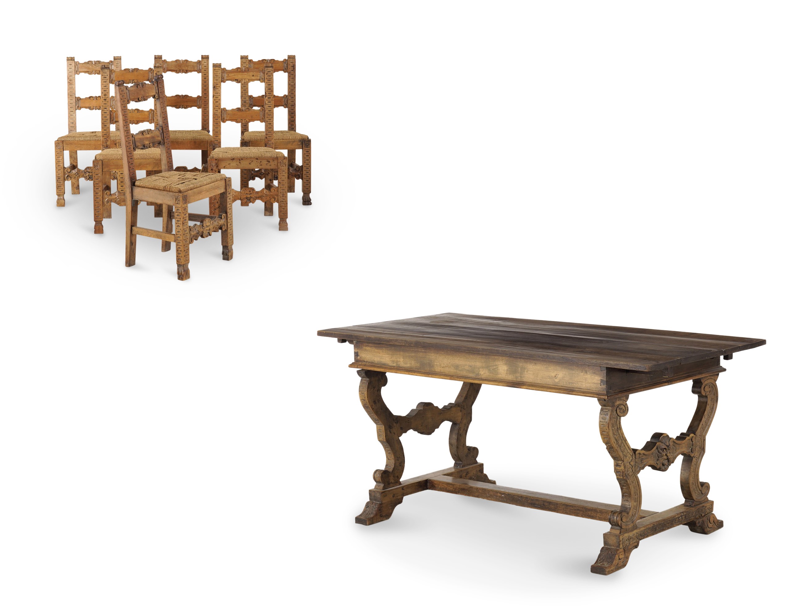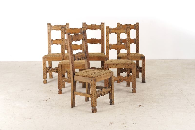 Tavolo e sei sedie in legno intagliato. XIX-XX secolo
