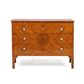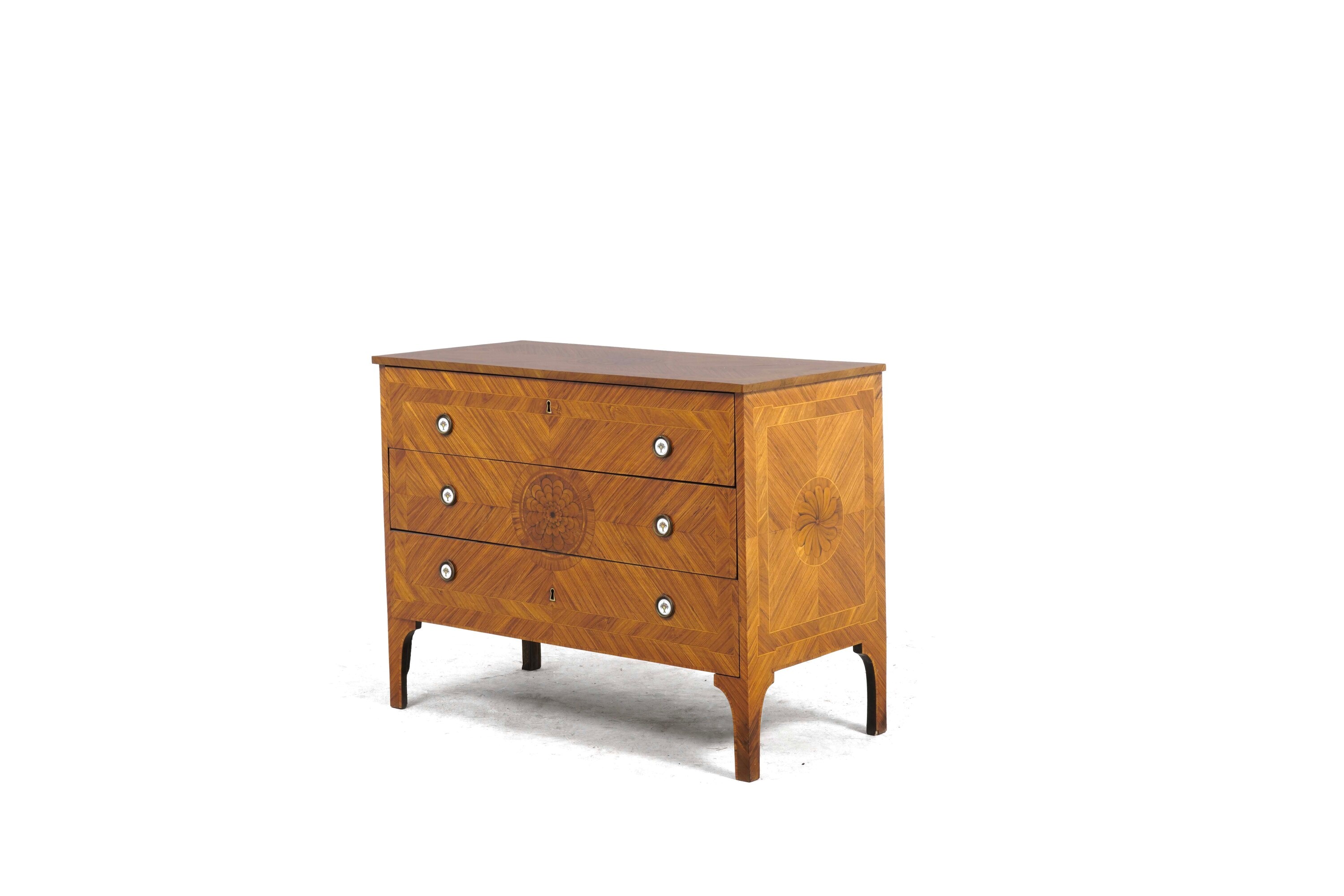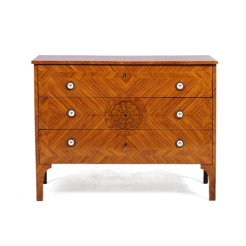 Comò a tre cassetti lastronato ed intarsiato. XX secolo