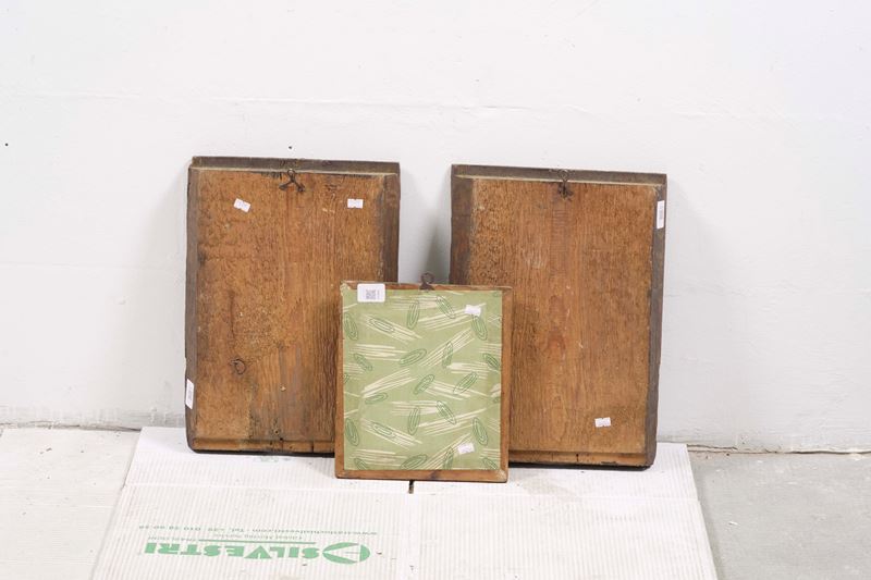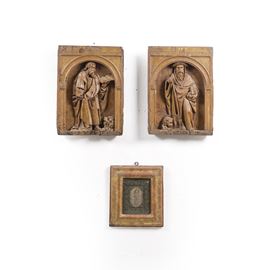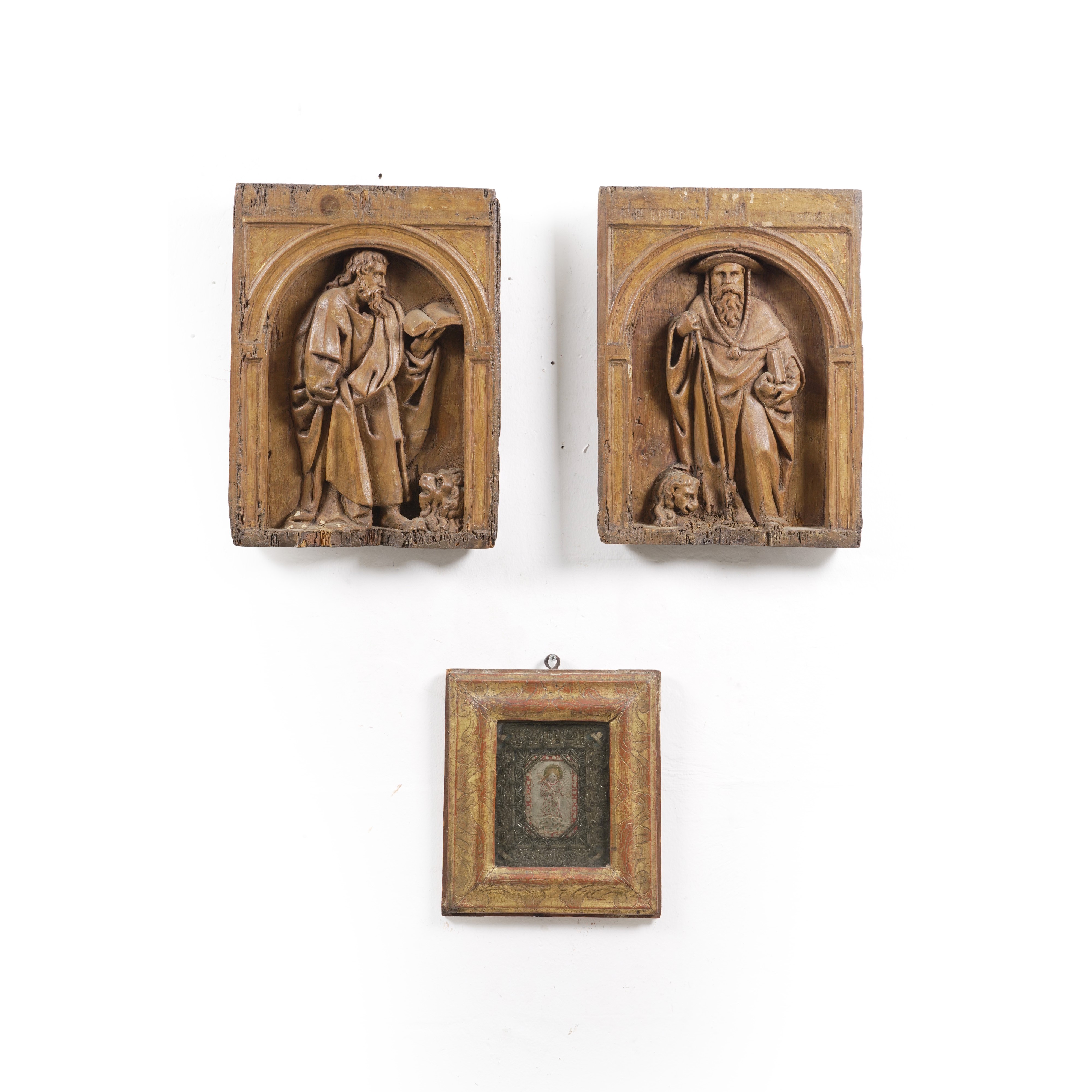 Coppia di rilievi in legno scolpito con Santi e un ricamo con Gesù Bambino