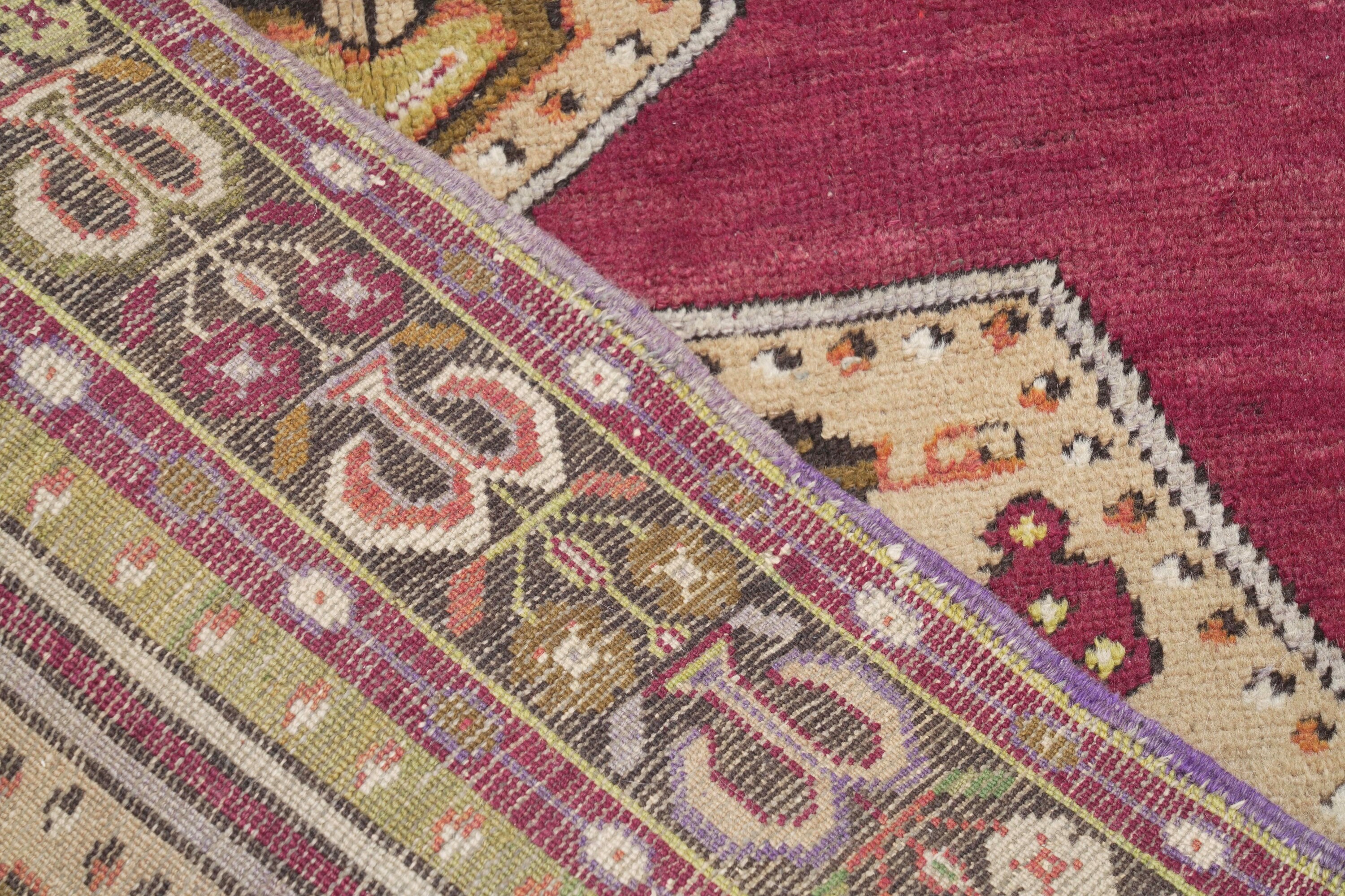 sul campo rosso scuro spicca un medaglione beige e viola, particolare il decoro della bordura marrone