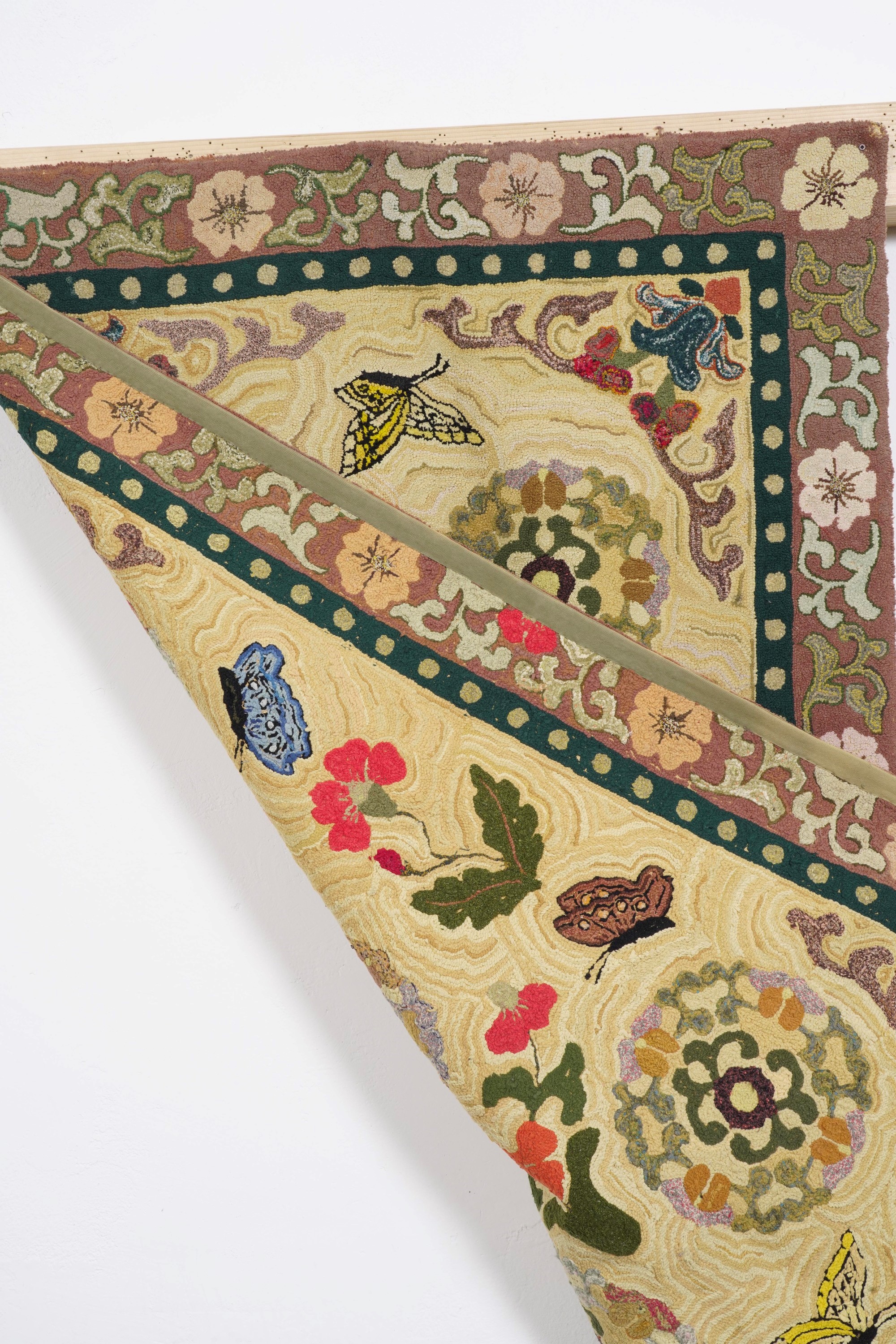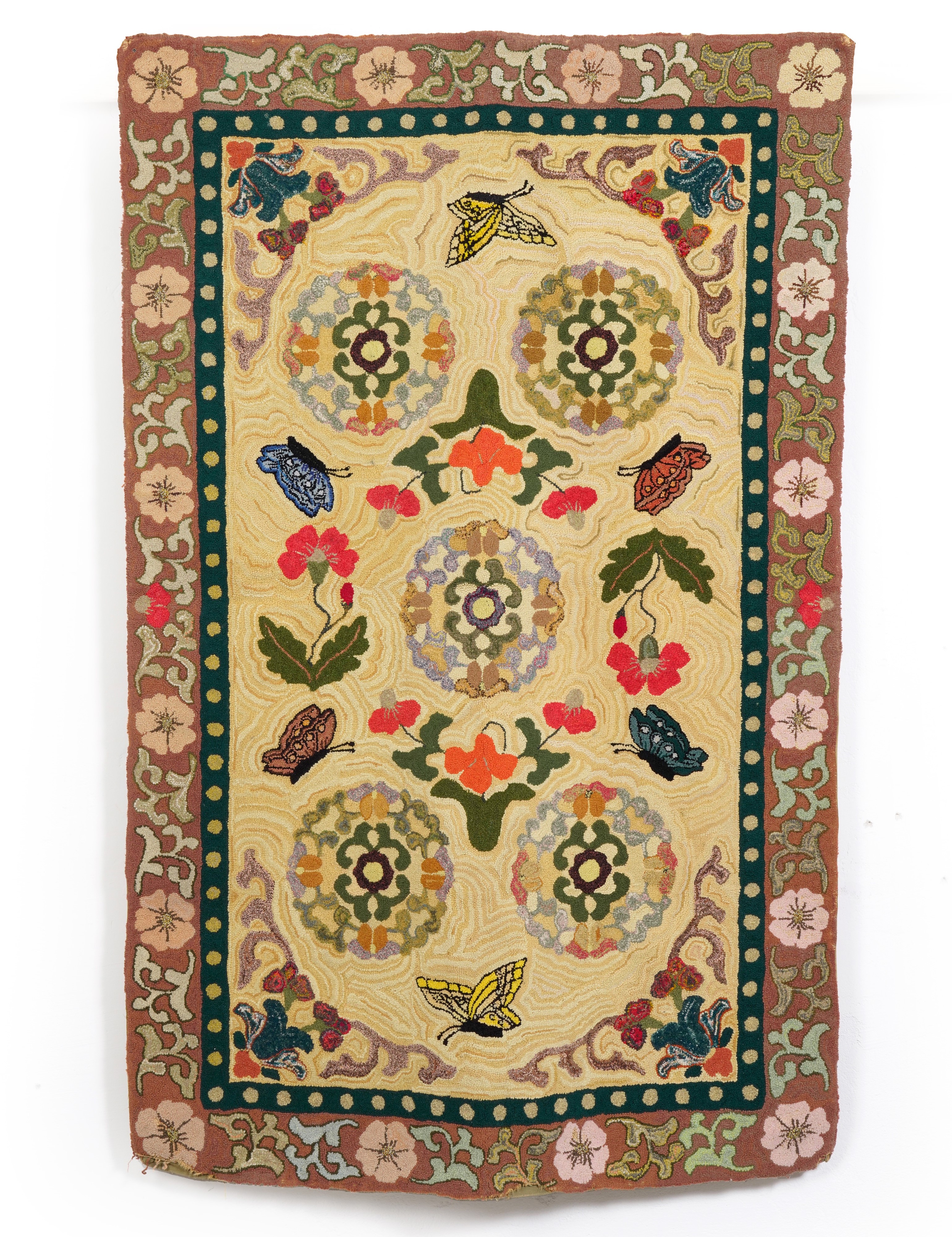 campo oro con decoro di un tappeto cinese, farfalle dalle lunghe antenne