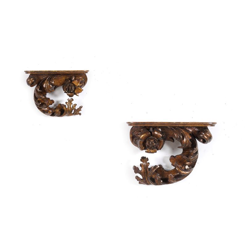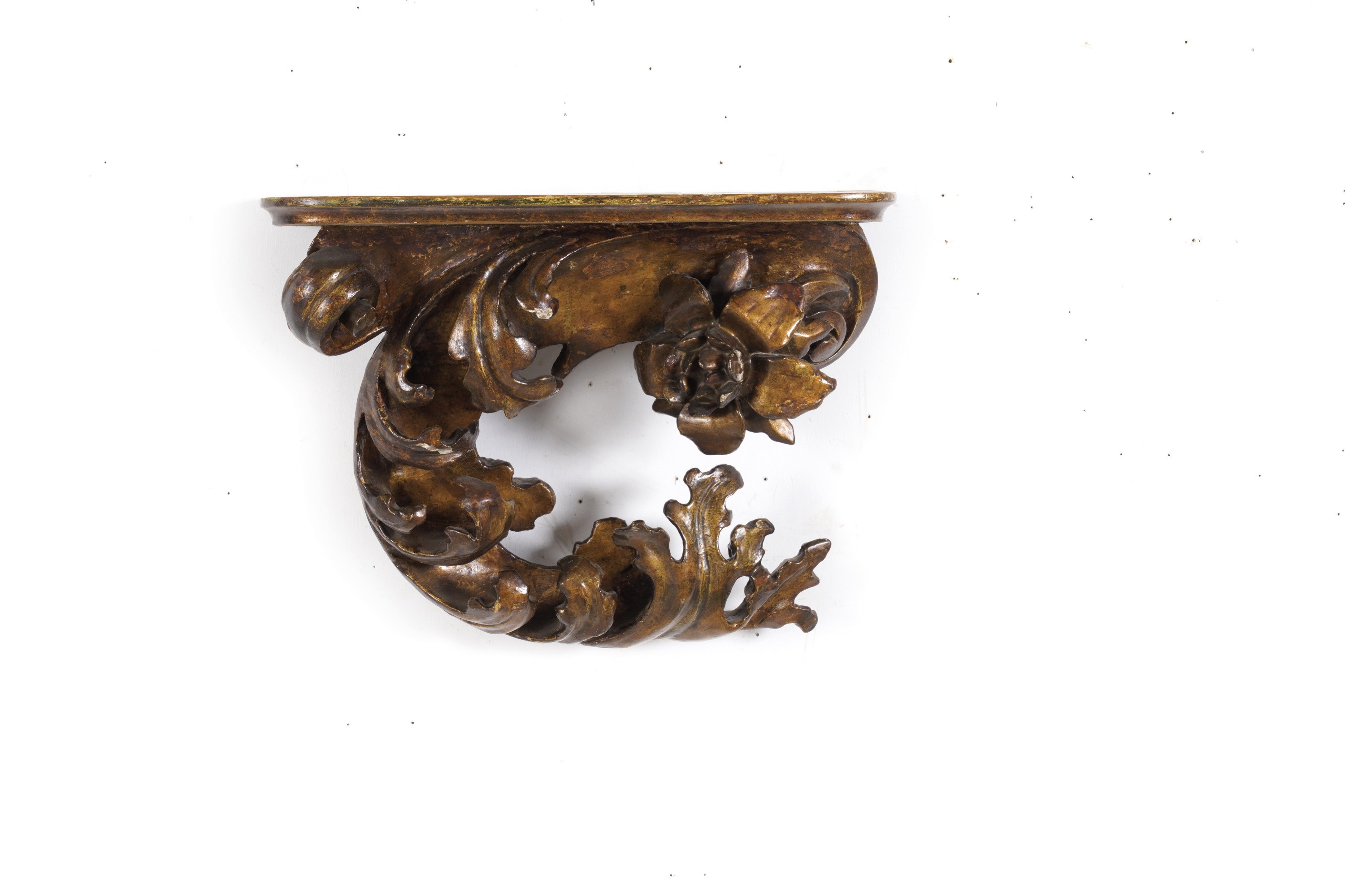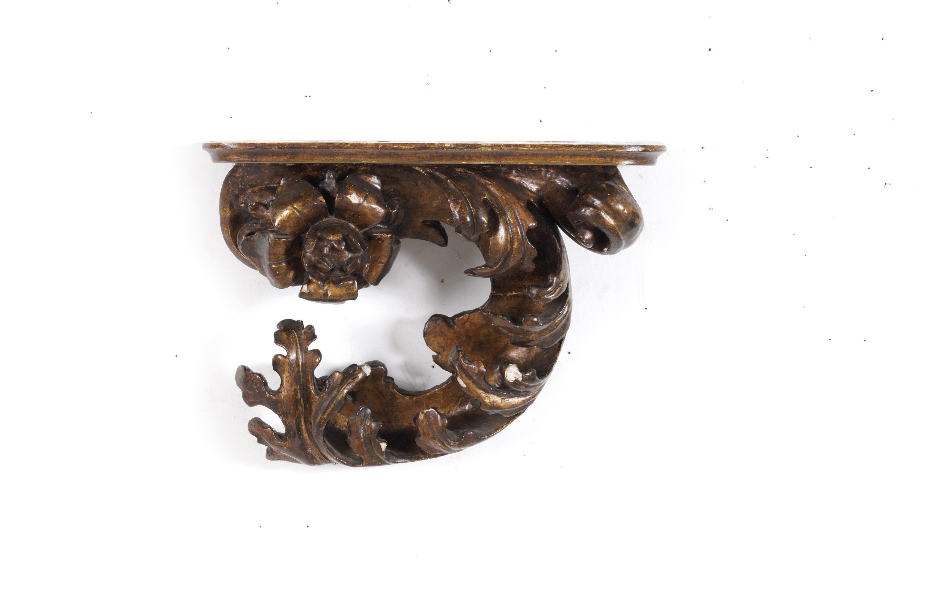 Coppia di mensole in legno intagliato e dorato. Elementi antichi