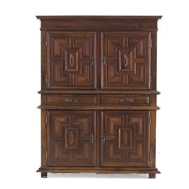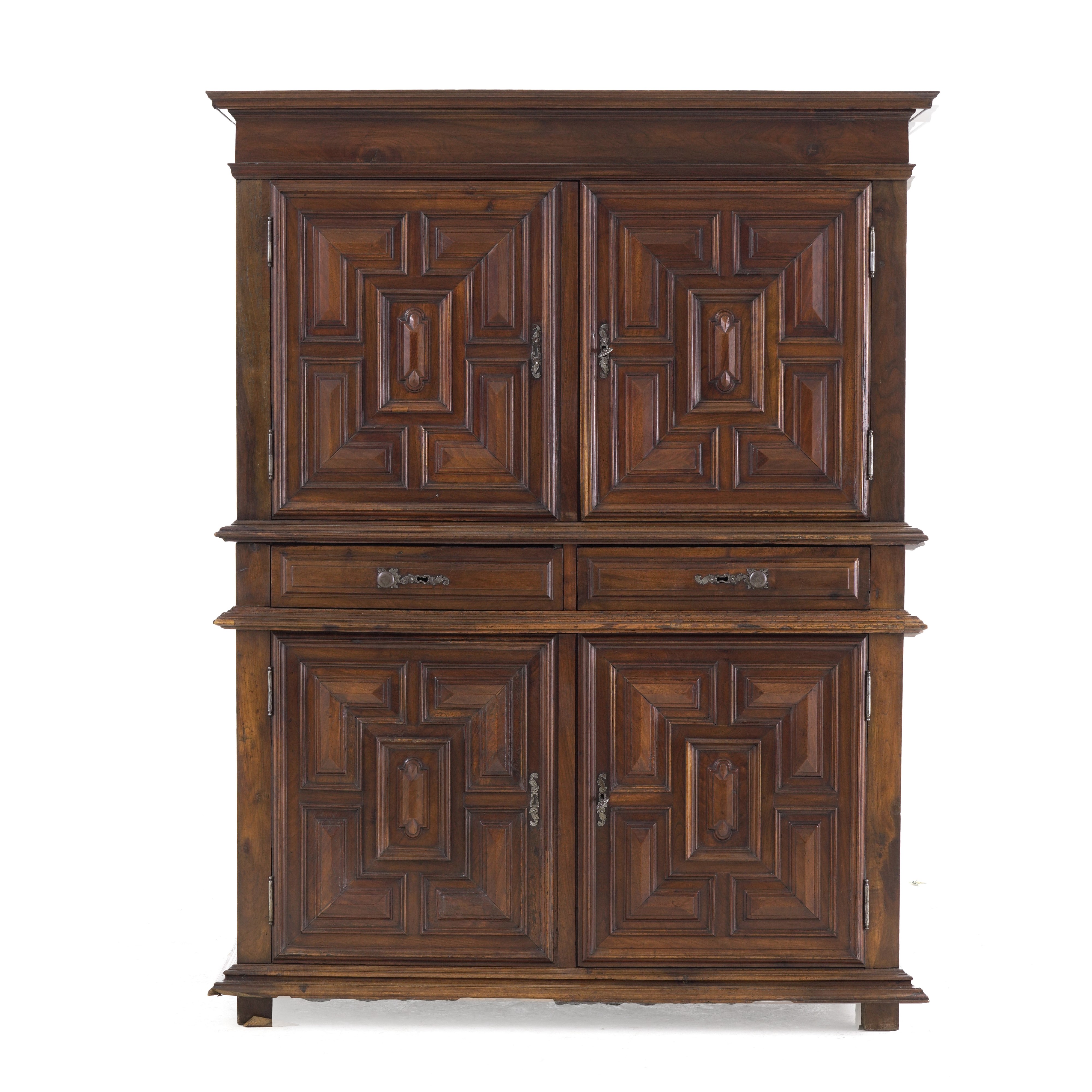 Quattro ante pannellate e bugnate, i due corpi separati da due cassetti in linea