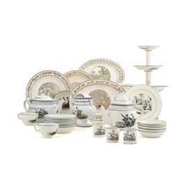 Il servizio è così composto: 27 piatti piani; 16 fondi; 46 piatti da dessert; 2 piatti da portata ovali; 4 alzatine; 1 alzata; 9 tazze da caffè; 8 tazze da tè; 17 piattini fondi; 2 teiere; 1 caffettiera.