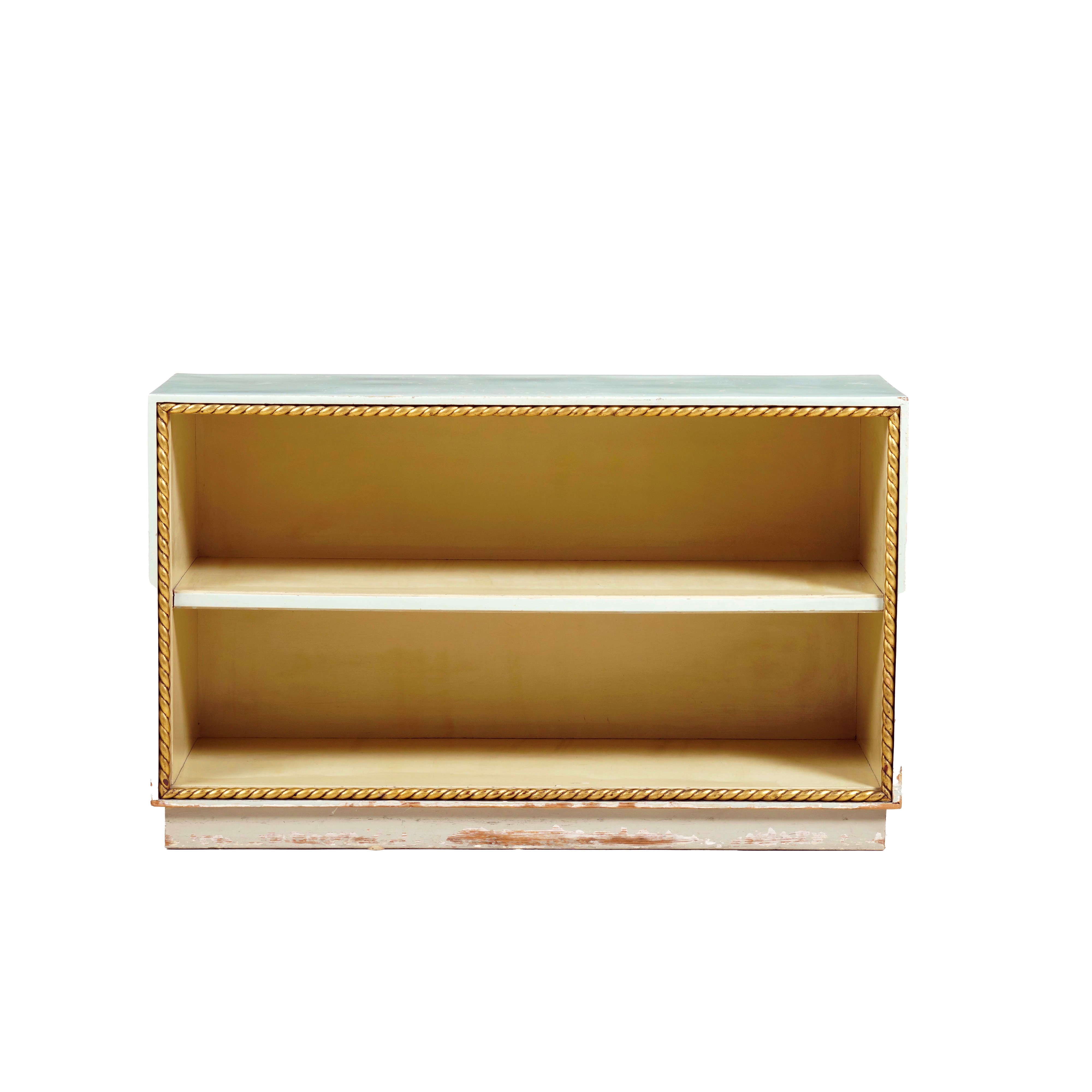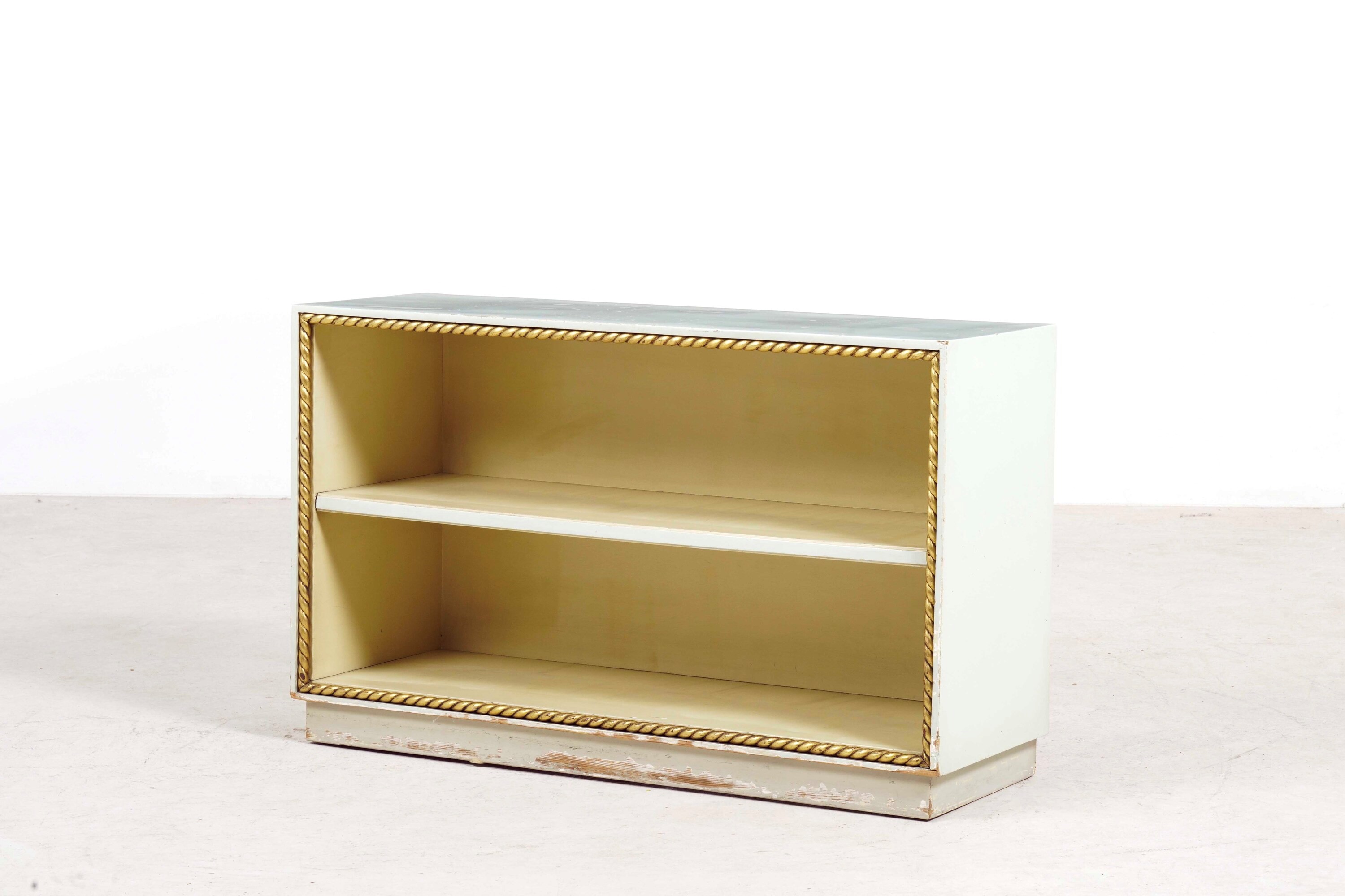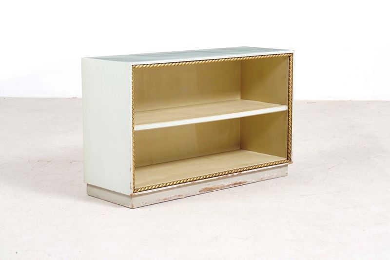 Piccola libreria in legno laccato con profilo a nastro dorato