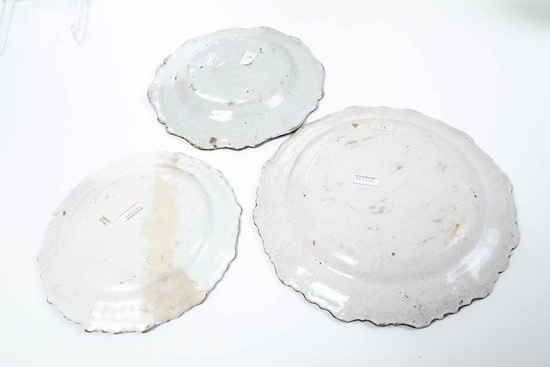 Maiolica in spugnato di manganese con riserve. Marca: assente. Diametro massimo cm 24. Conservazione: il piatto più piccolo rotto in 2 frammenti e incollato; gli altri con minime sbeccature al bordo.