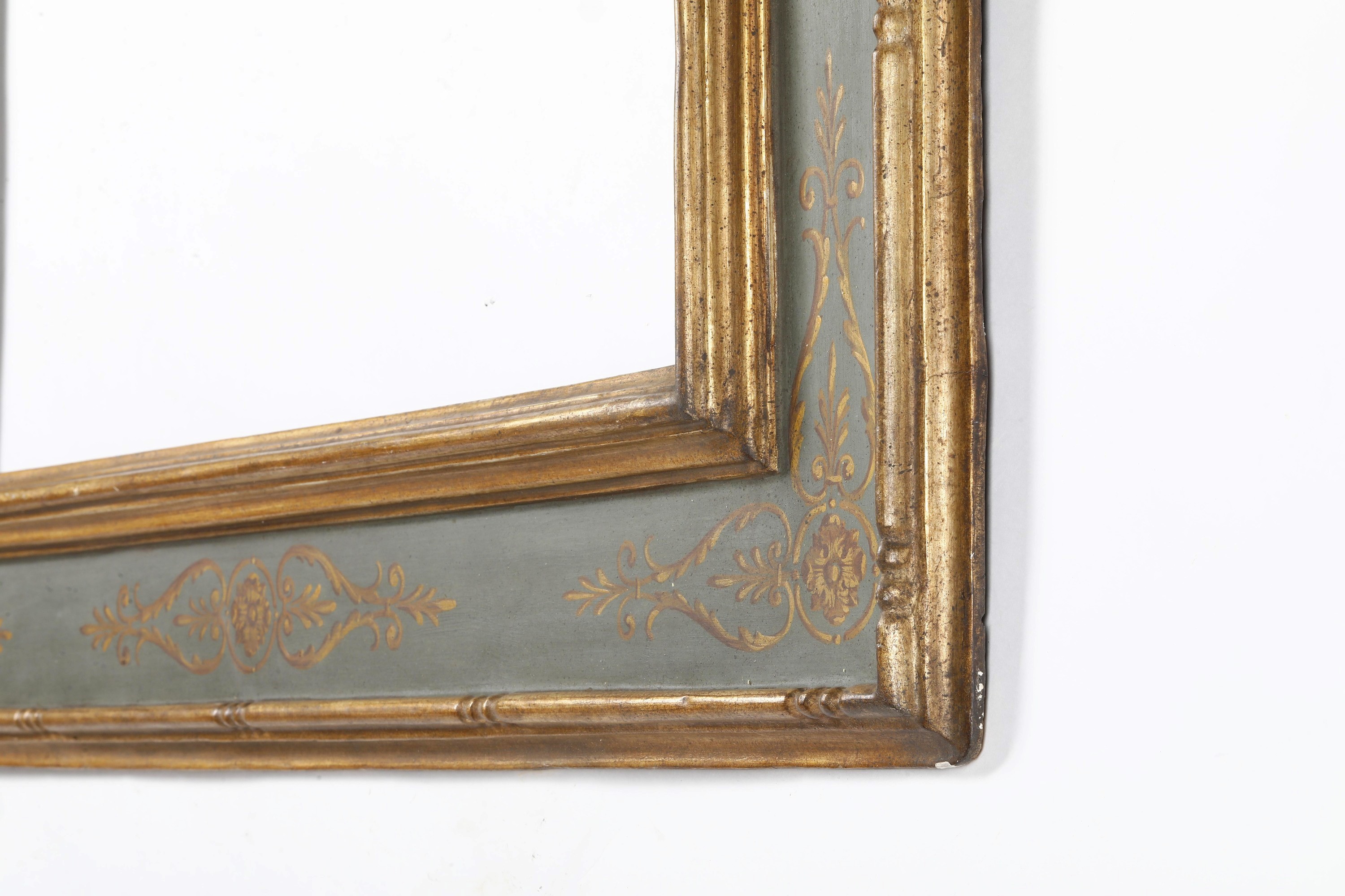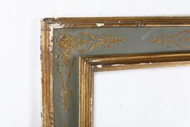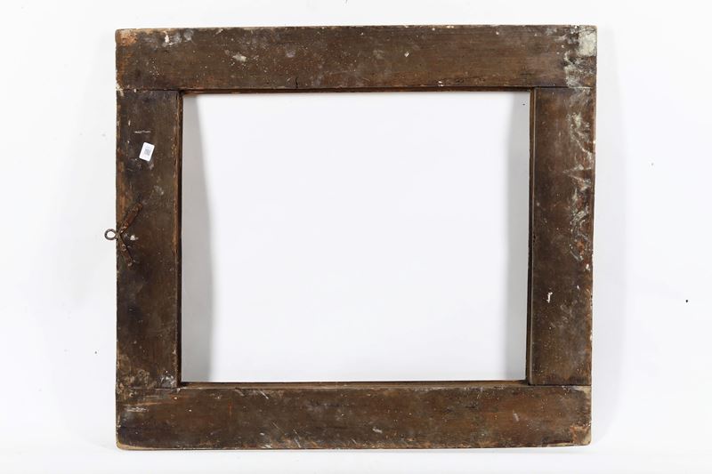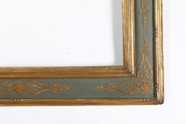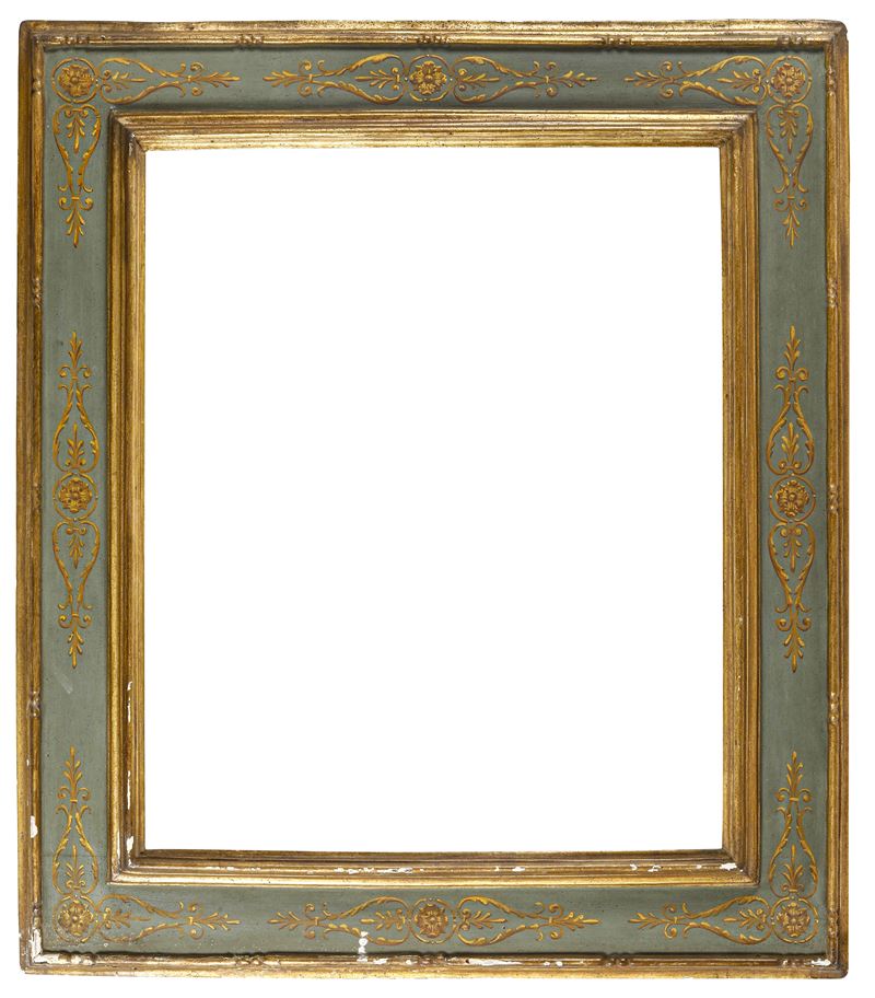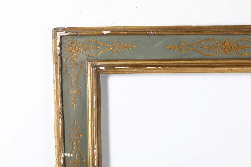 battuta dorata, fascia dipinta con ramages vegetali e e floreali agli angoli a ai centri seguita da profilo a fusarole e perline (difetti, riprese alla policromia)