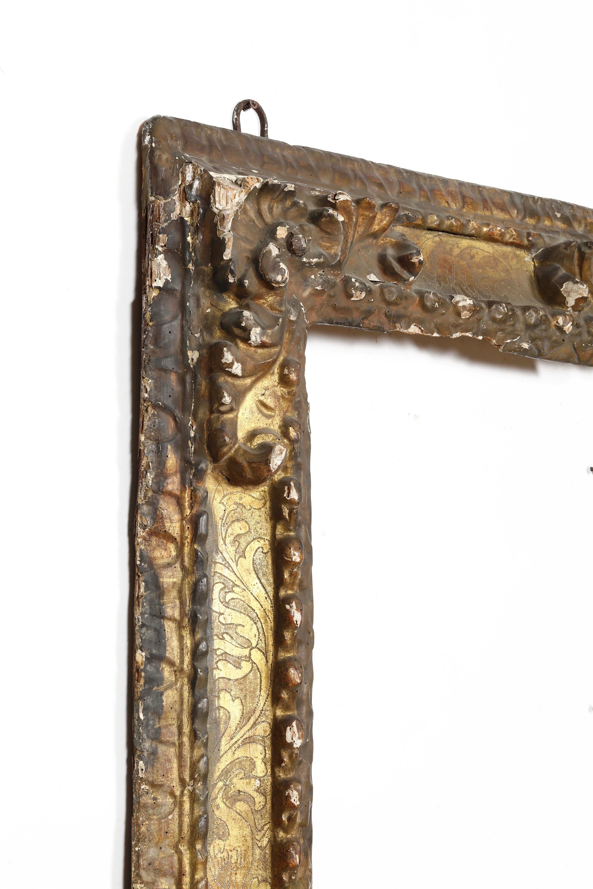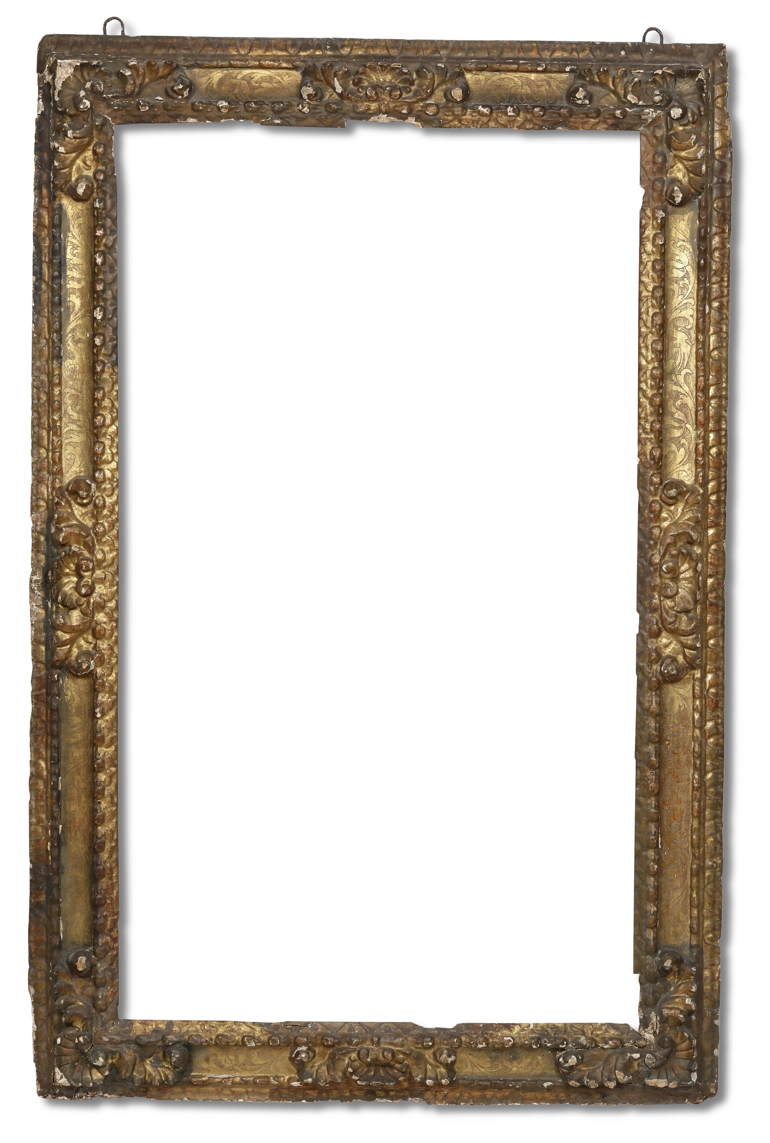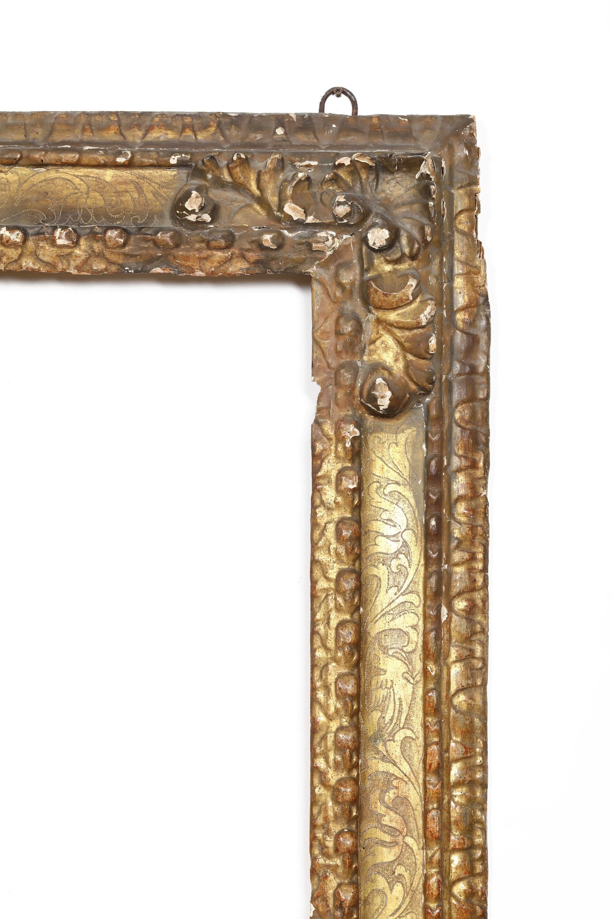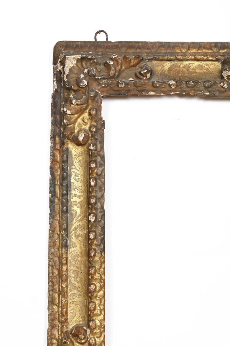 battuta intagliata a mezzefoglie stilizzate seguita da profili perlinato, fascia decorata da ramages vegetali su fondo bulinato; angoli e centri decorati da conchiglie e volute