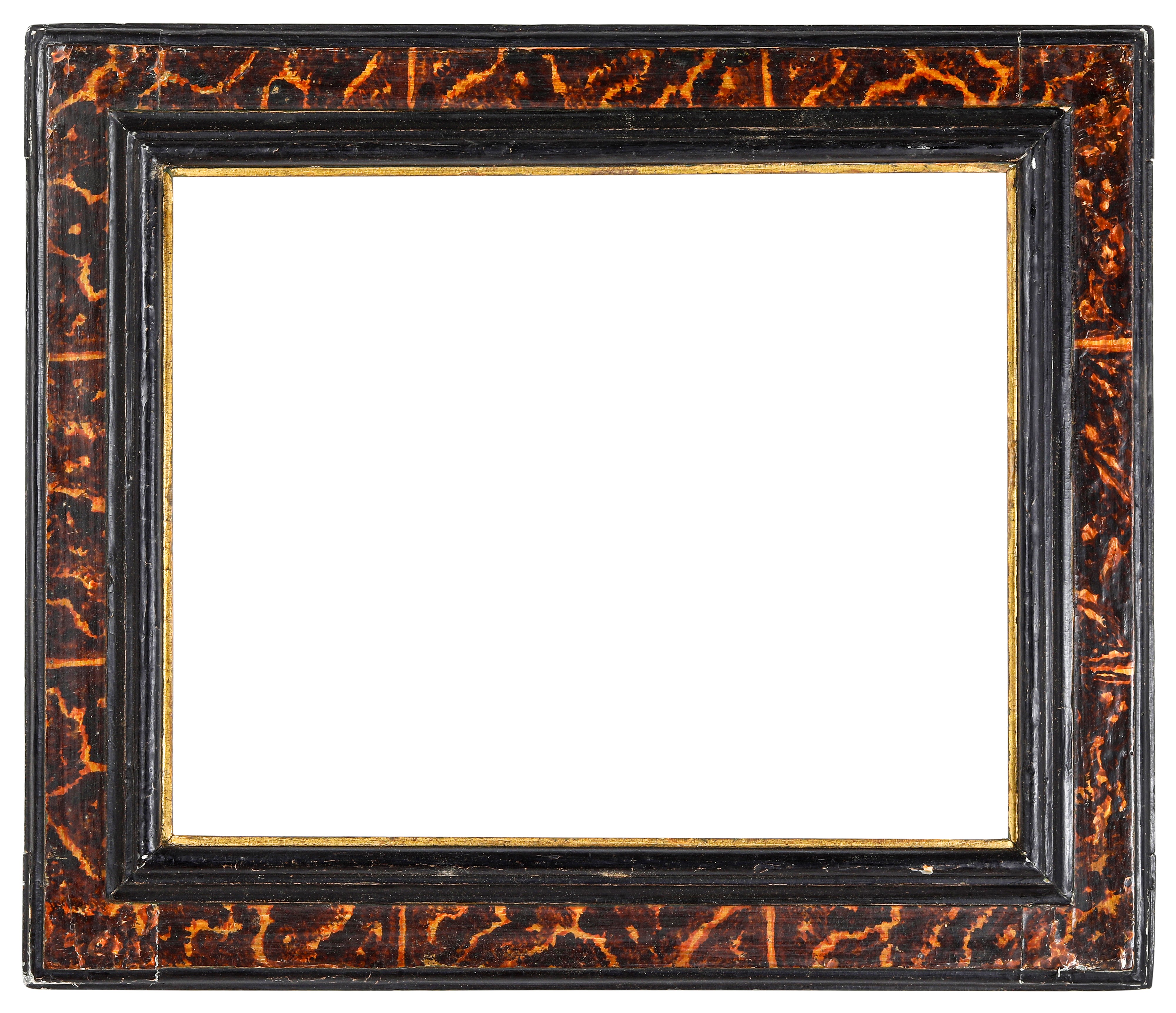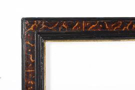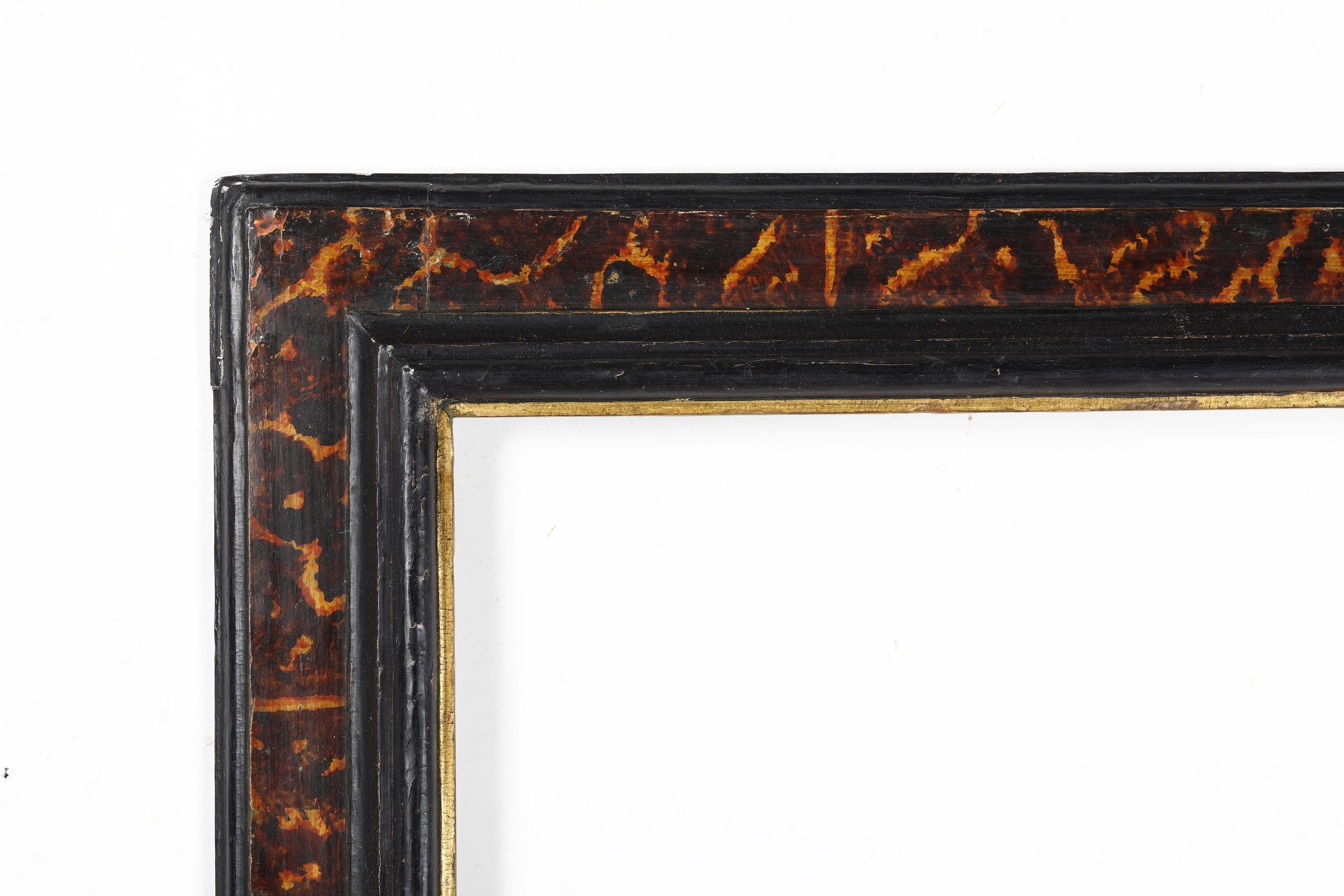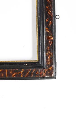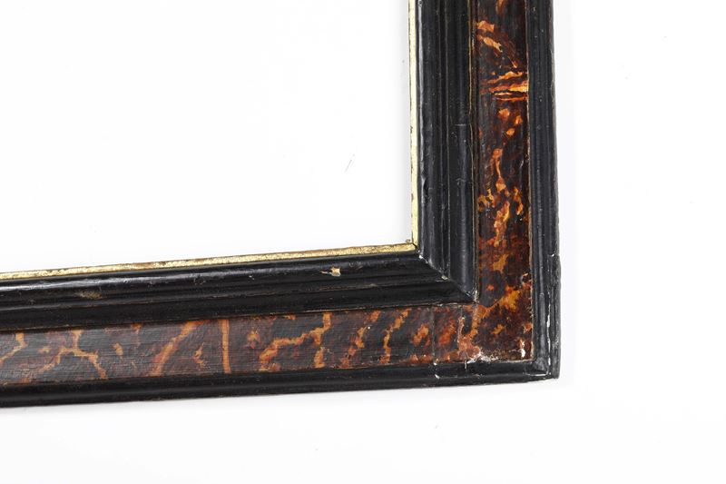 battuta liscia dorata seguita da profilo ebanizzato; fascia con sagoma a cassetta dipinta a finta tartaruga