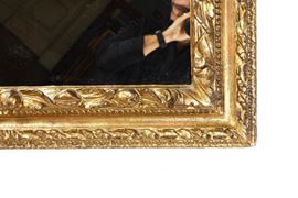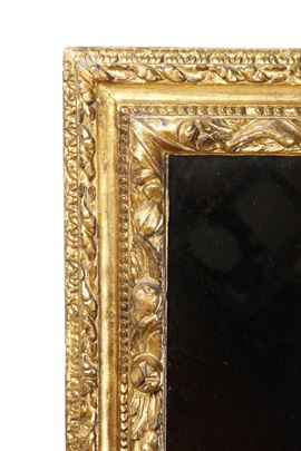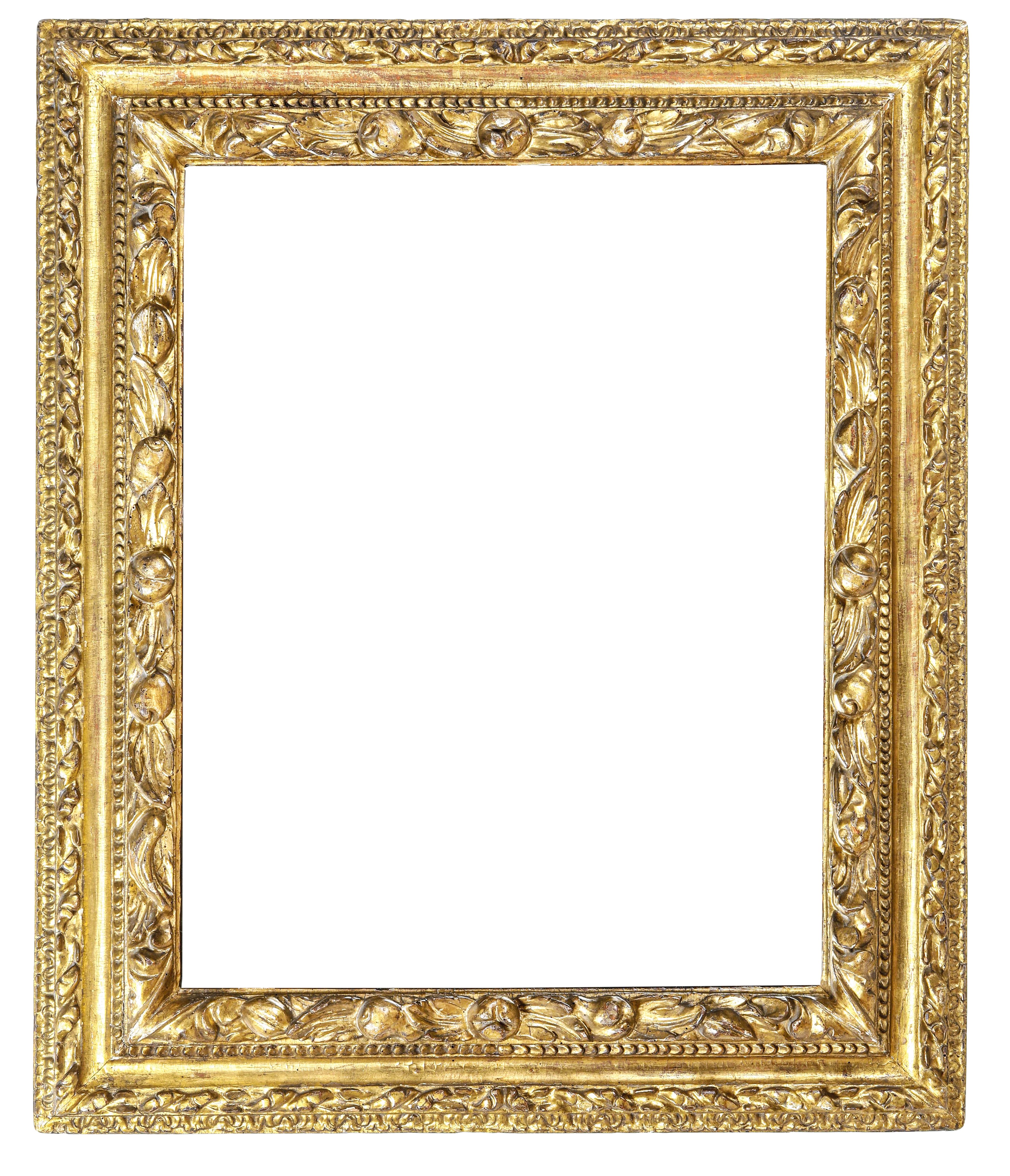 sottile battuta liscia che sale su profilo a motivo di foglie e frutta, prosegue su fascia a gola e termina con profilo a fogliette stilizzate
