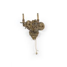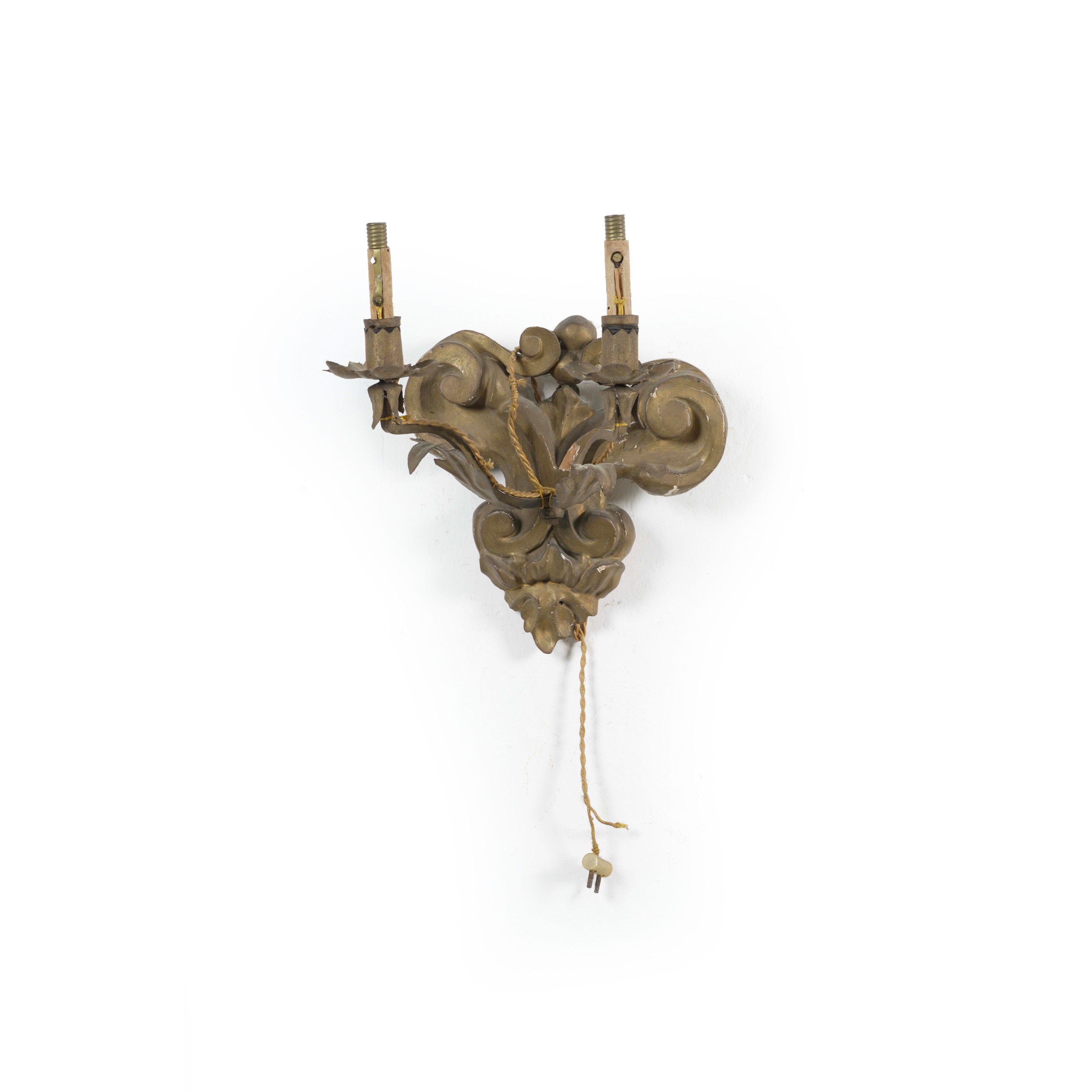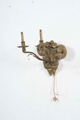 Legno intagliato e dorato. Decori a volute e motivi fitomorfi. Bracci in ferro battuto