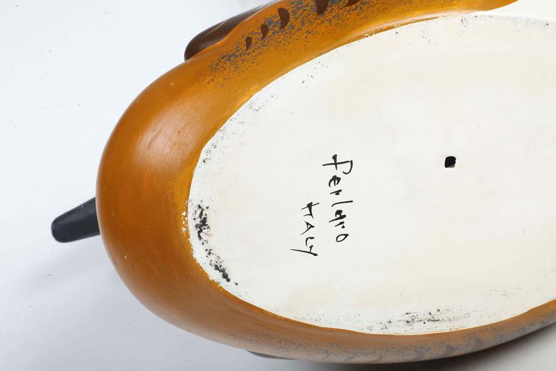 Terraglia dipinta a freddo, occhi in vetro. Marca: “Ferlaro Italy”. Dimensioni: altezza cm 24,5 circa; lunghezza cm 40 circa. Conservazione: qualche usura alla policromia; un occhio mancante
