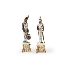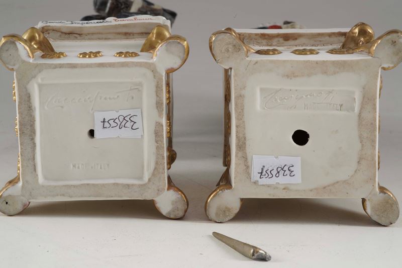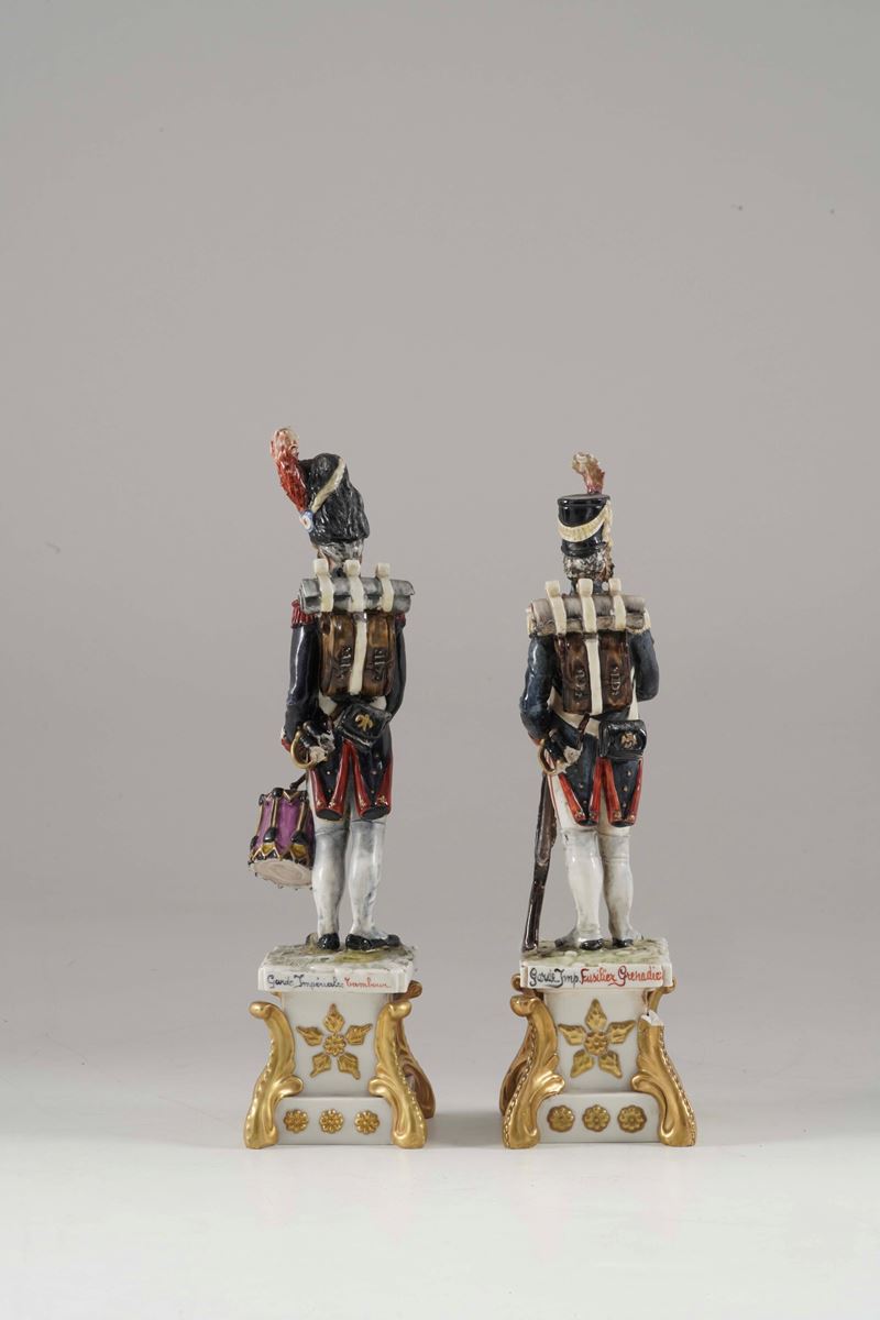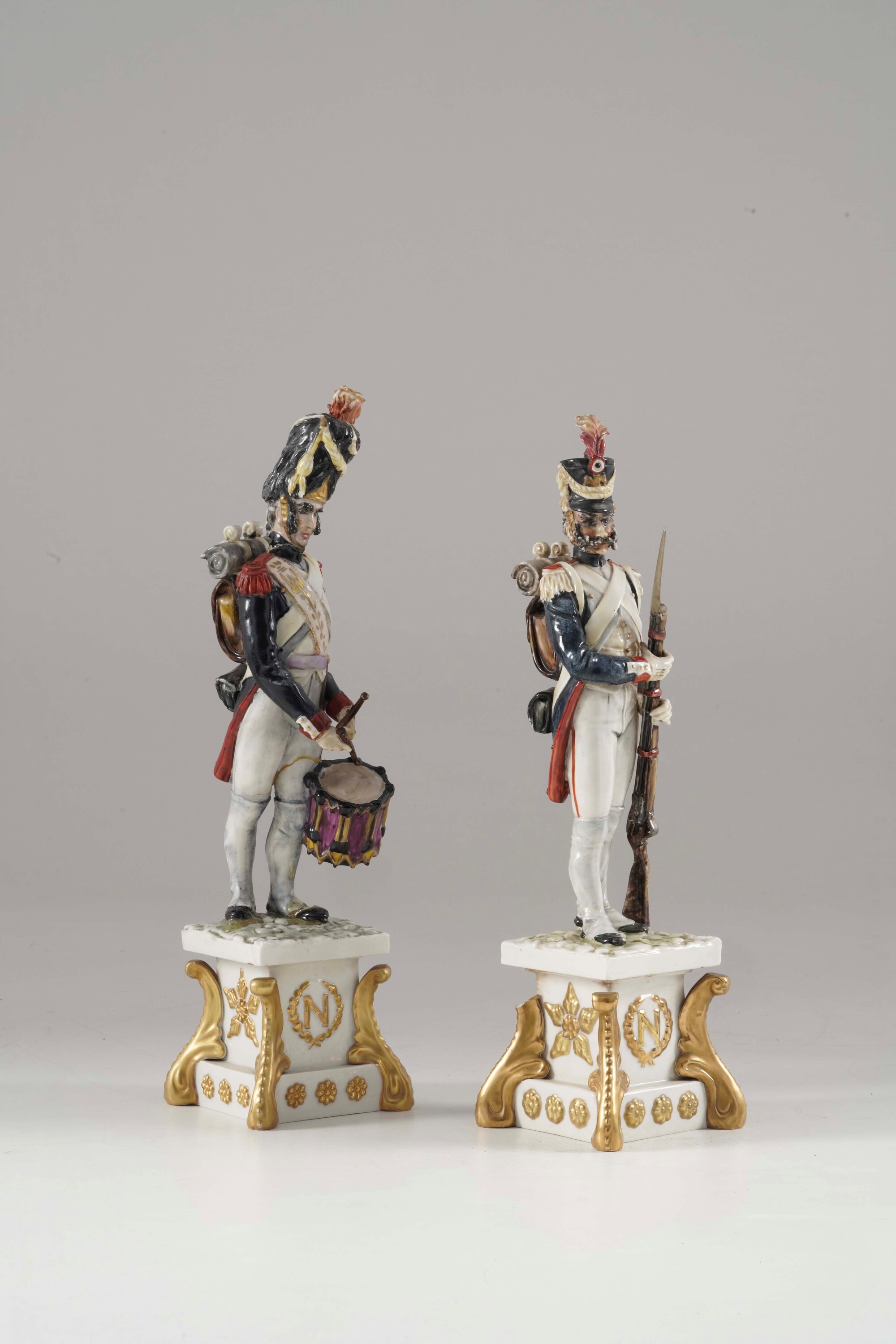 Porcellana policroma. Marca: “Cacciapuoti incisa sotto la base”; “S Righetto” inciso sopra la base. Altezza cm 32 circa. Conservazione: figurina con tamburino con rotture incollate all’altezza dei piedi, della coscia sinistra, del collo e della mano sinistra; figura con fuciliere con baionetta staccata, mancanza di una rocailles della base; ambedue con spade mancanti.