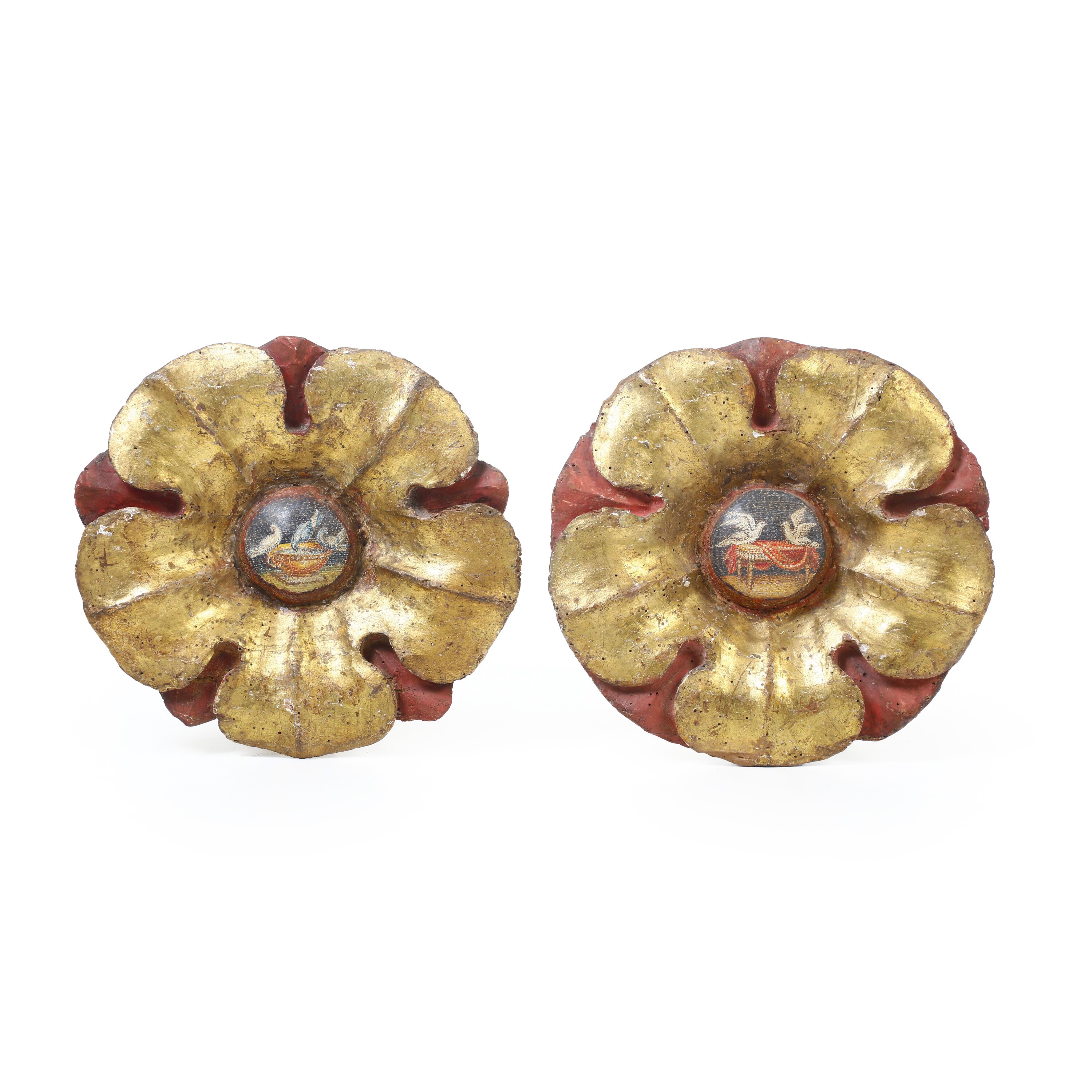 Legno laccato e dorato, intagliati a forma di fiore con al centro rappresentazioni delle colombe di Plinio