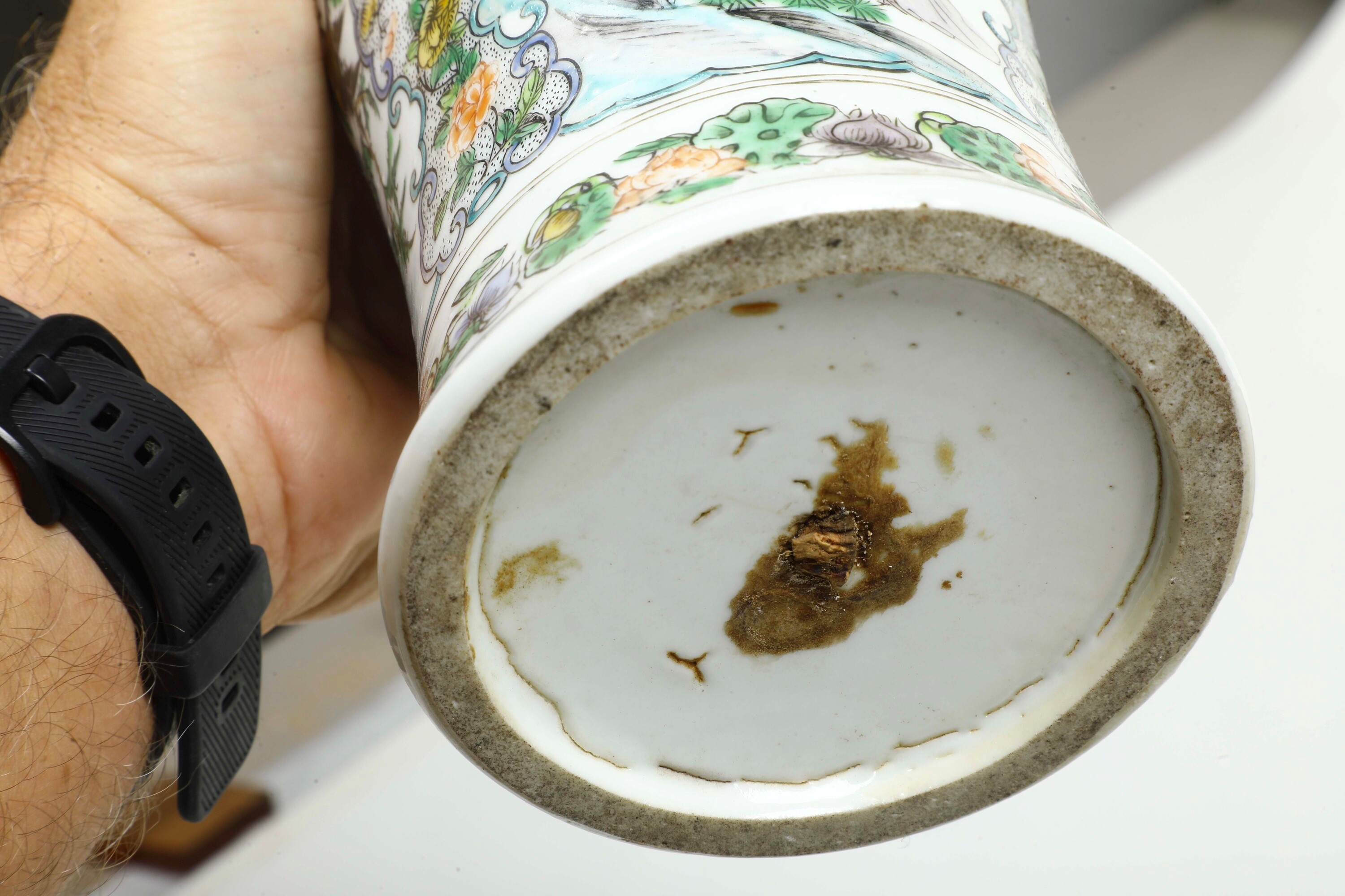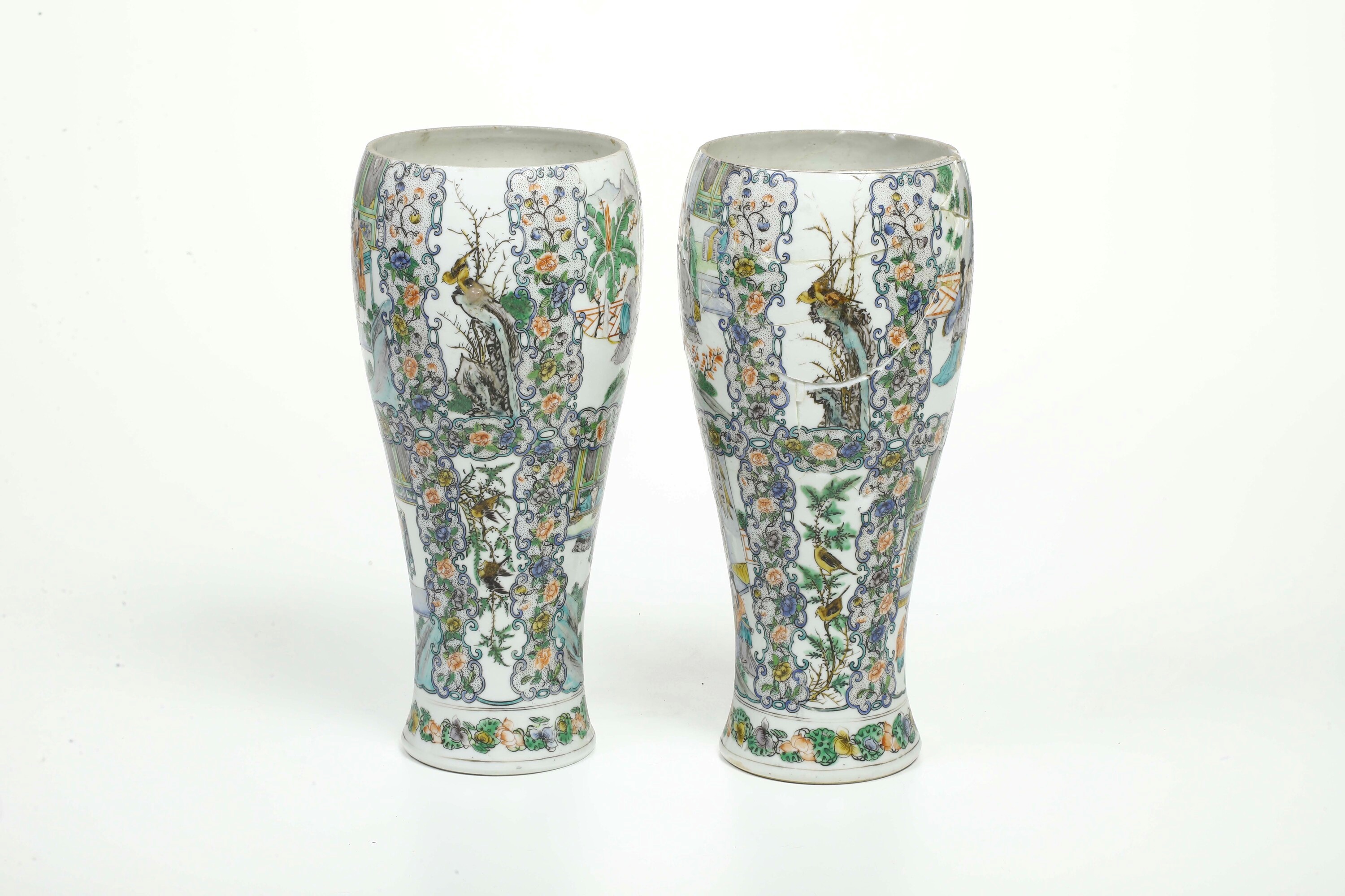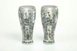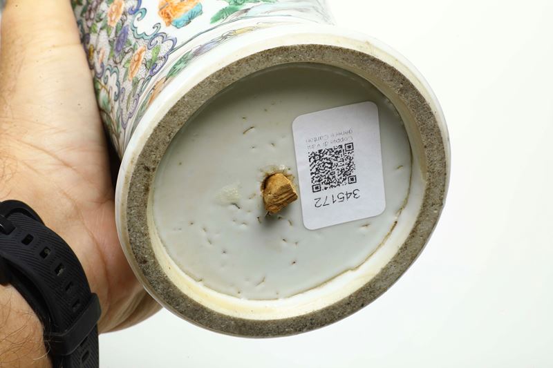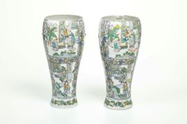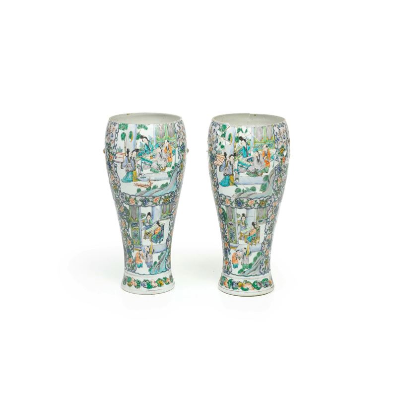 Coppia di vasi in porcellana raffiguranti scene di vita comune entro riserve e decori a motivi vegetali, Canton, Cina, XX secolo