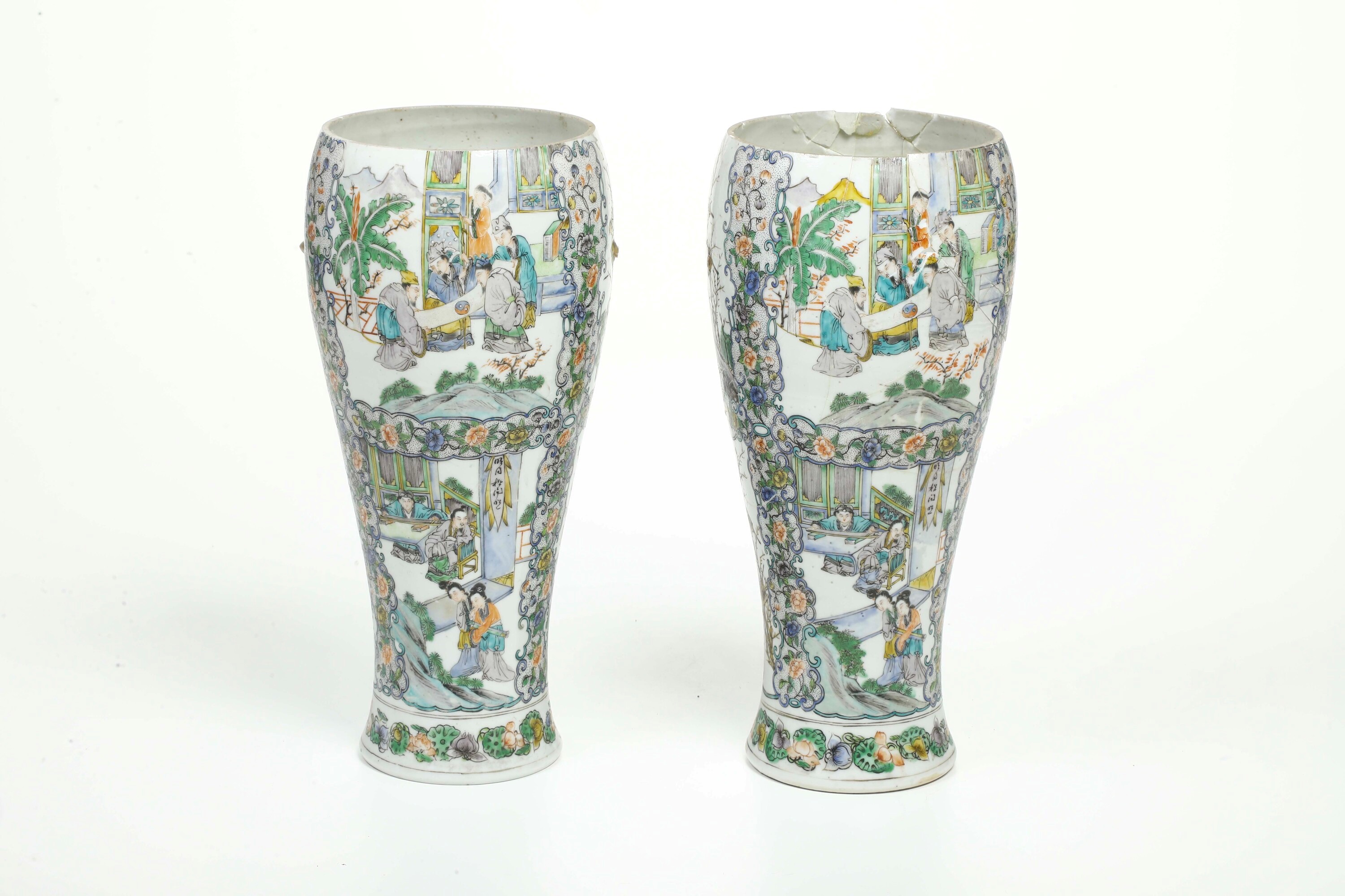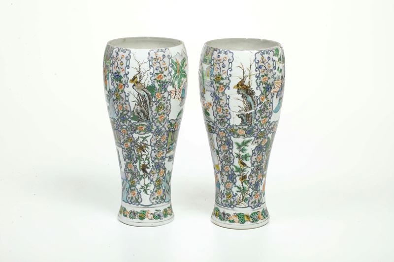 Coppia di vasi in porcellana raffiguranti scene di vita comune entro riserve e decori a motivi vegetali, Canton, Cina, XX [..]