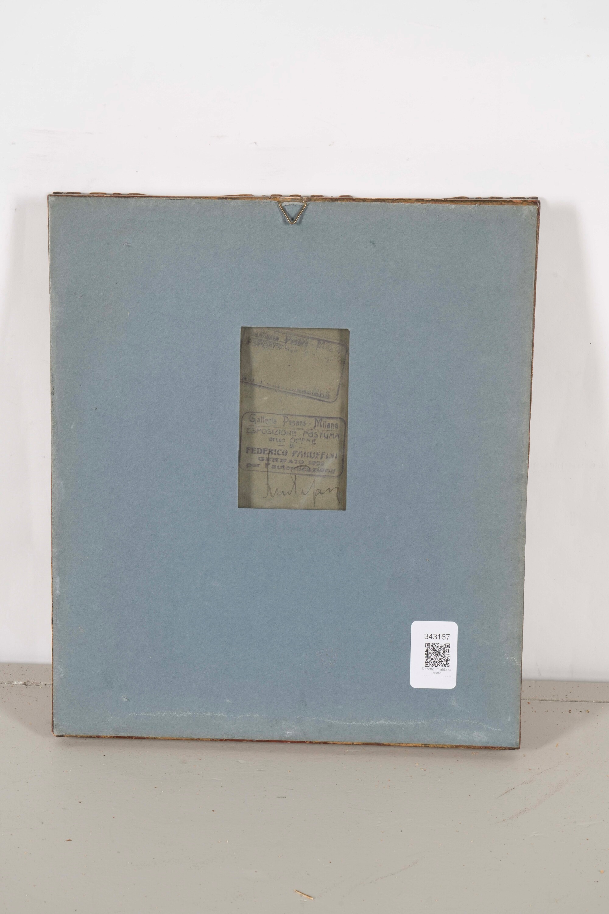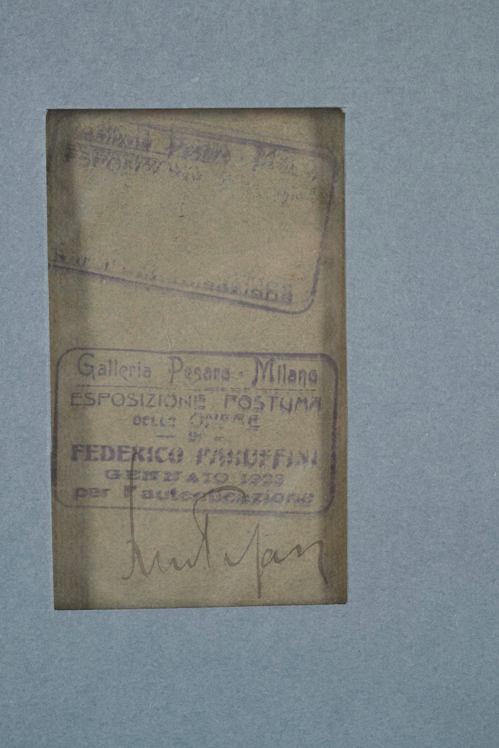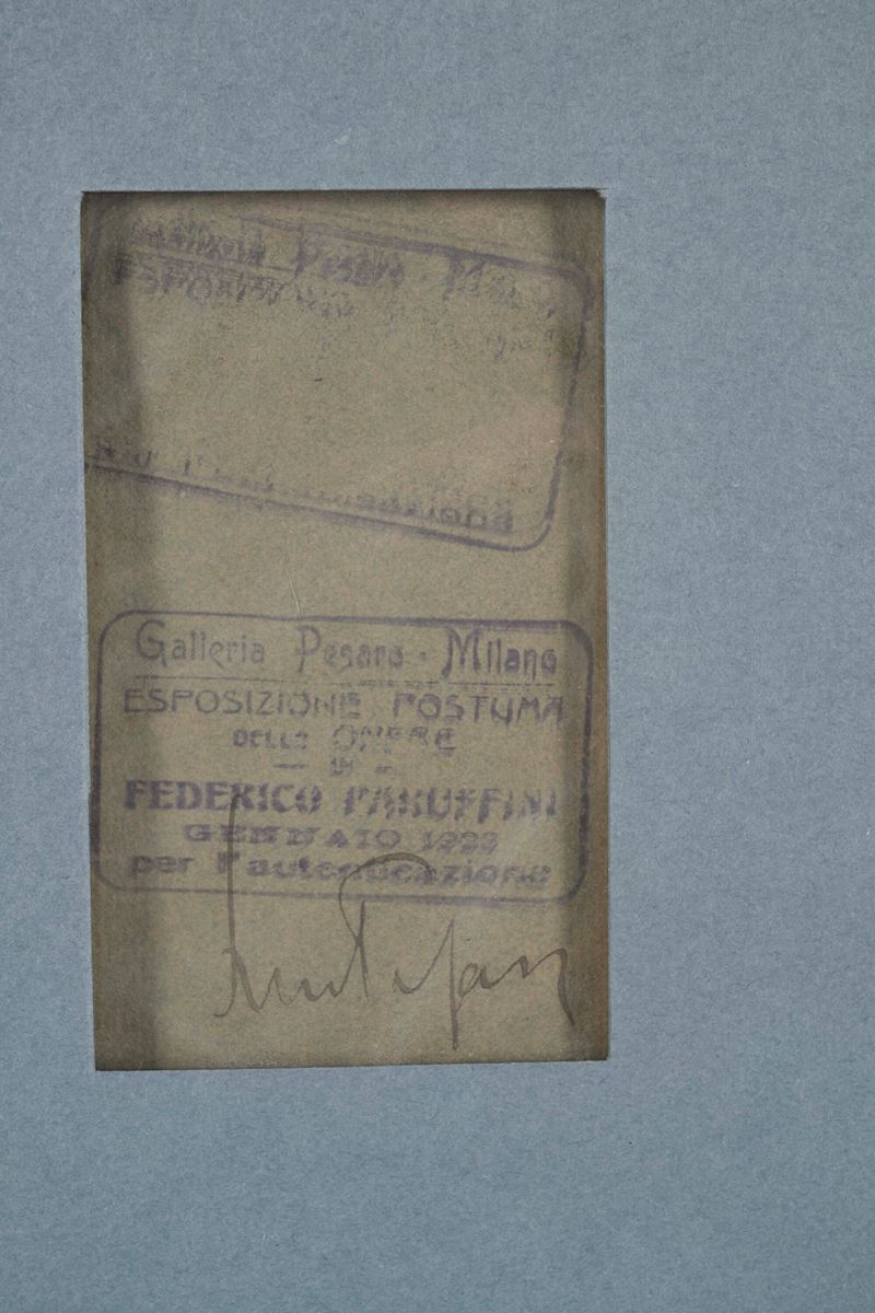 Al retro etichetta cartacea della Esposizione postume delle opere di Federico Faruffini della Galleria Pesaro di Milano