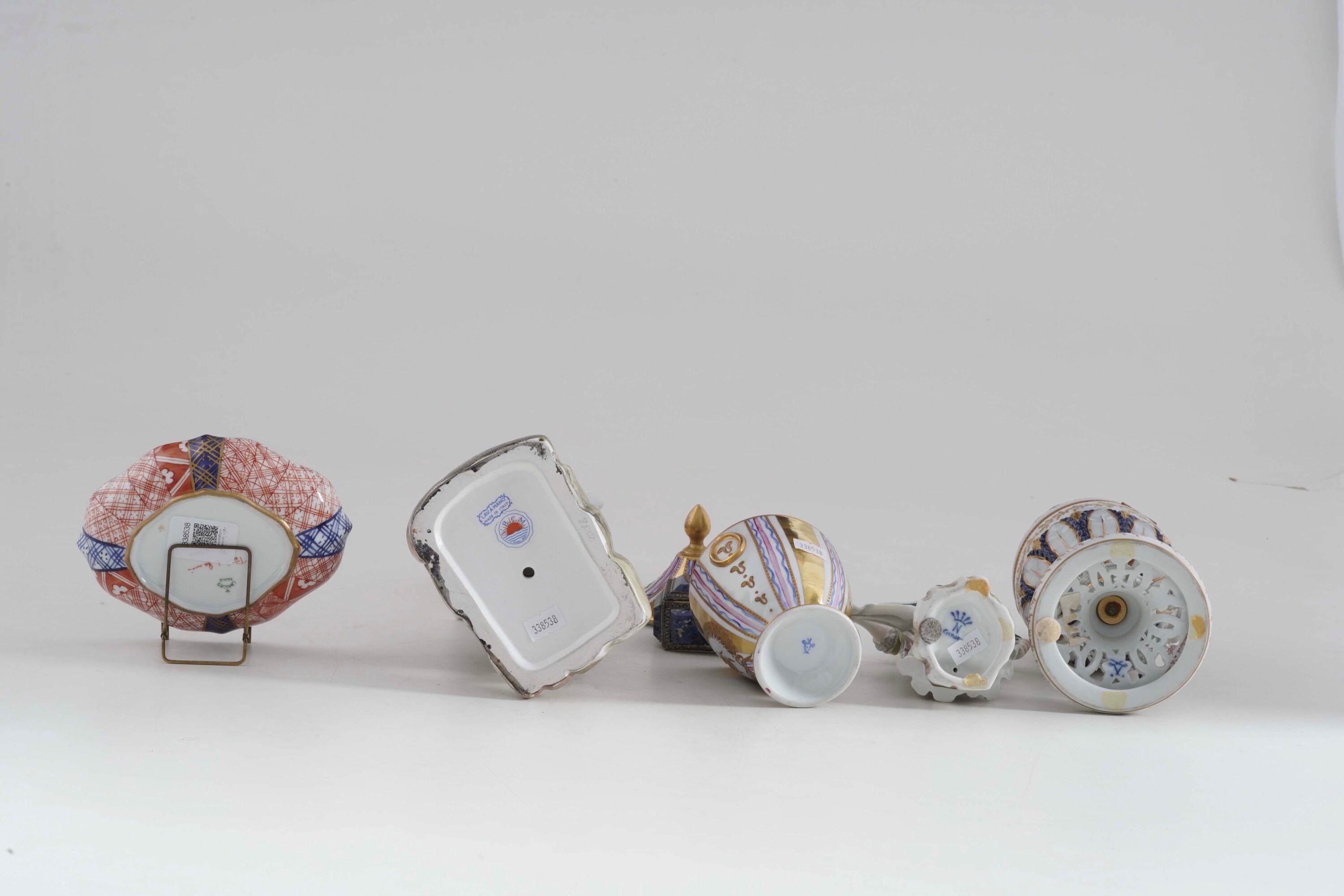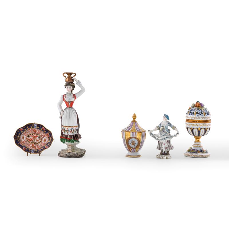 Al lotto si aggiungono altre quatto porcellane del XX secolo di diversa provenienza: tre francesi e una figurina italiana (buono stato di conservazione, qualche mancanza minore, zuccheriera con pomello del coperchio e parte del contenitore incollati).
