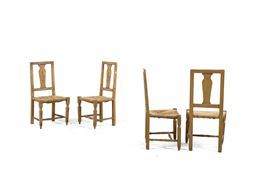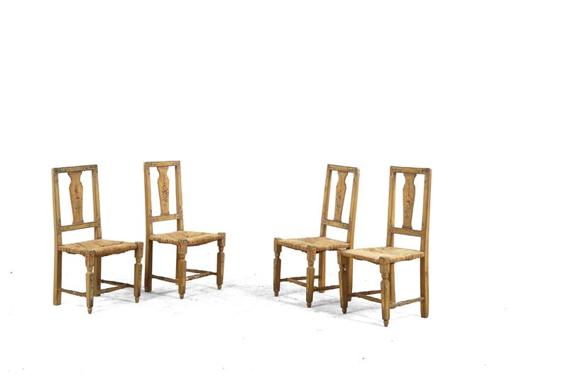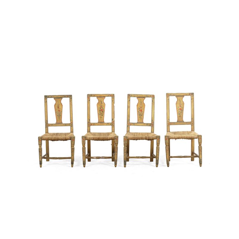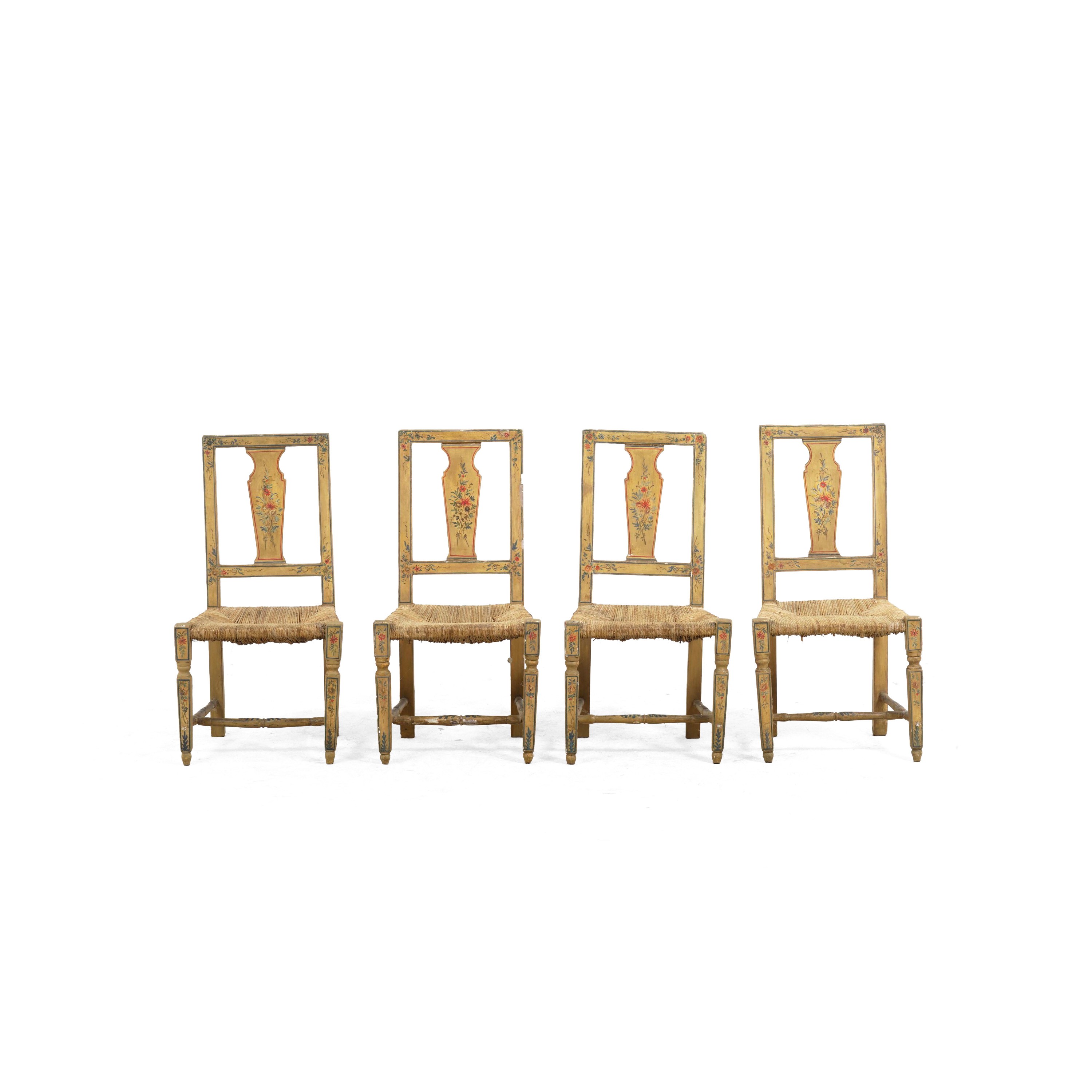Legno dipinto con decoro floreale, gambe anteriori rastremate, sedute impagliate, schienali a cartella