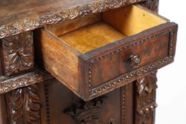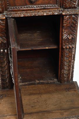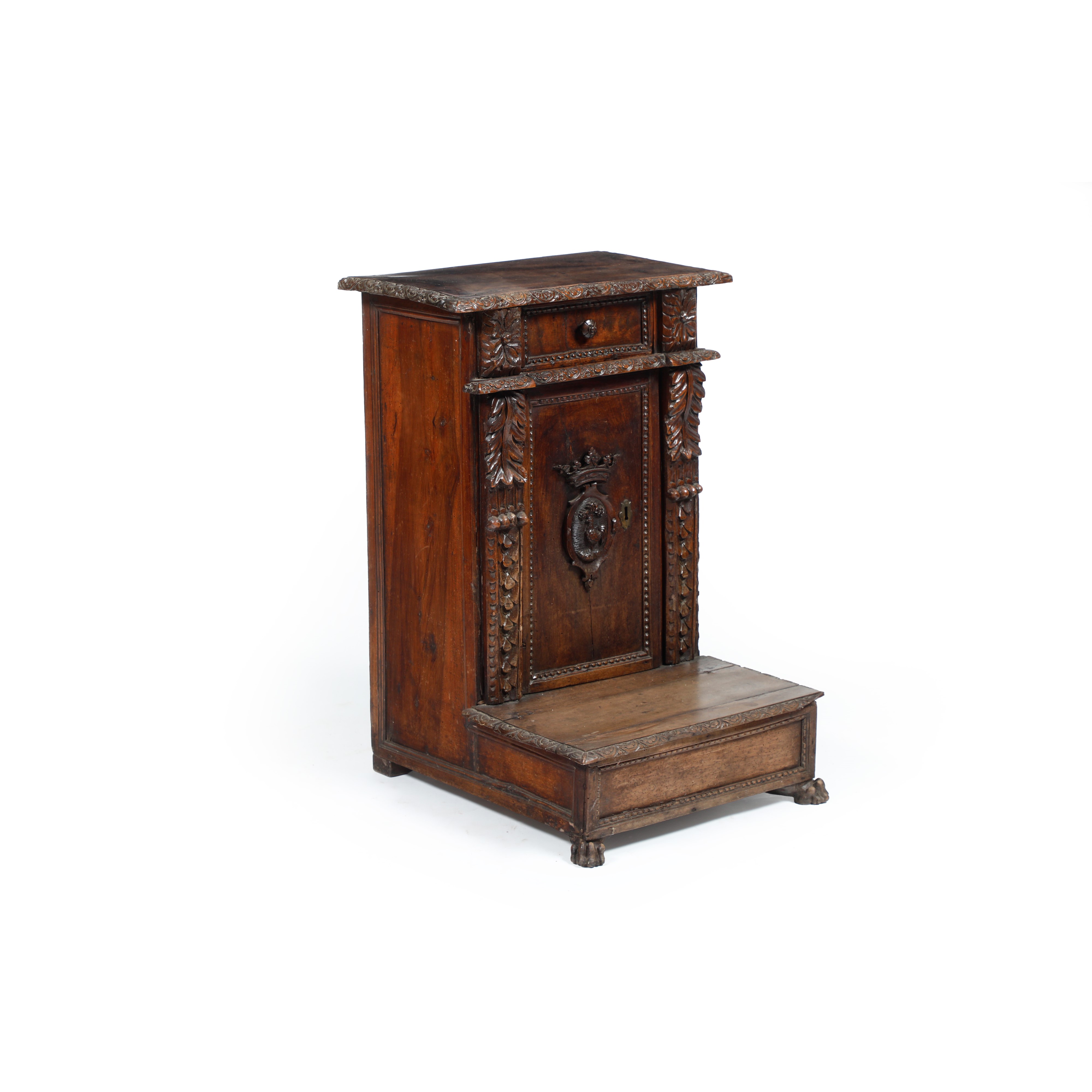 Noce riccamente intagliato a motivi vegetali. Cassetto sottopiano e anta centrata da stemma coronato, piedi ferini