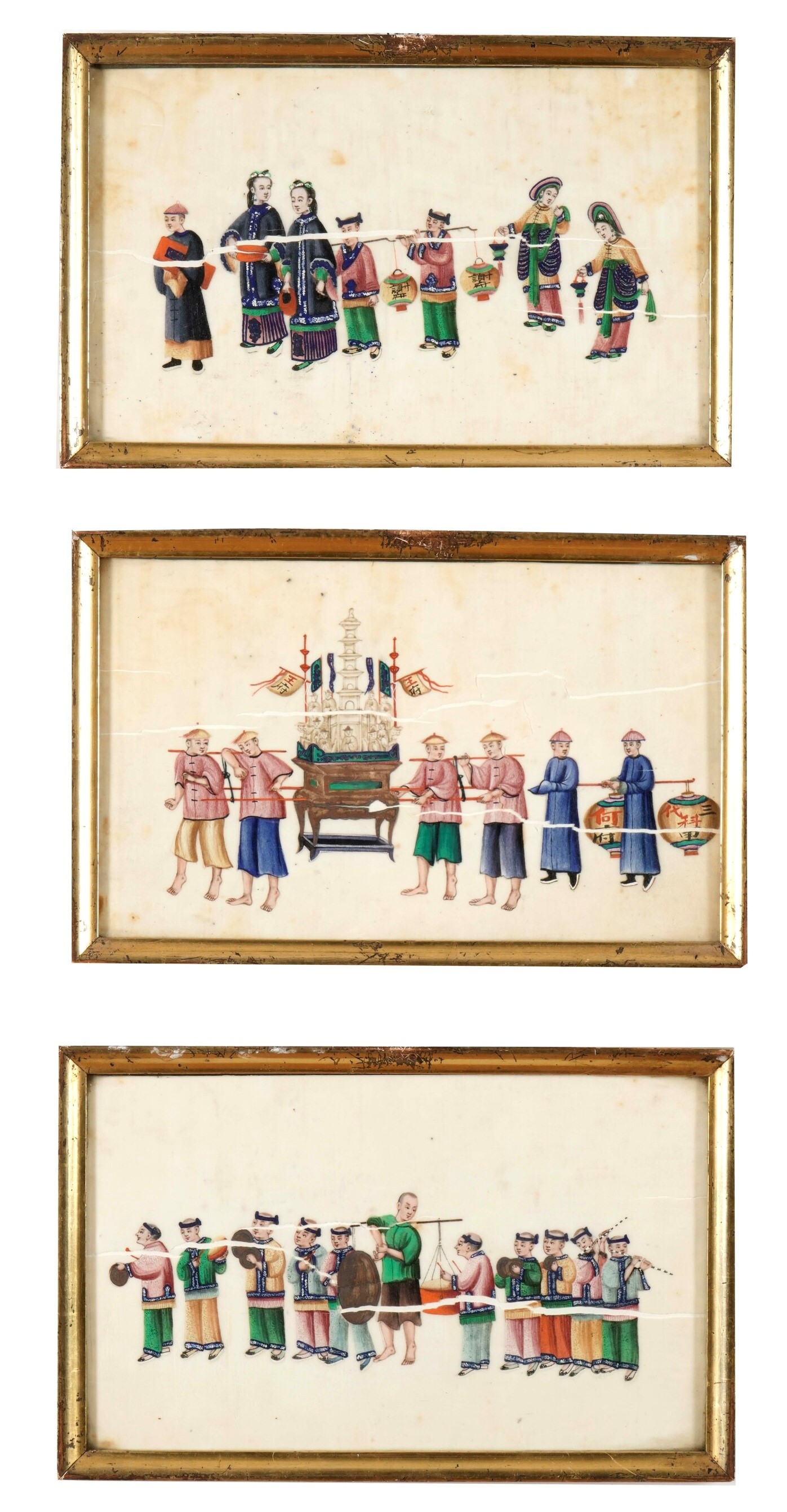 Lotto composto da tre quadretti su carta di riso raffiguranti bambini, Cina XX secolo