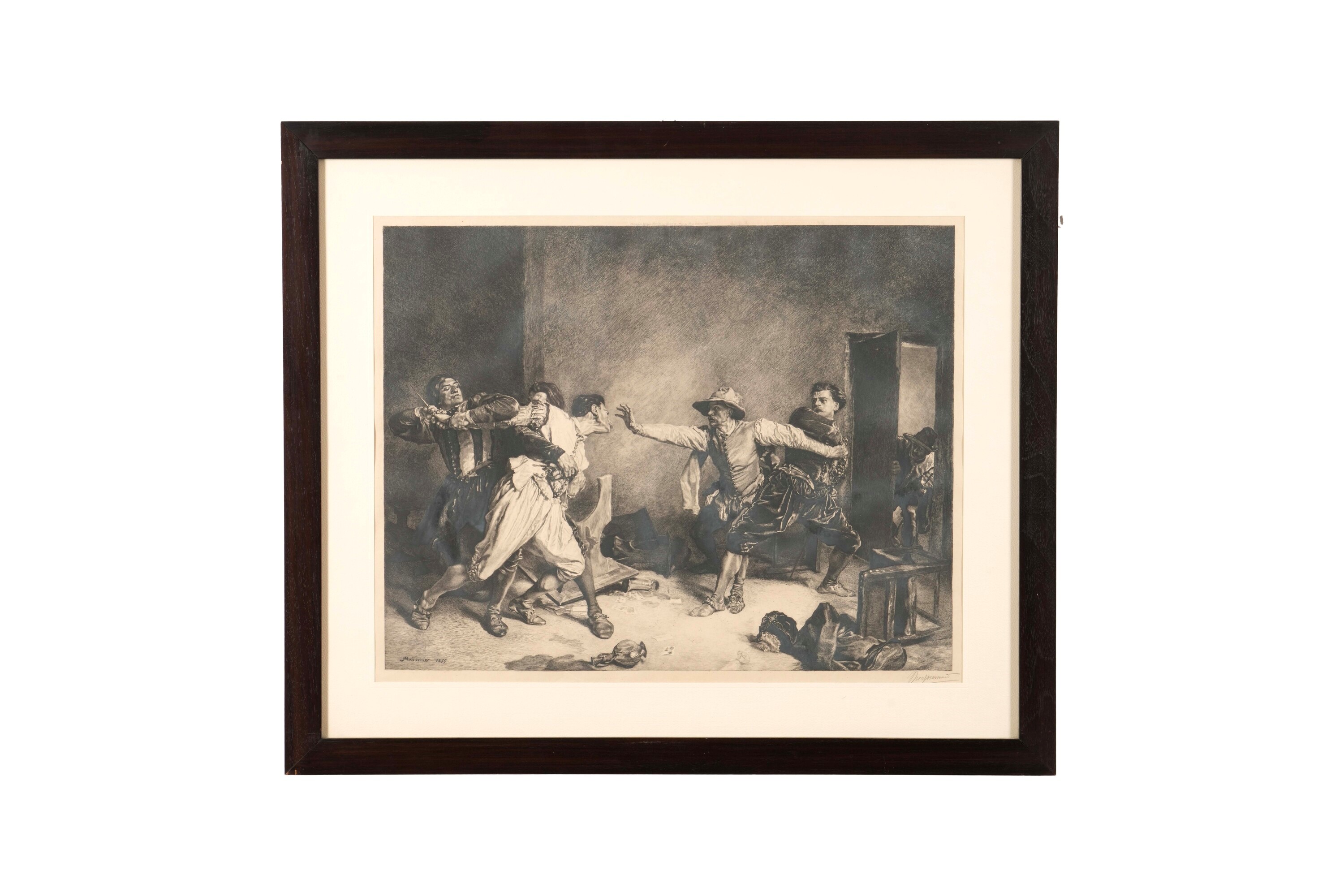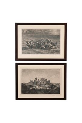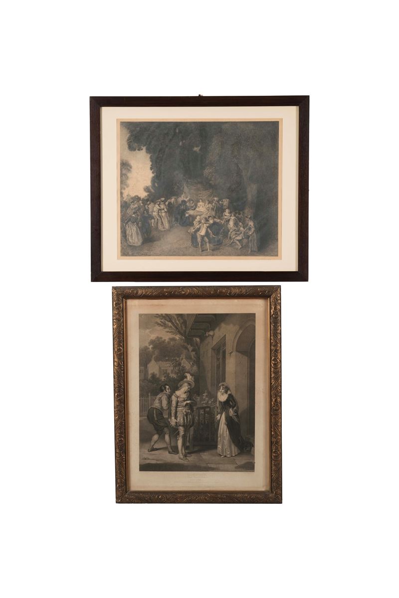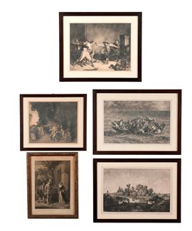 Tecniche differenziate. Il lotto comprende un'incisione di traduzione dalla "Rissa" Meissonier, una dal "naufragio di Don Giovanni" di Delacroix, una paesaggio, una scena galante e una scena di festa. Misure diverse. tutte entro cornici