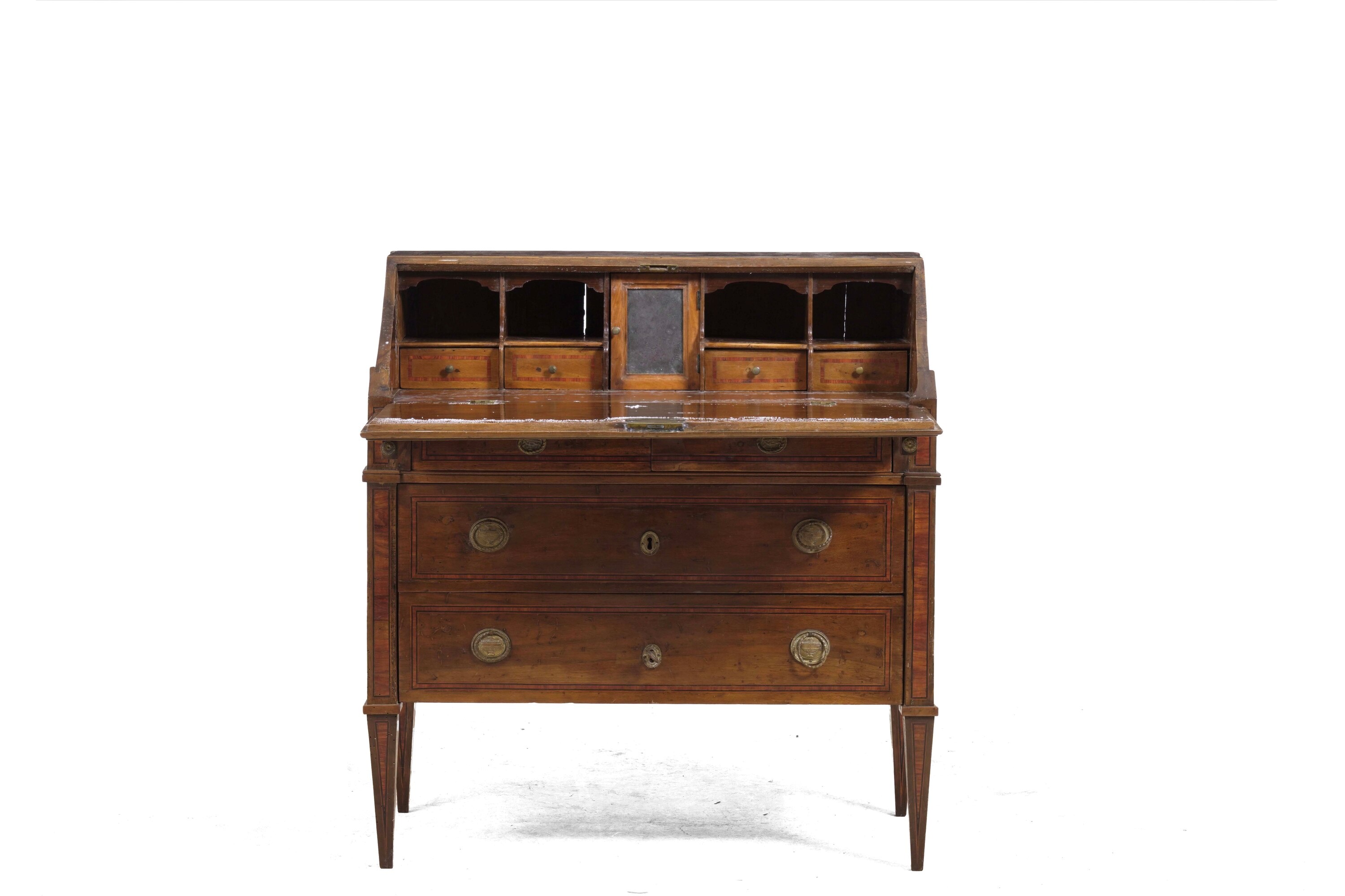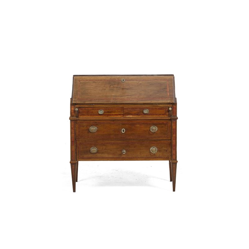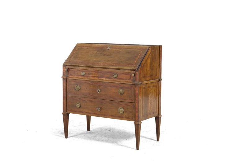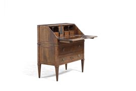 Legno filettato in bois de rose. Fronte a due cassetti e due cassettini affiancati, ribalta che cela scarabattolo, piedi rastremati