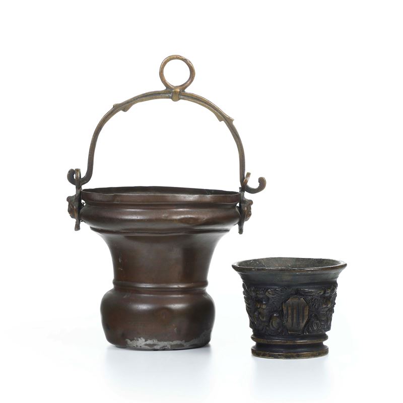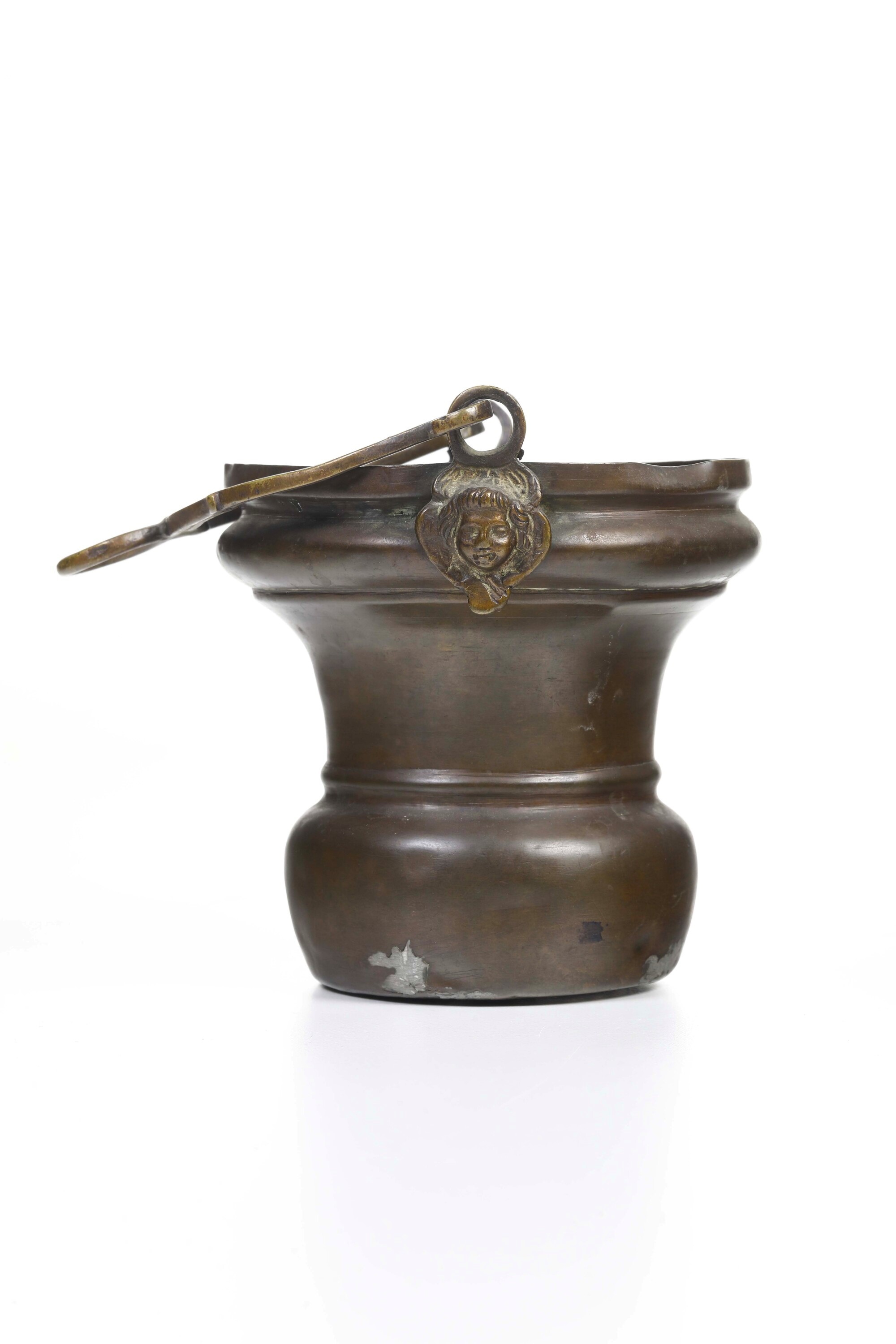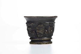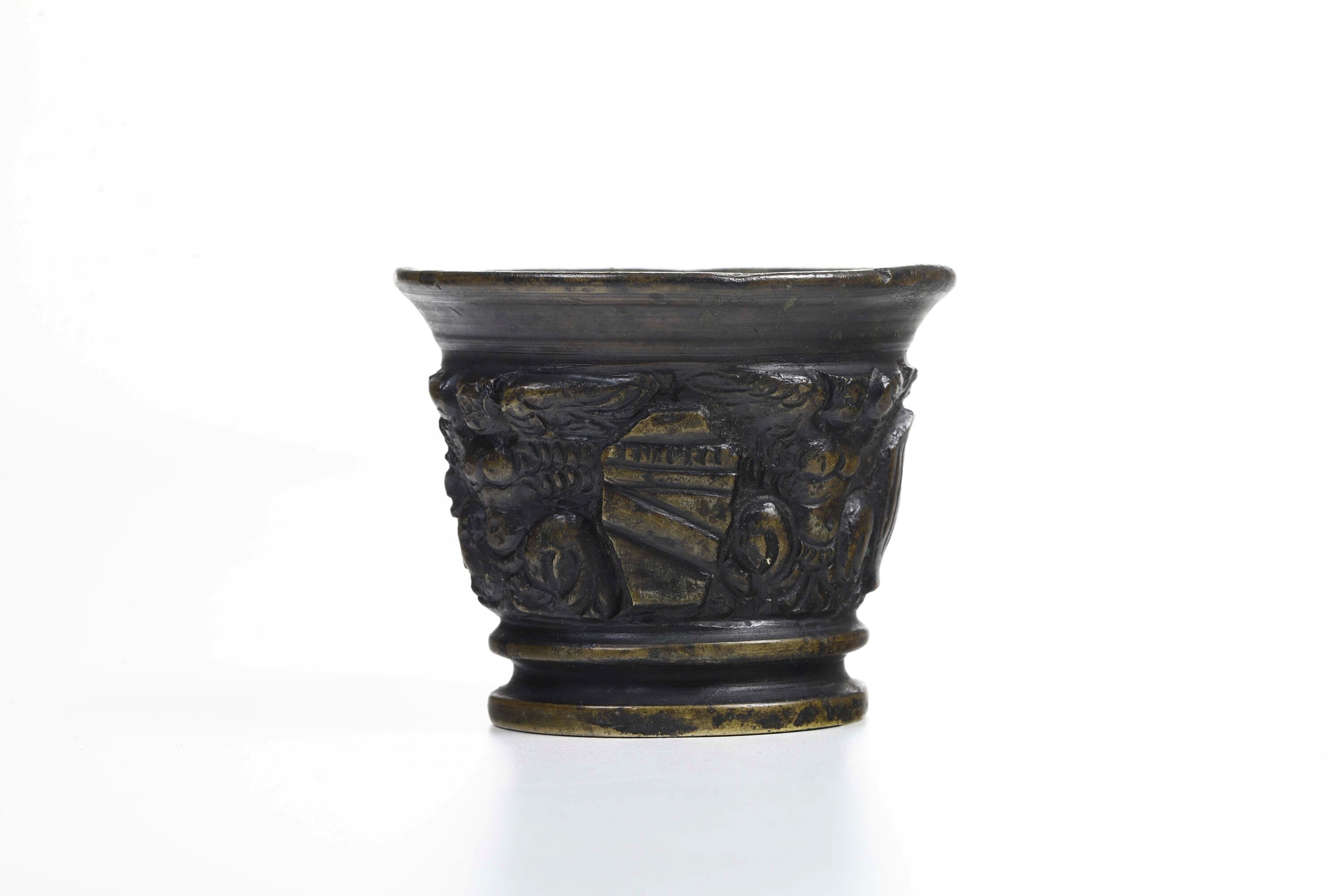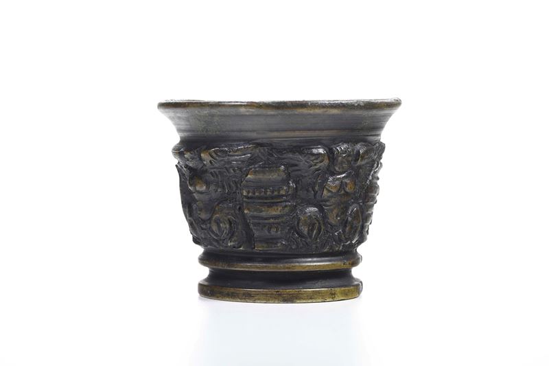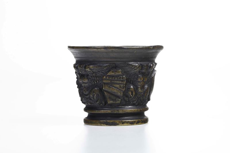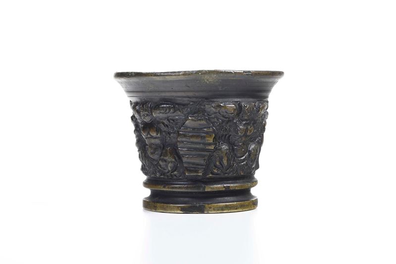 Mortaio riccamente decorato a rilievo con stemma centrale